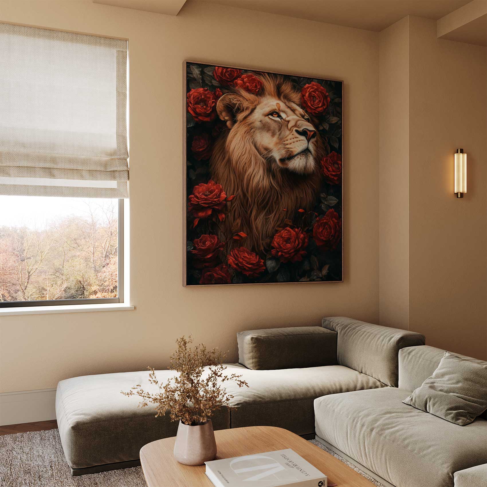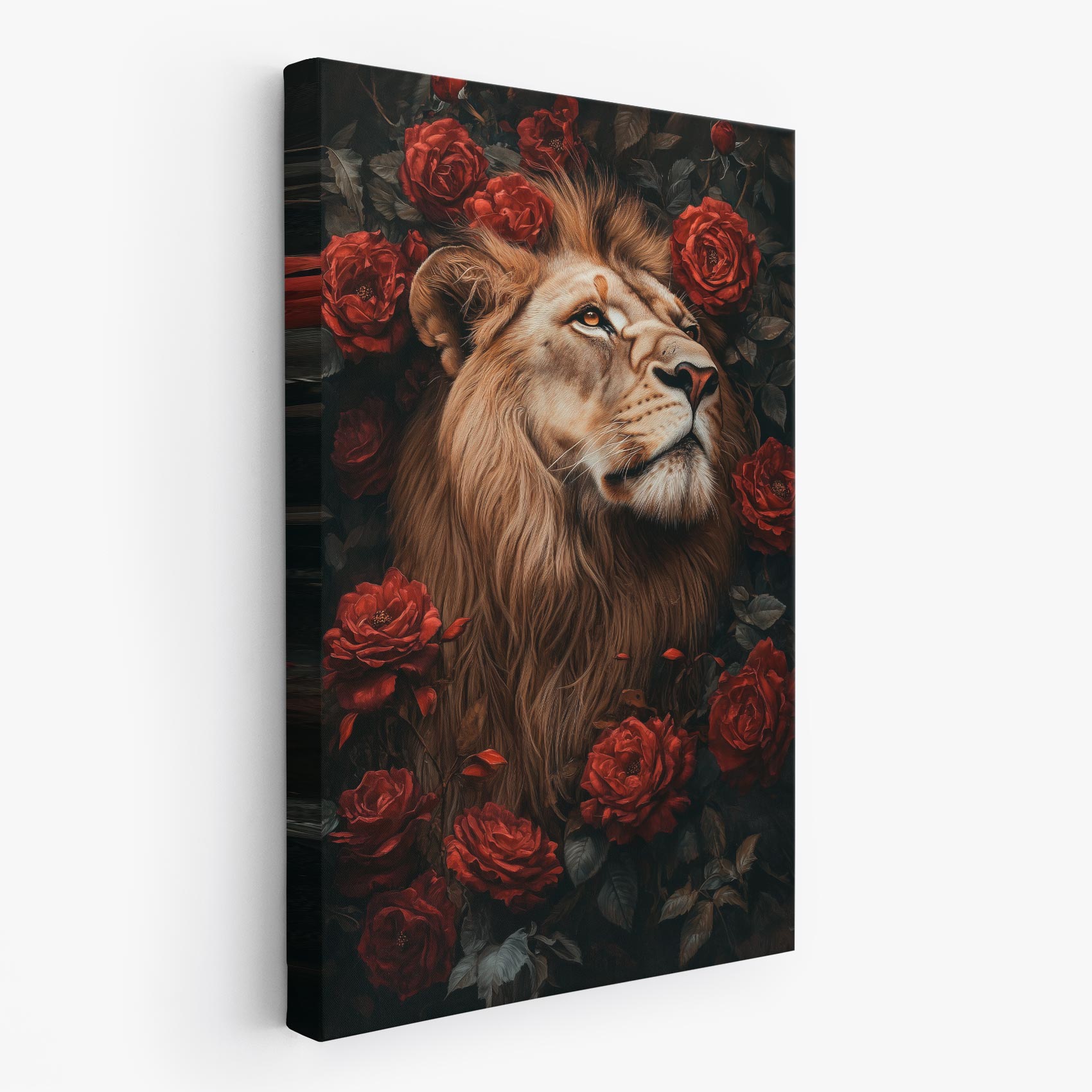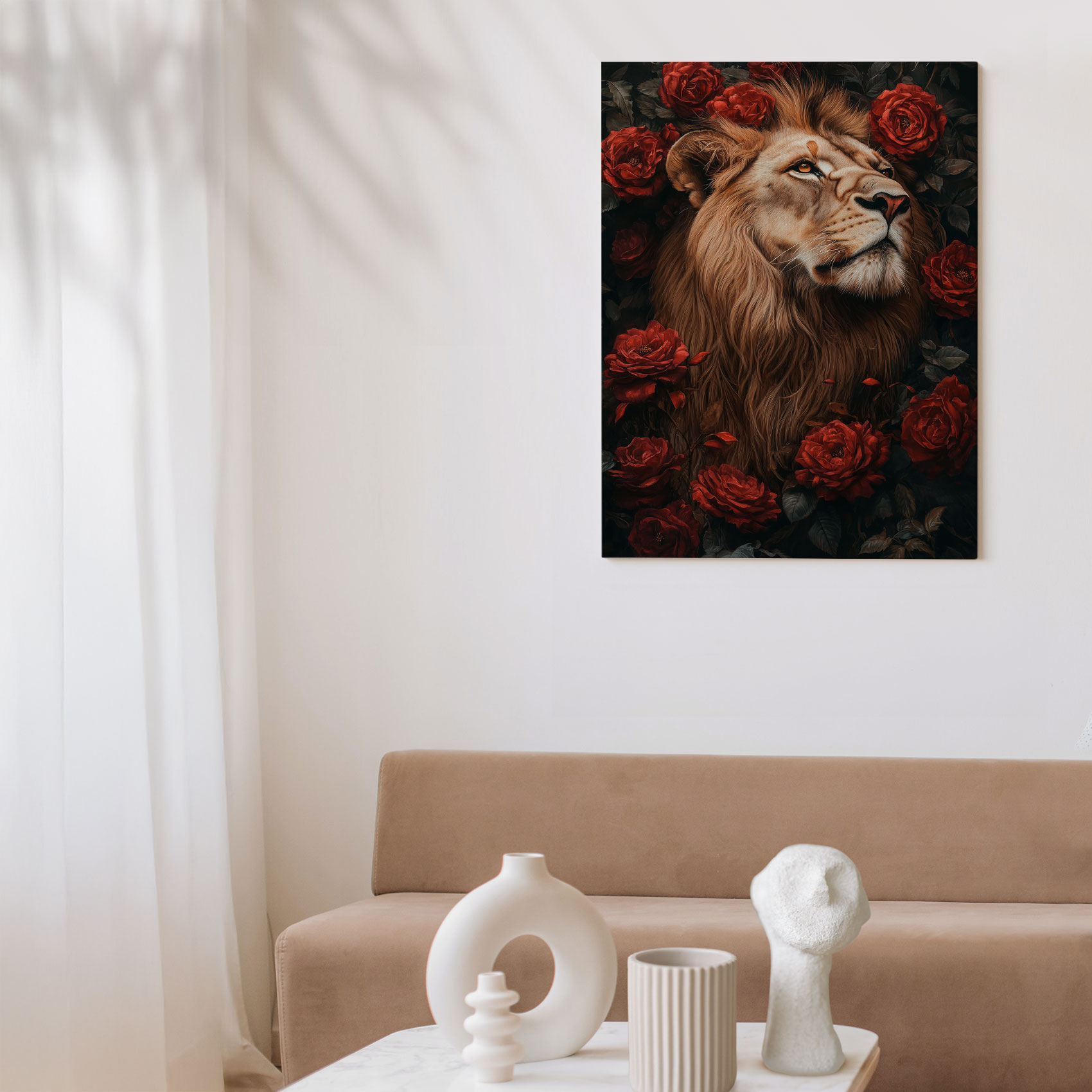 Terug naar collectie / Schilderijen / Bloemen Schilderij / Gouden leeuw tussen rode rozen