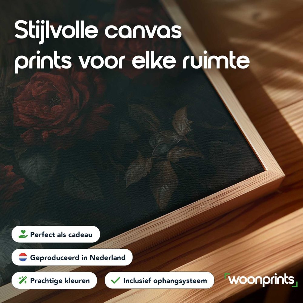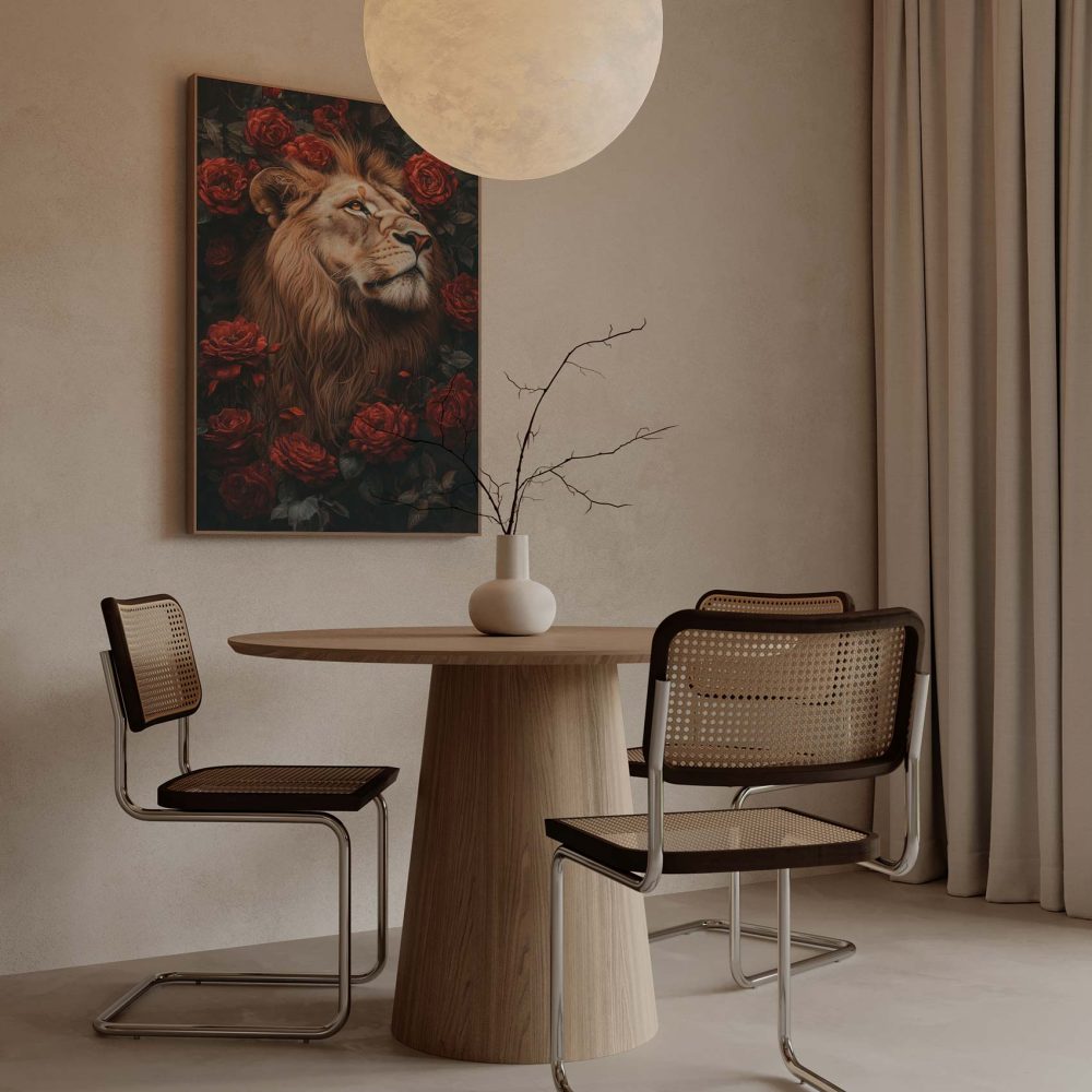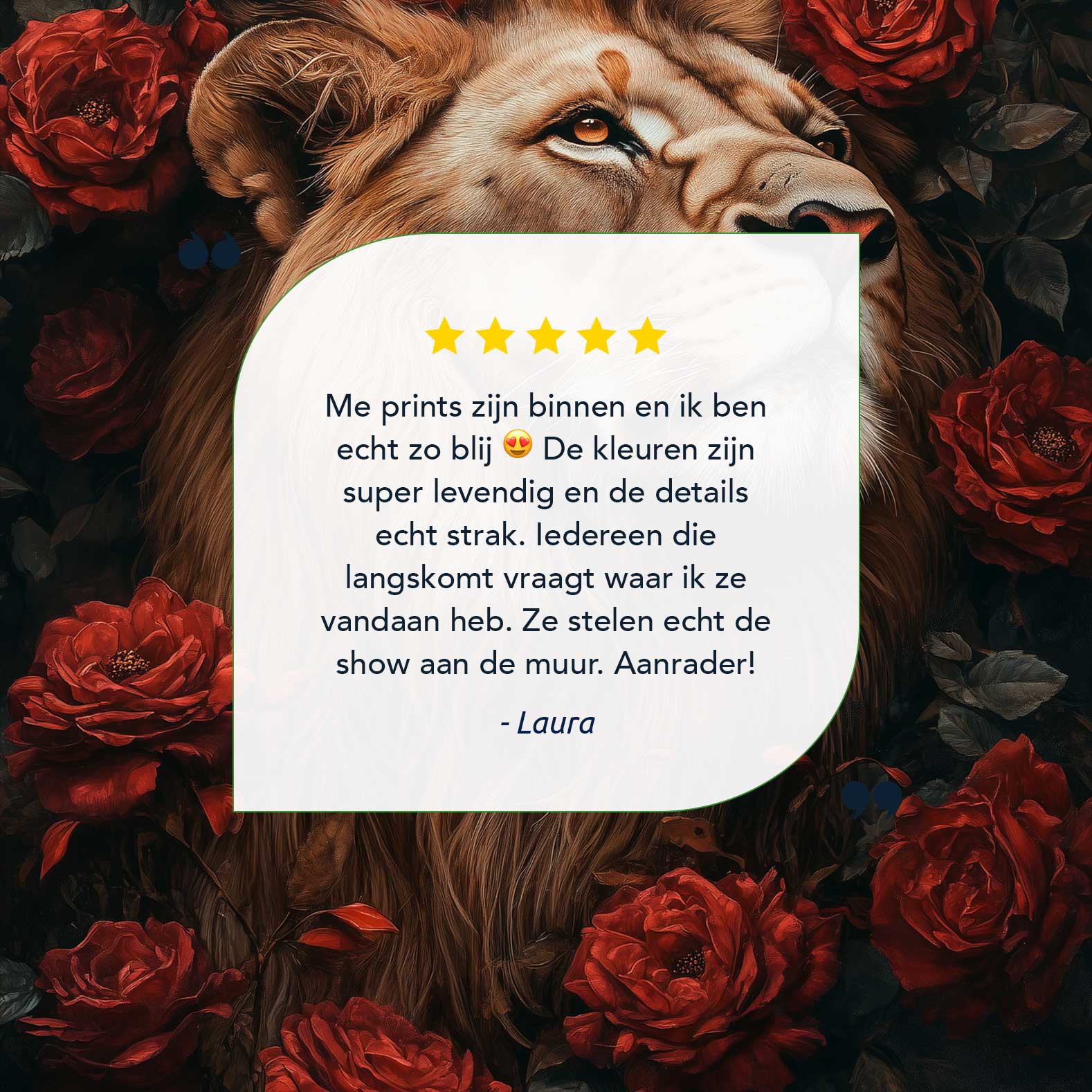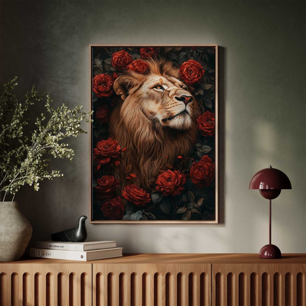 Terug naar collectie / Schilderijen / Bloemen Schilderij / Gouden leeuw tussen rode rozen