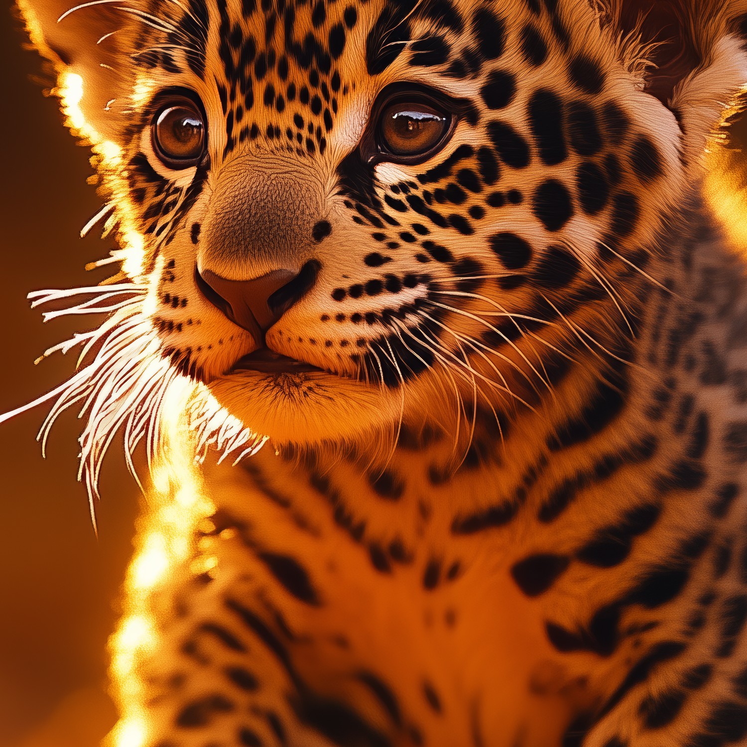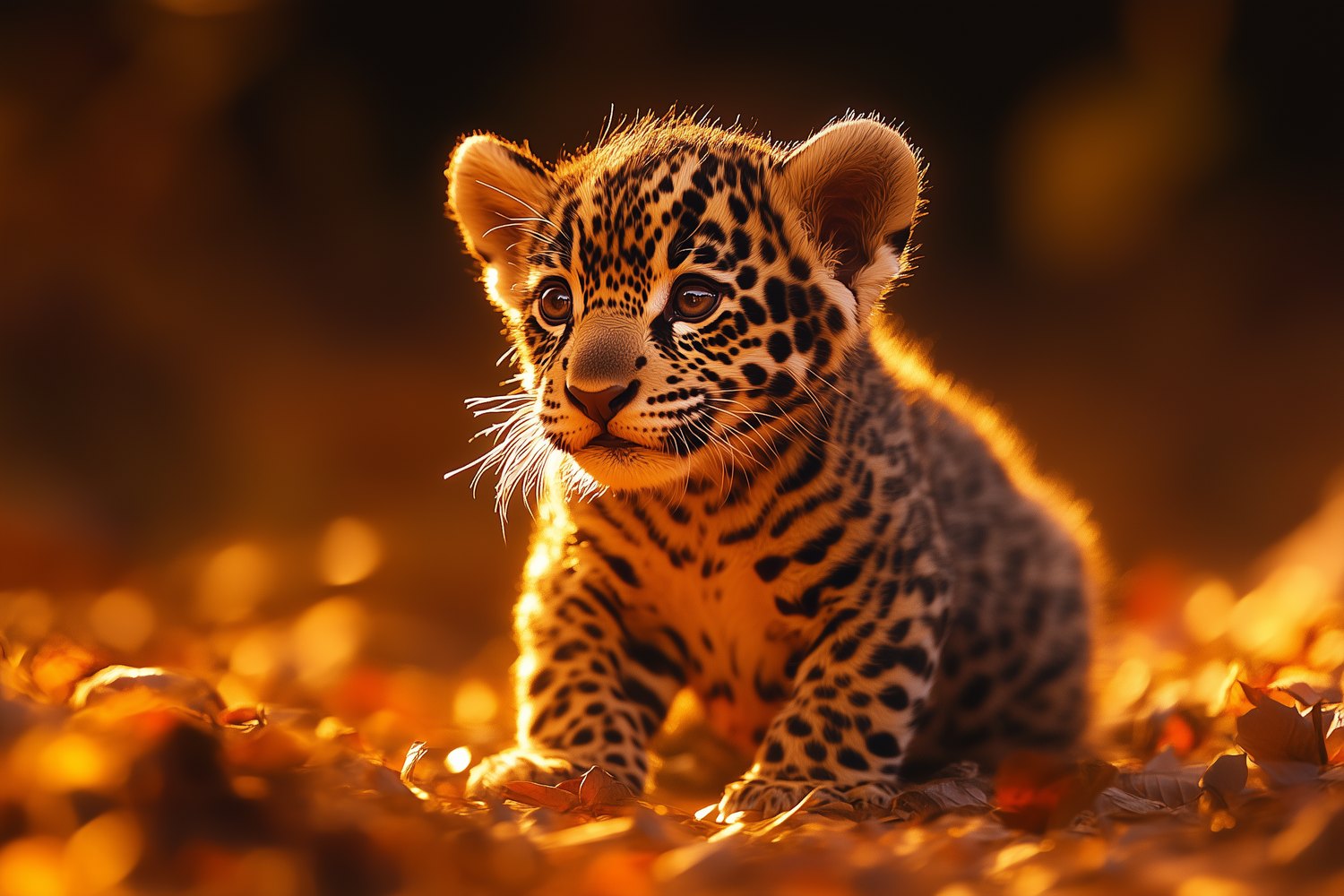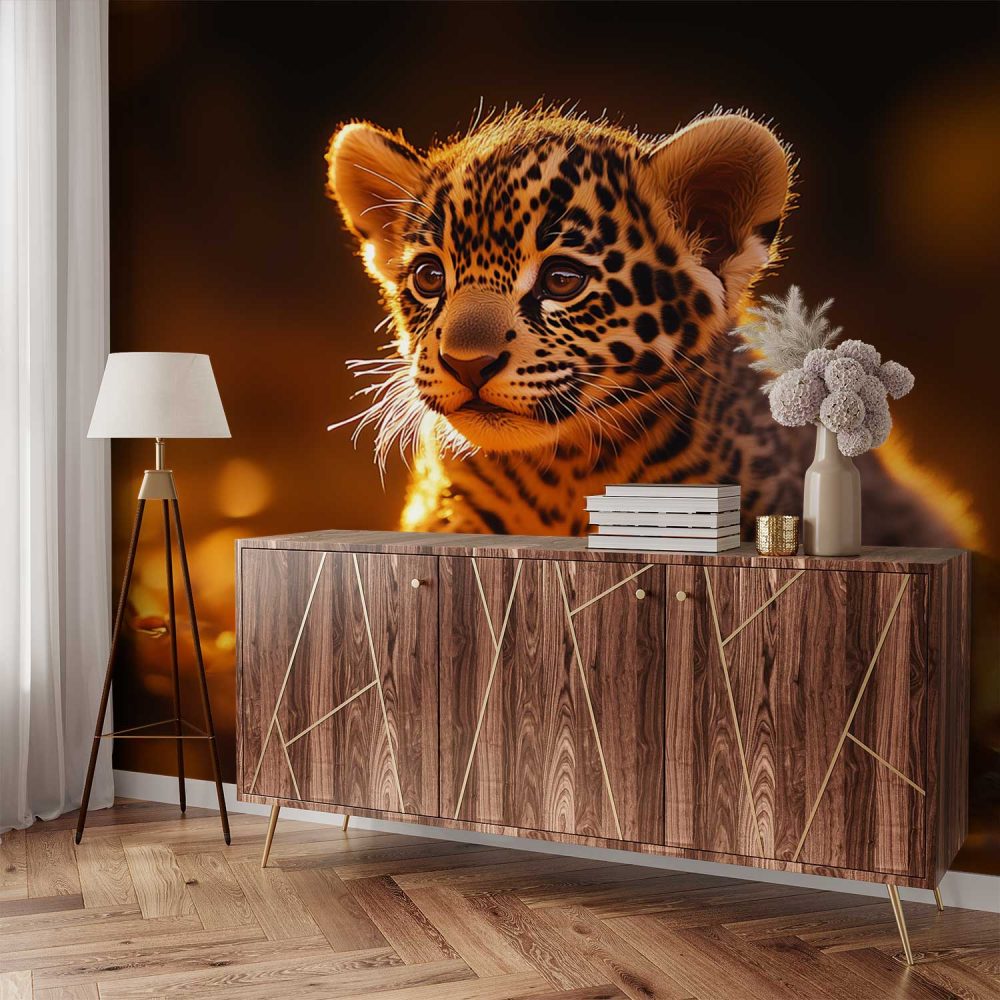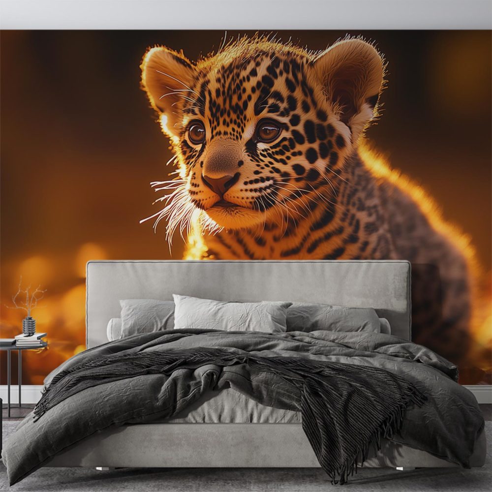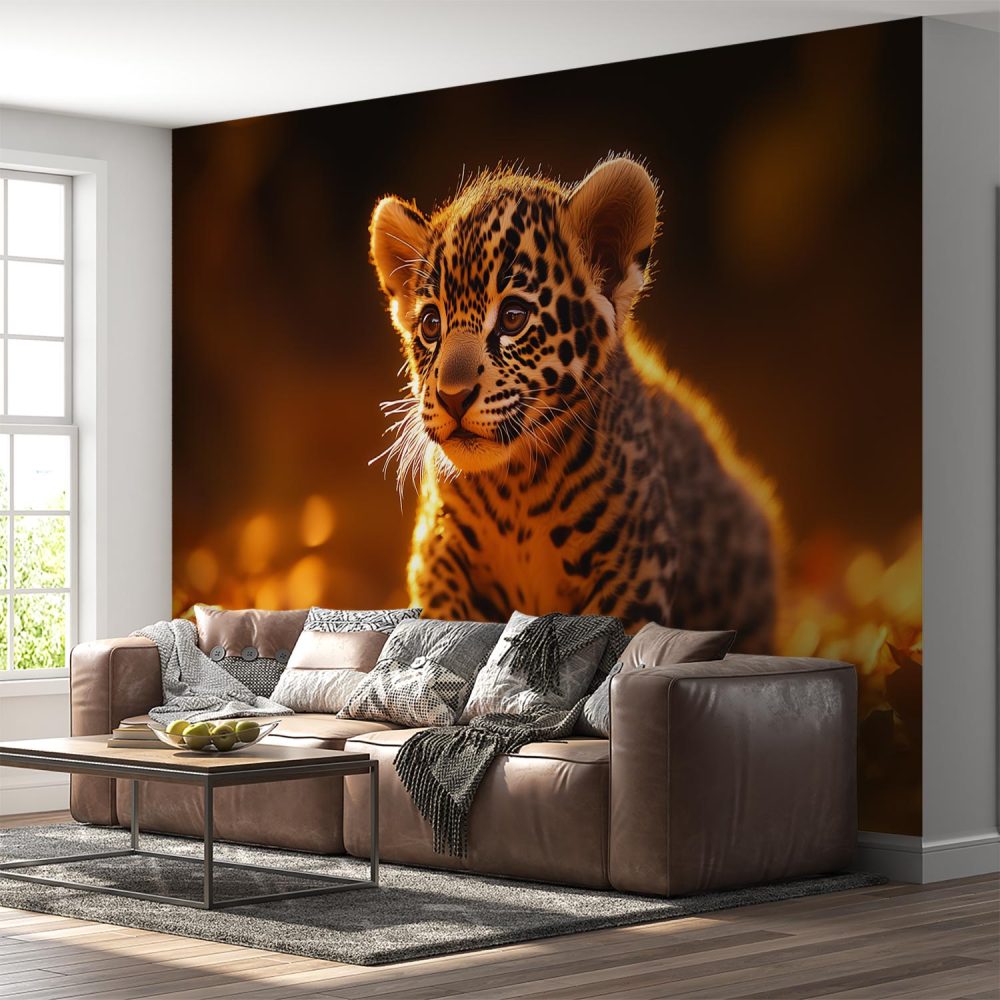 Terug naar collectie / Behang / Gouden Luipaardwelp in Bladeren behang