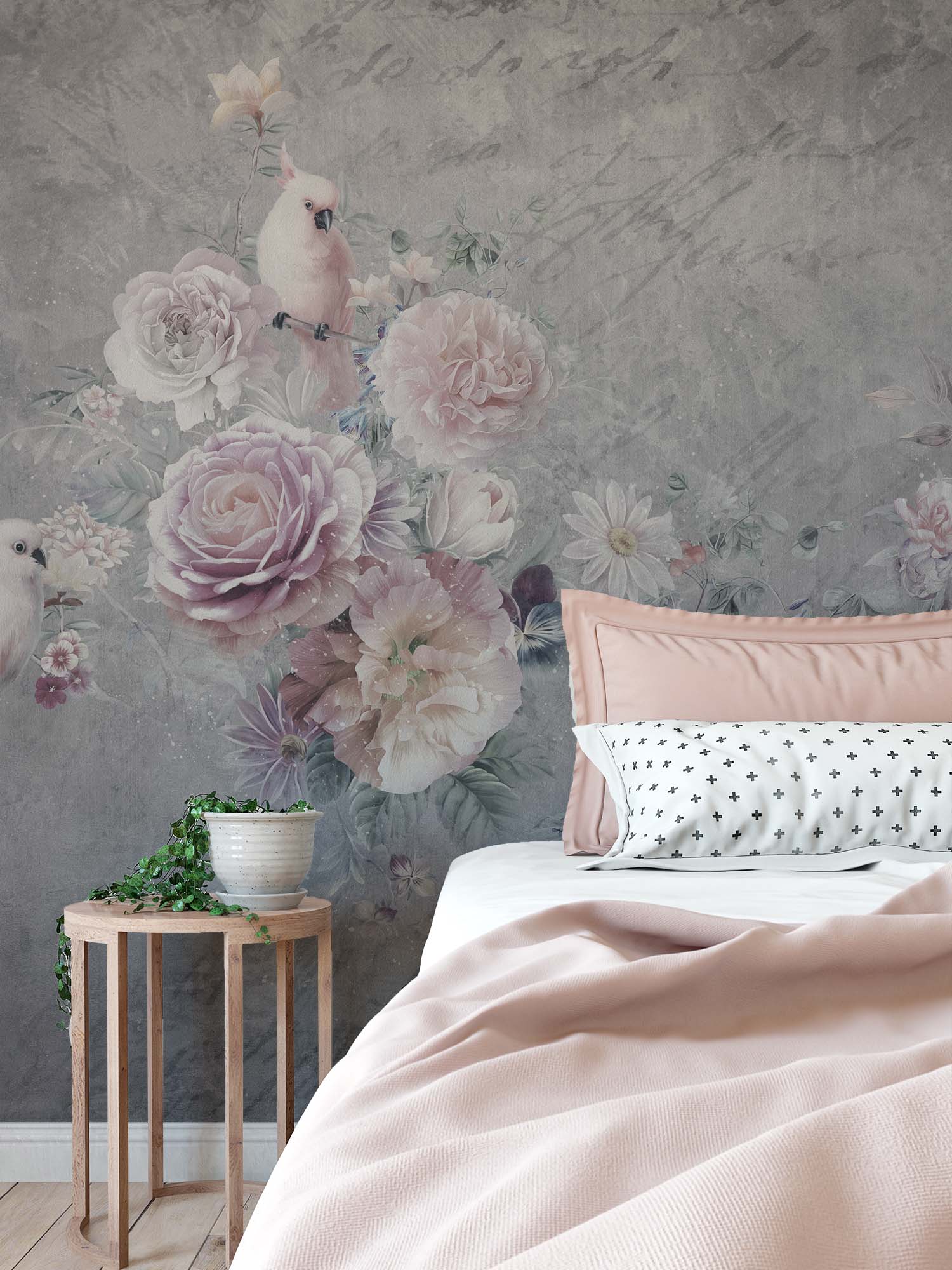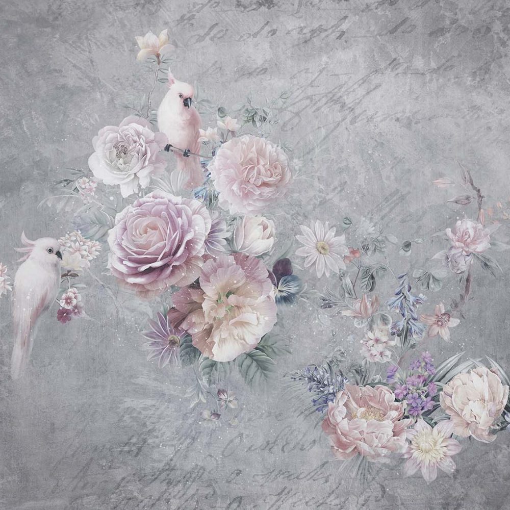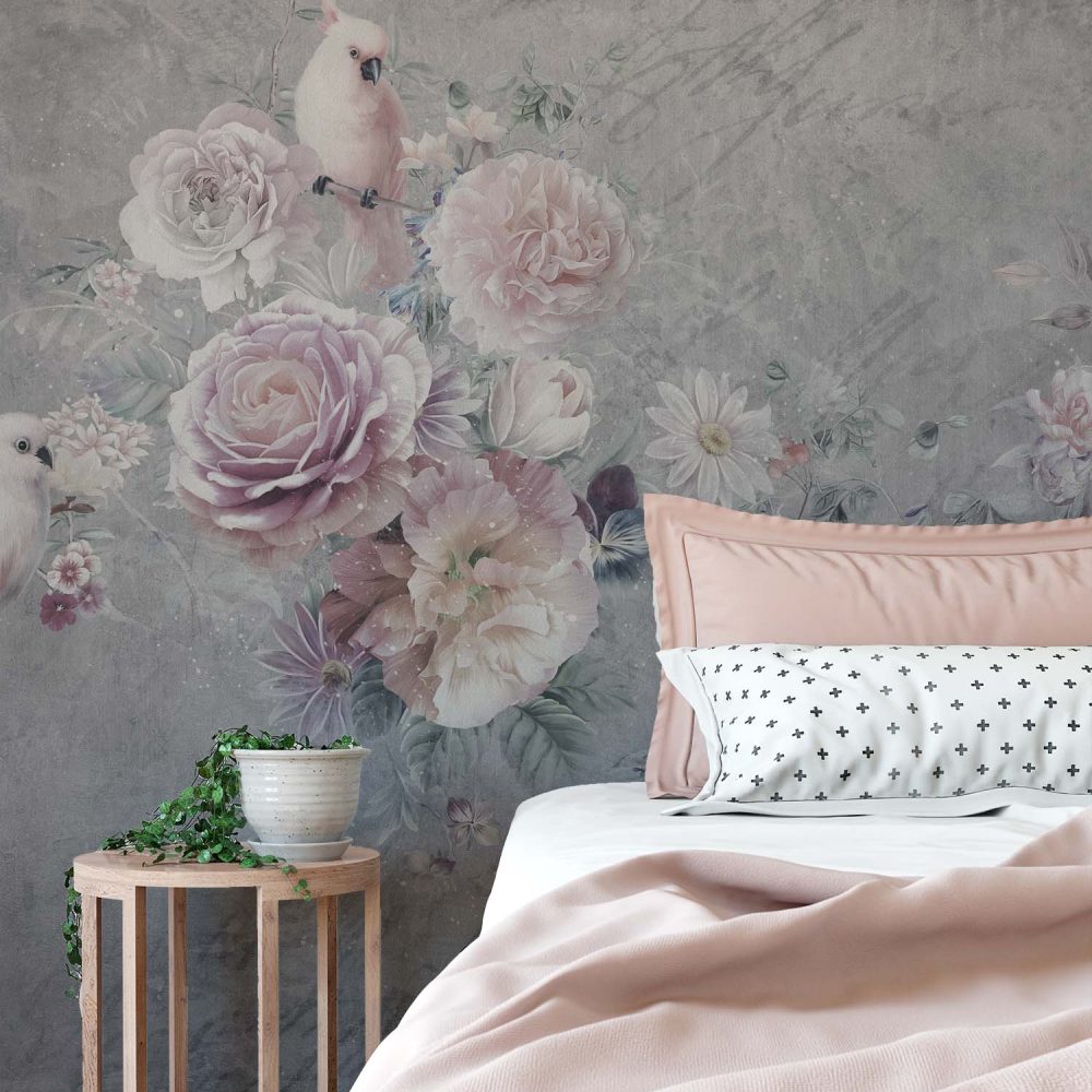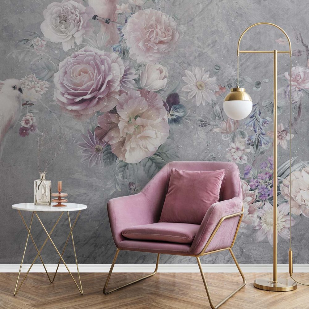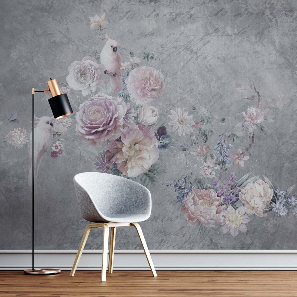 Grijs Bloemen Behang met Paarse Roos