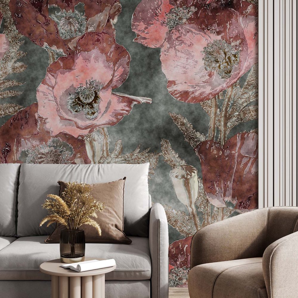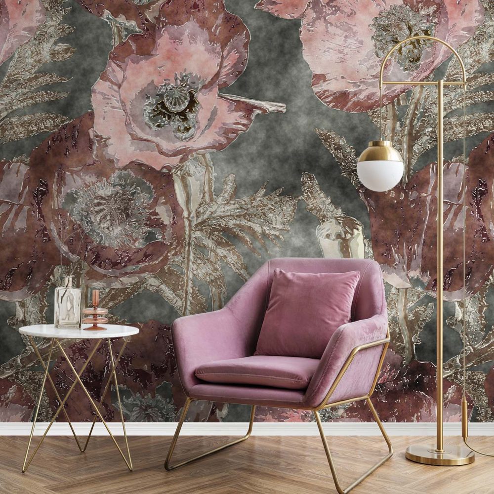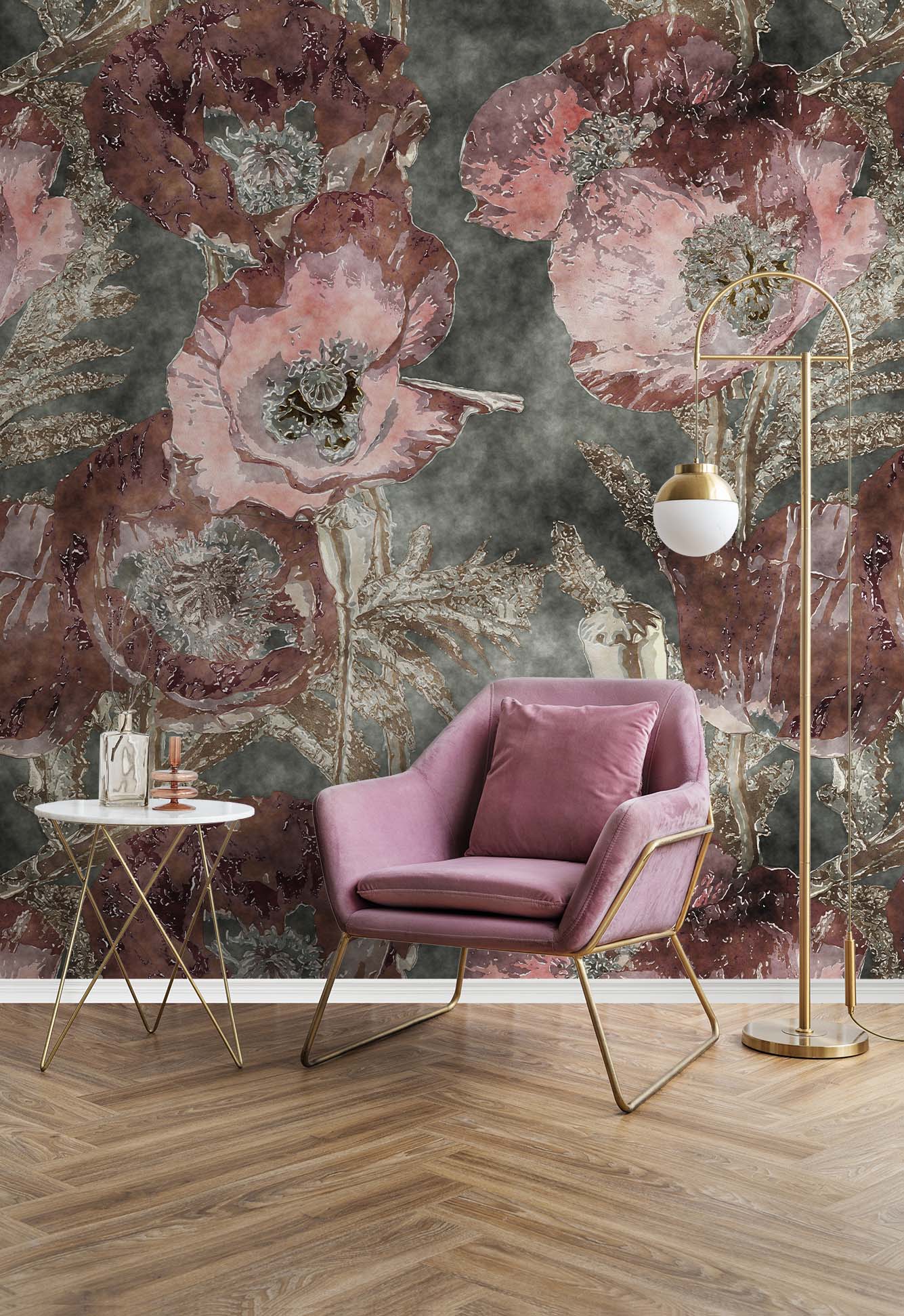 Terug naar collectie / Behang / Grijs Bloemen Behang met Roze Accenten
