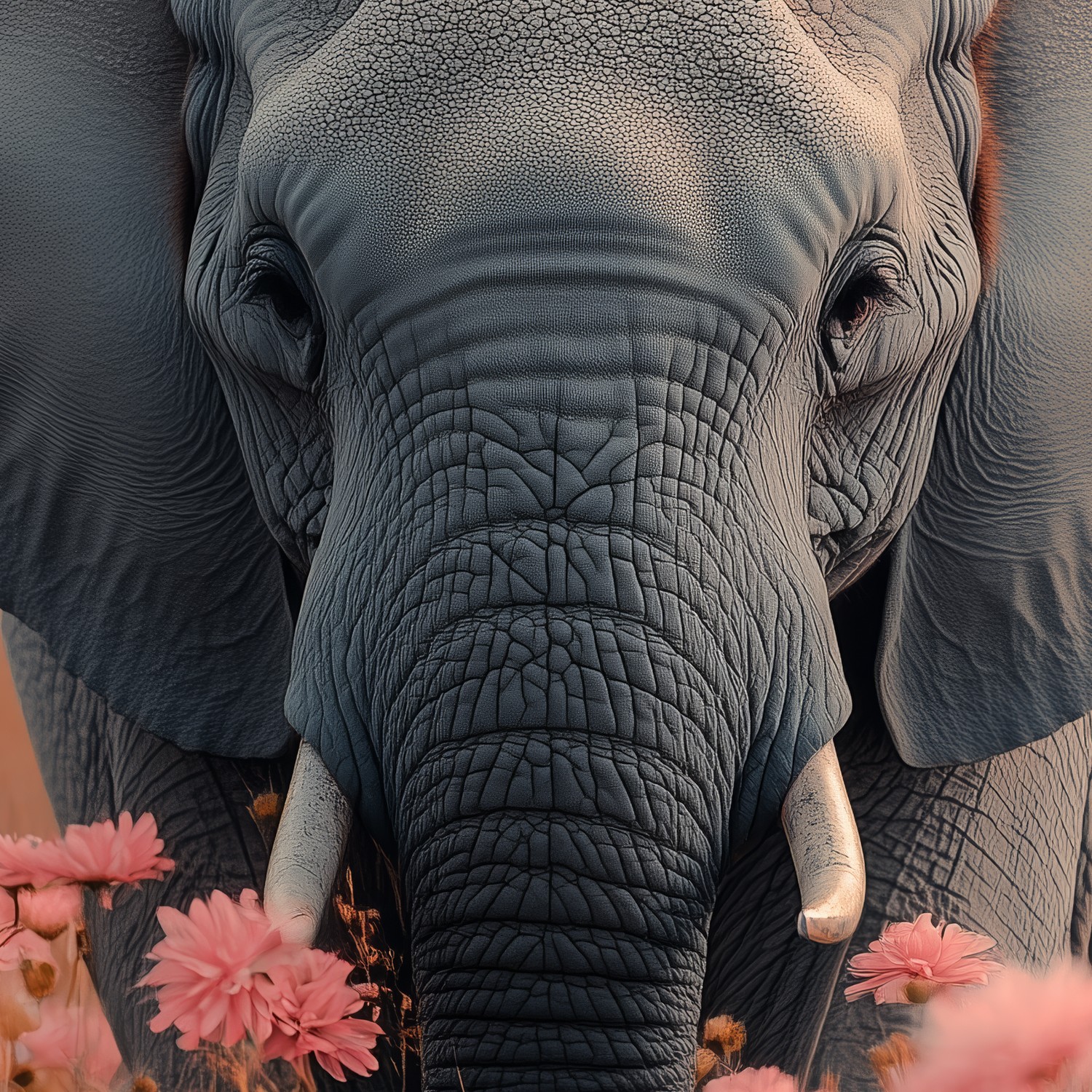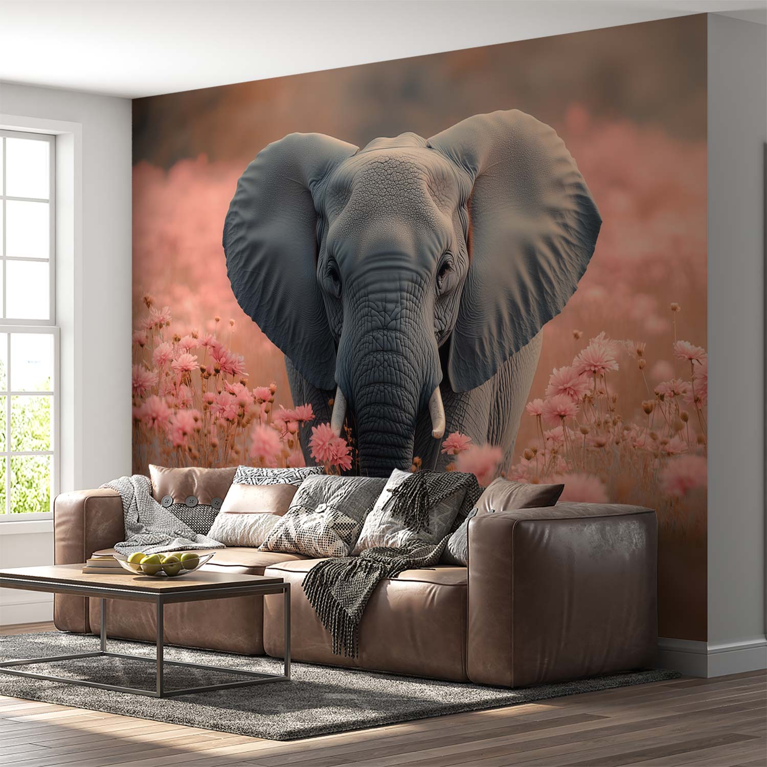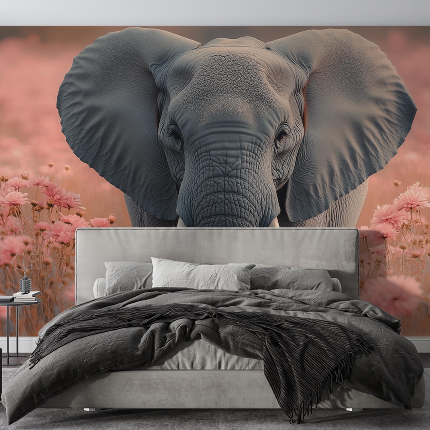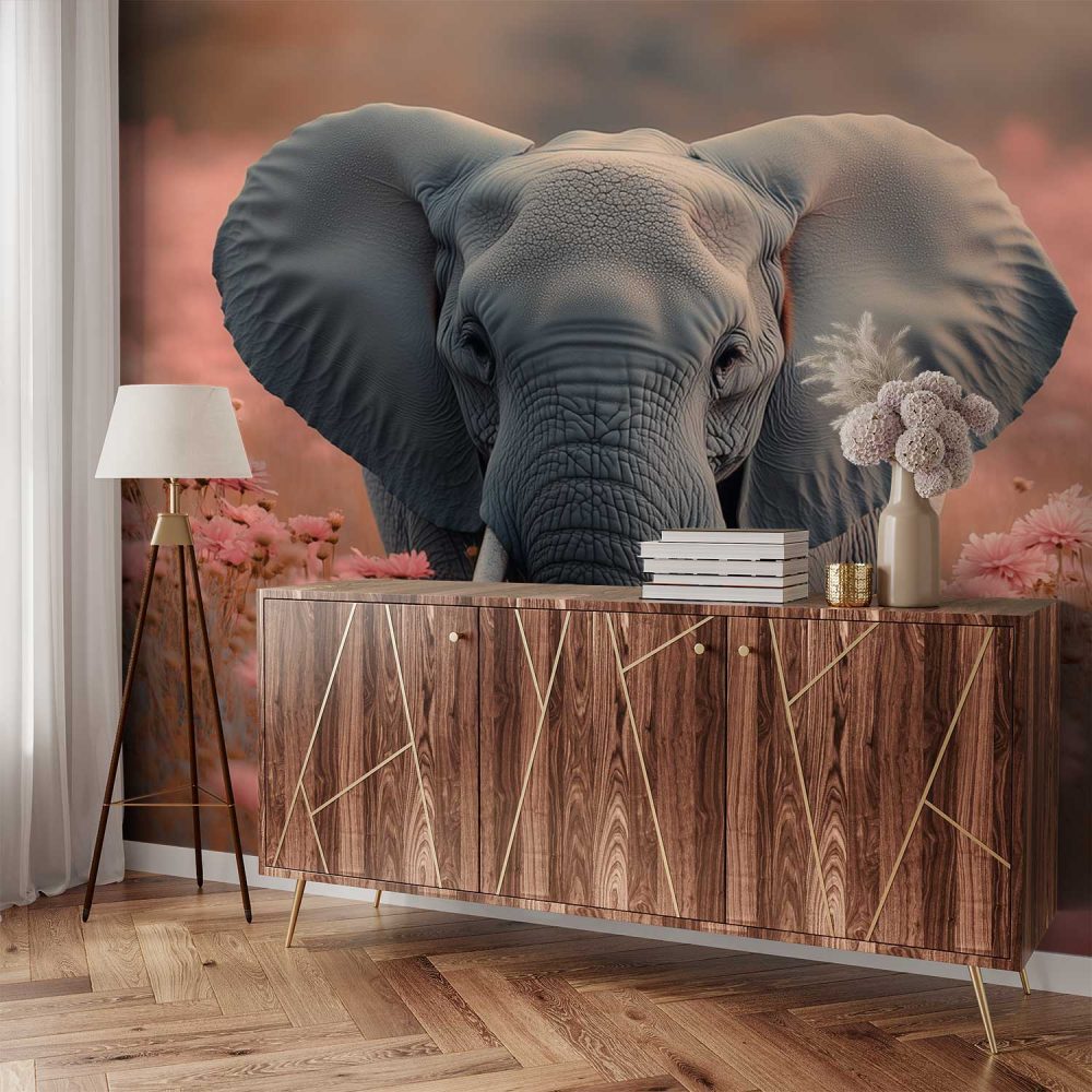 Terug naar collectie / Behang / Grijze olifant in roze bloemen behang