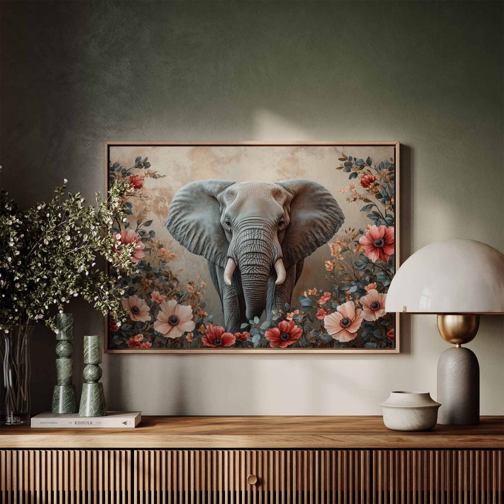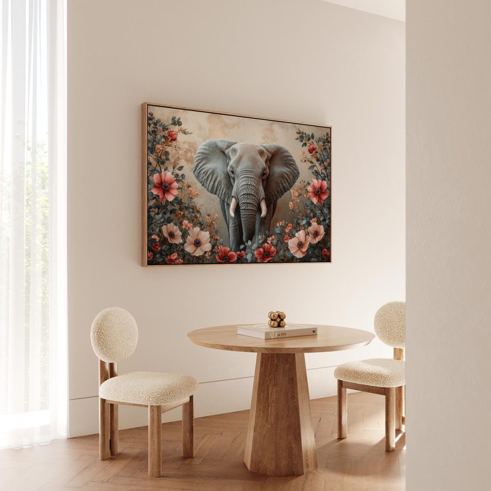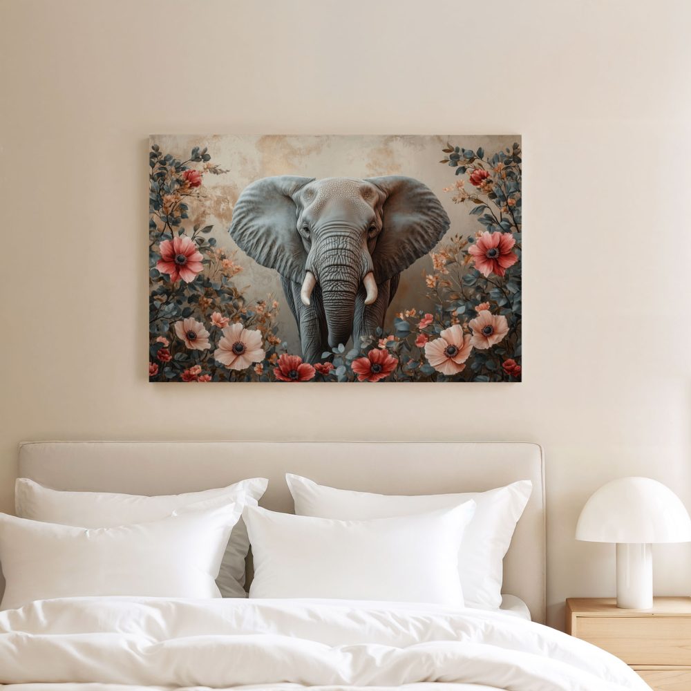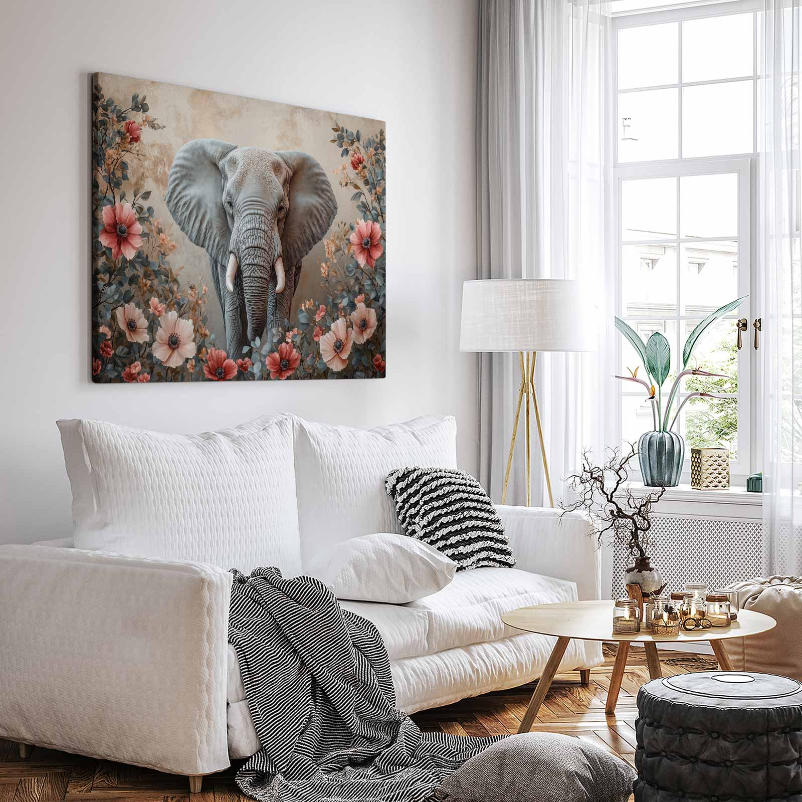 Terug naar collectie / Schilderijen / Bloemen Schilderij / Grijze olifant tussen bloemenpracht