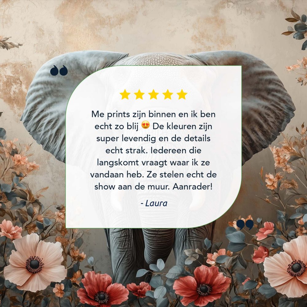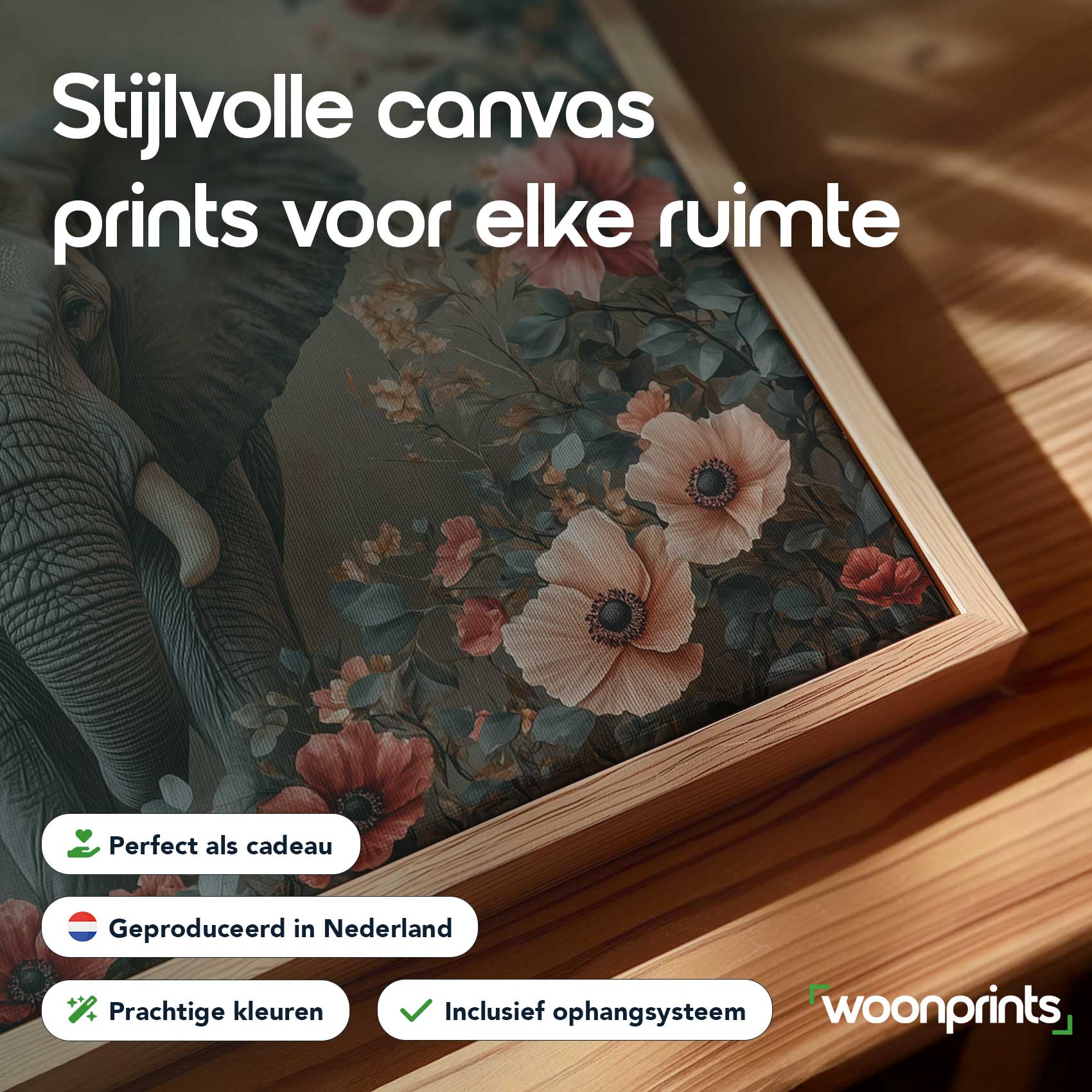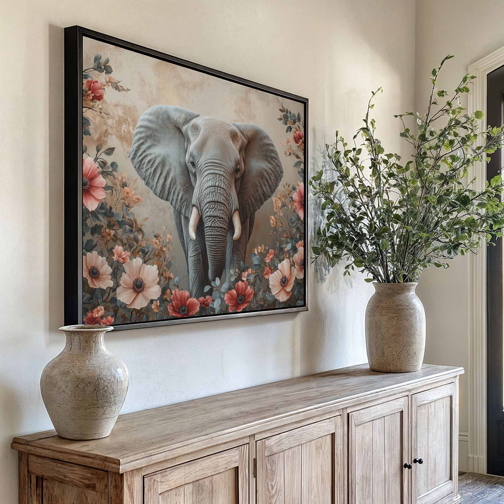 Terug naar collectie / Schilderijen / Bloemen Schilderij / Grijze olifant tussen bloemenpracht