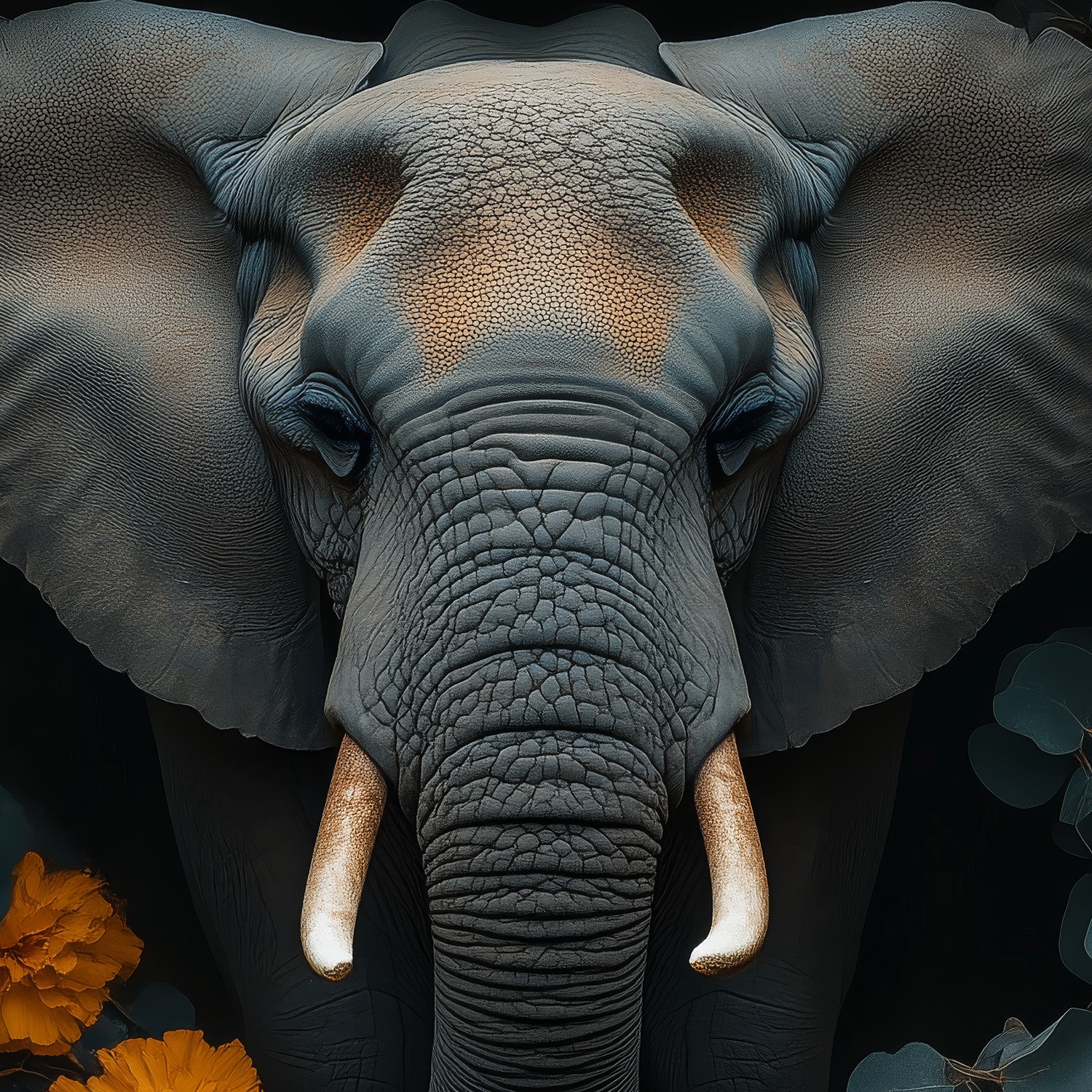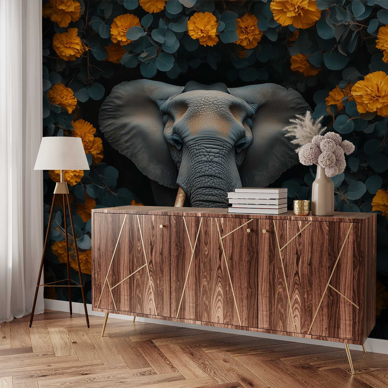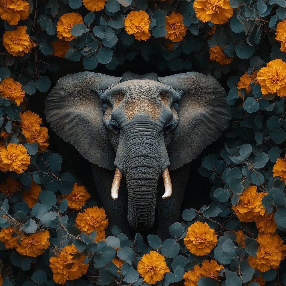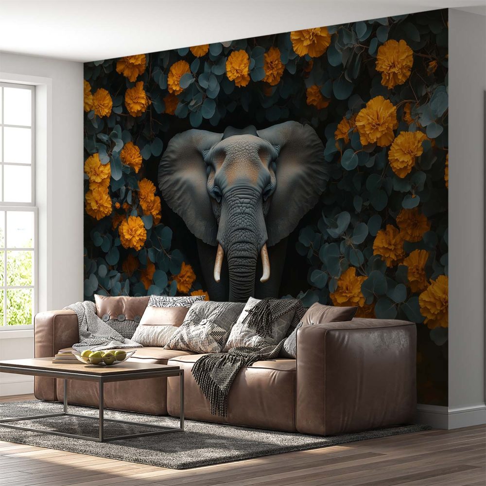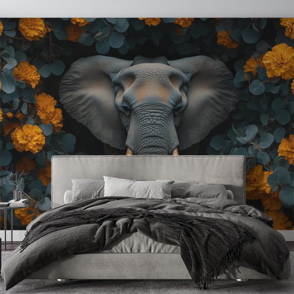 Grijze olifant tussen oranje bloemen behang