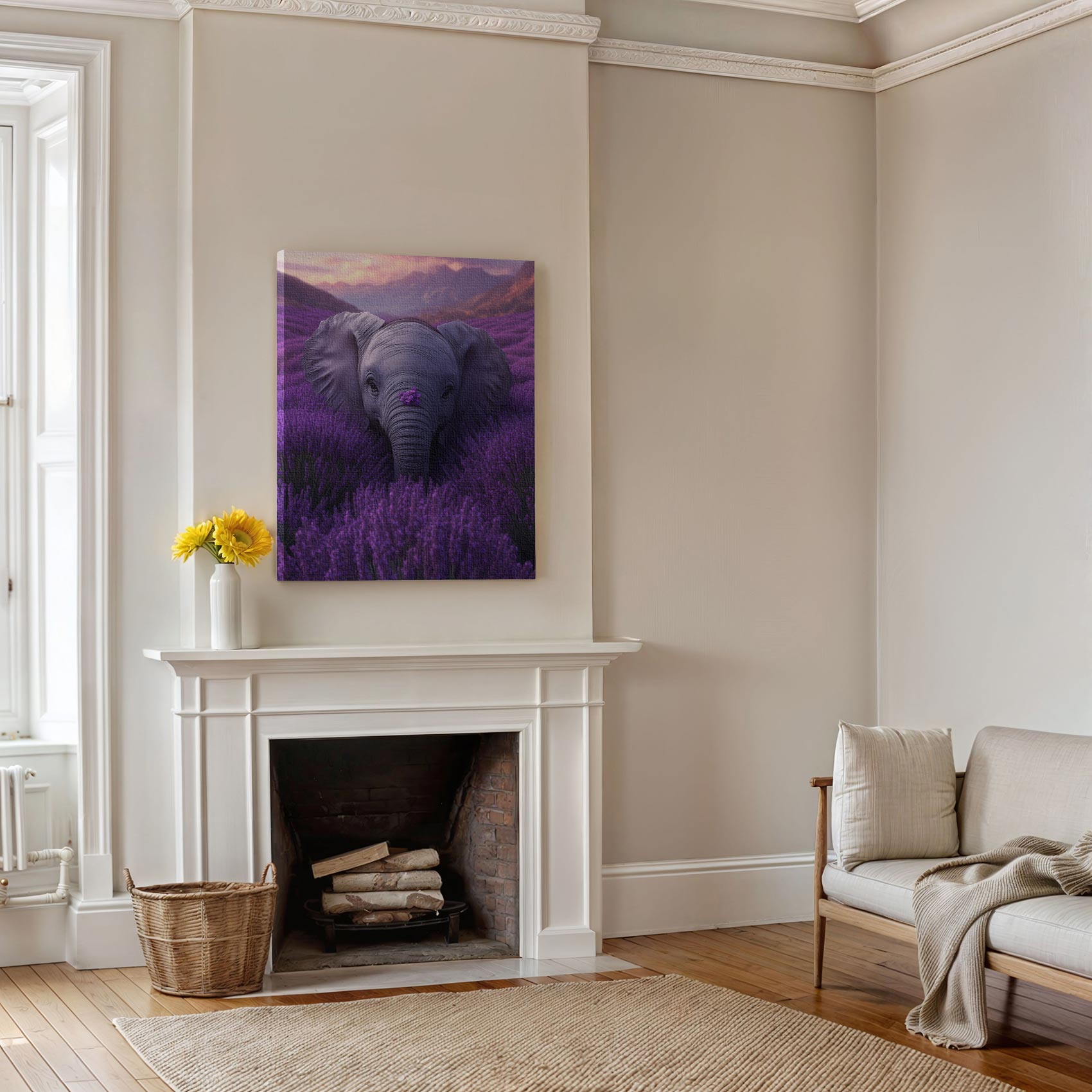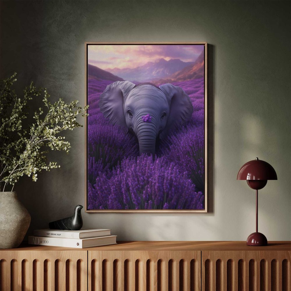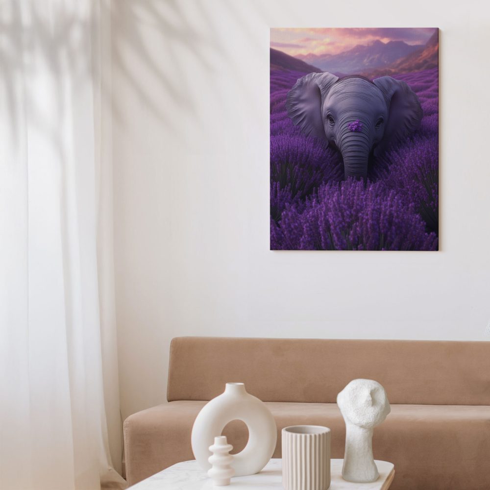 Terug naar collectie / Schilderijen / Bergen Schilderij / Grijze olifant tussen paarse bloemen