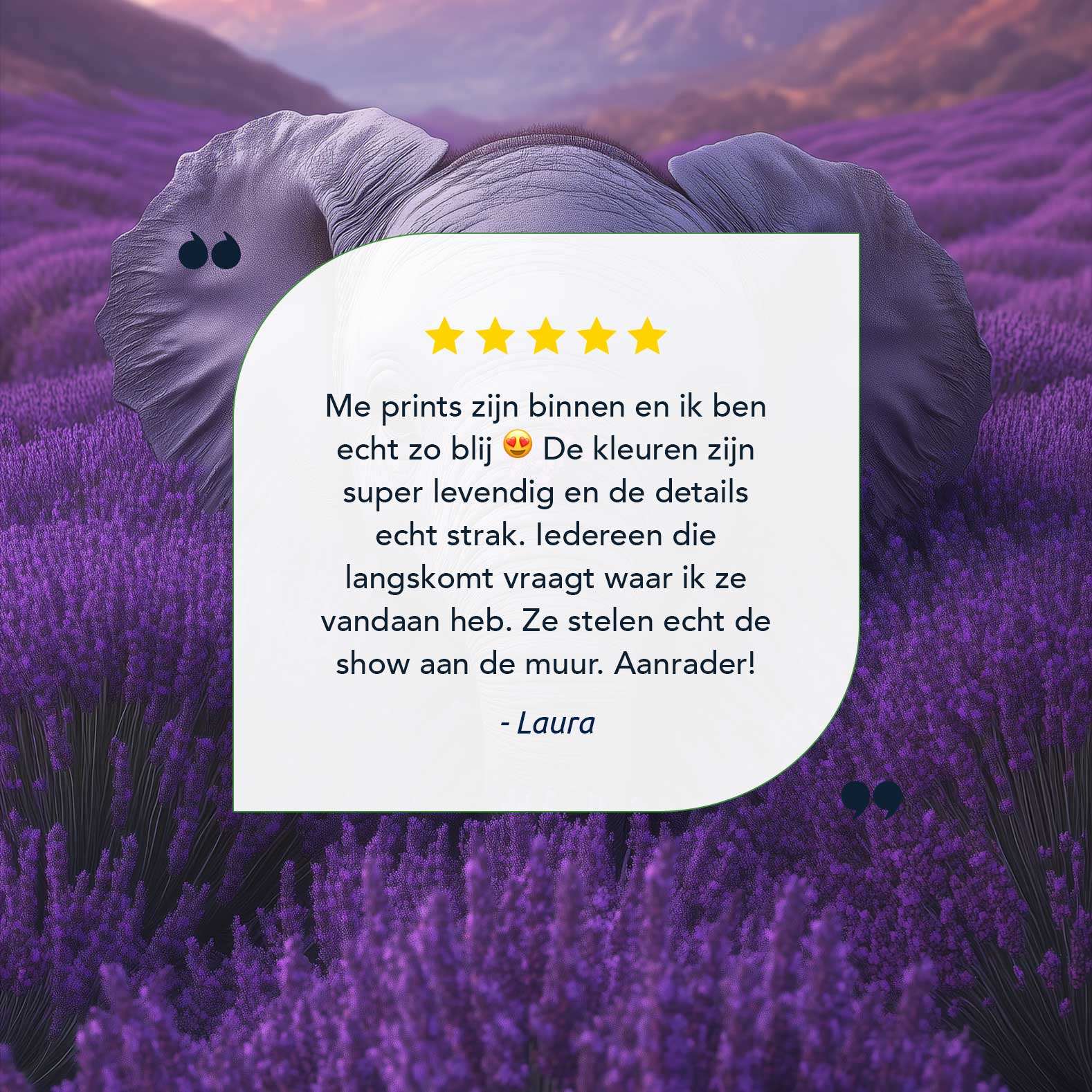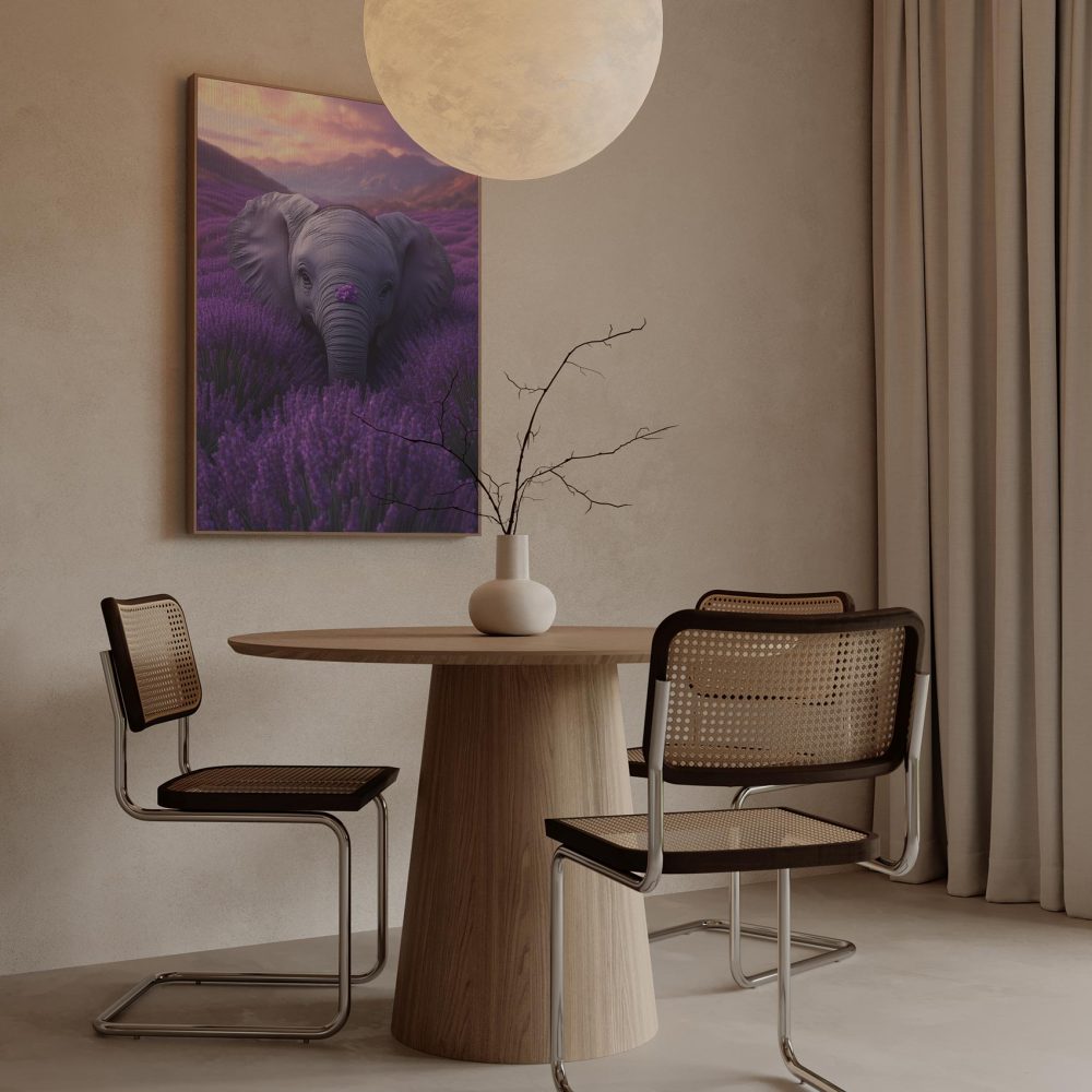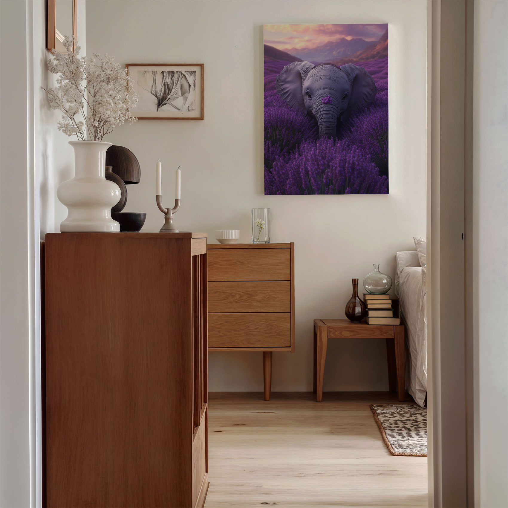 Terug naar collectie / Schilderijen / Bergen Schilderij / Grijze olifant tussen paarse bloemen