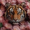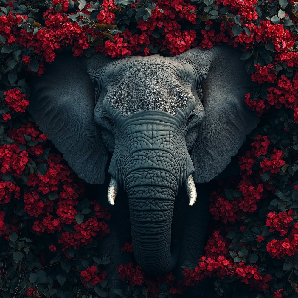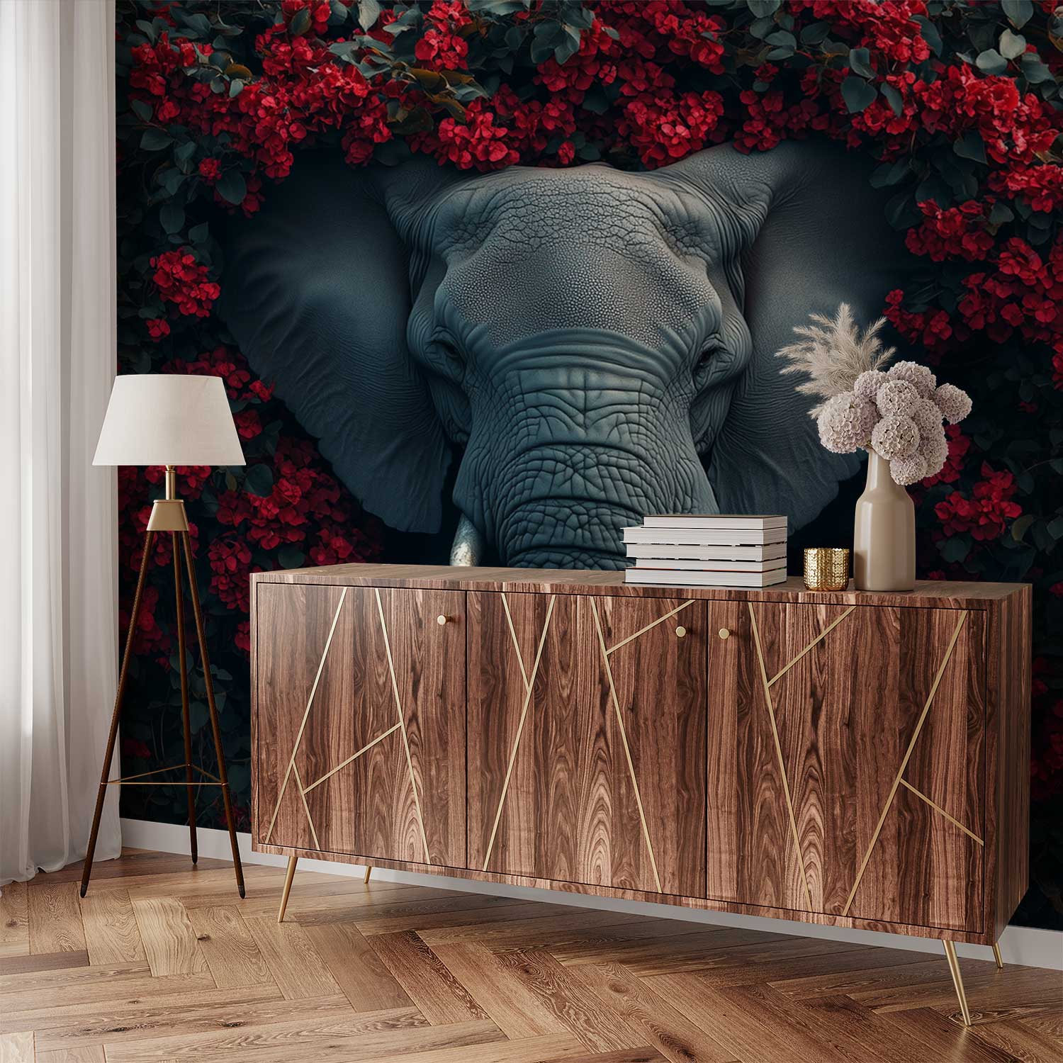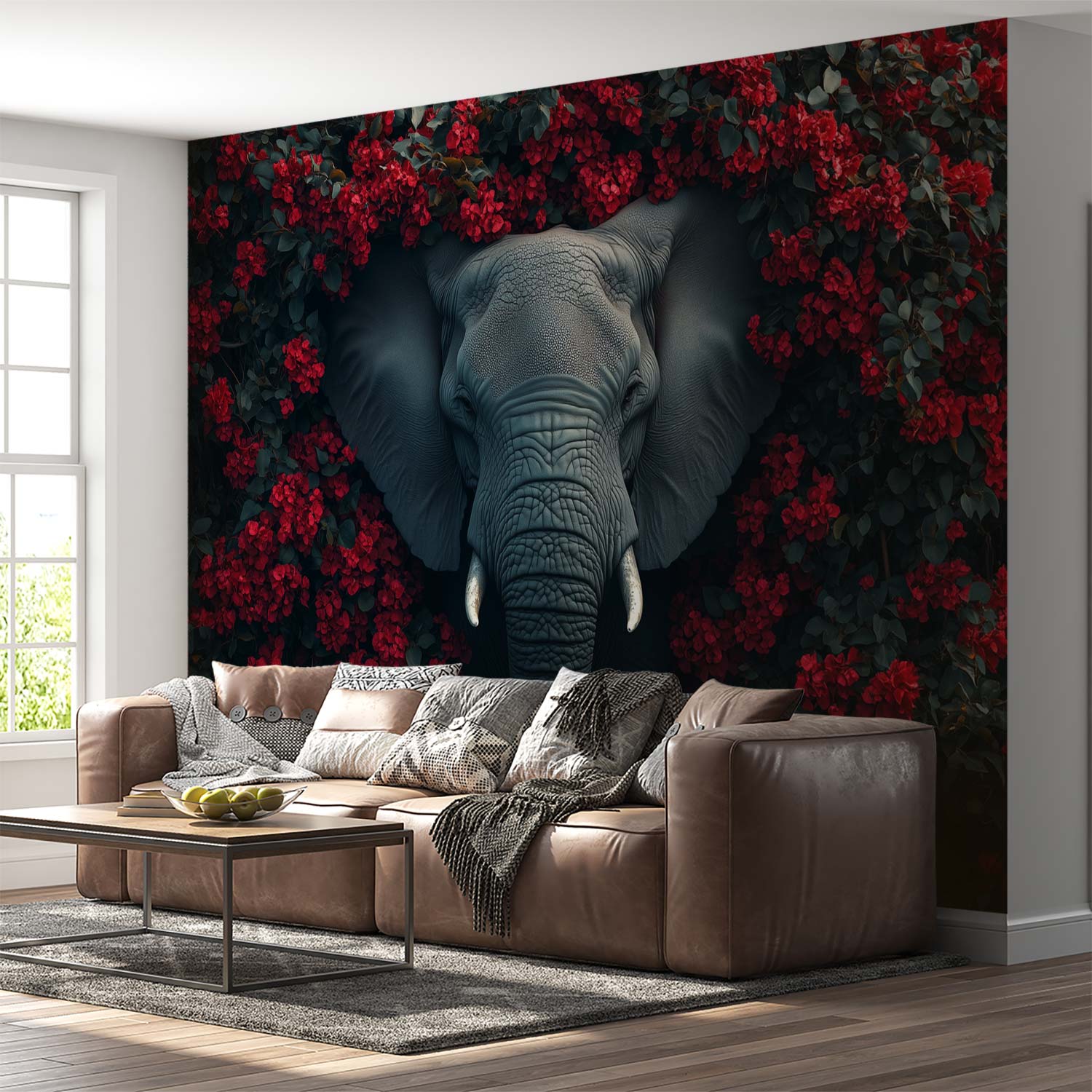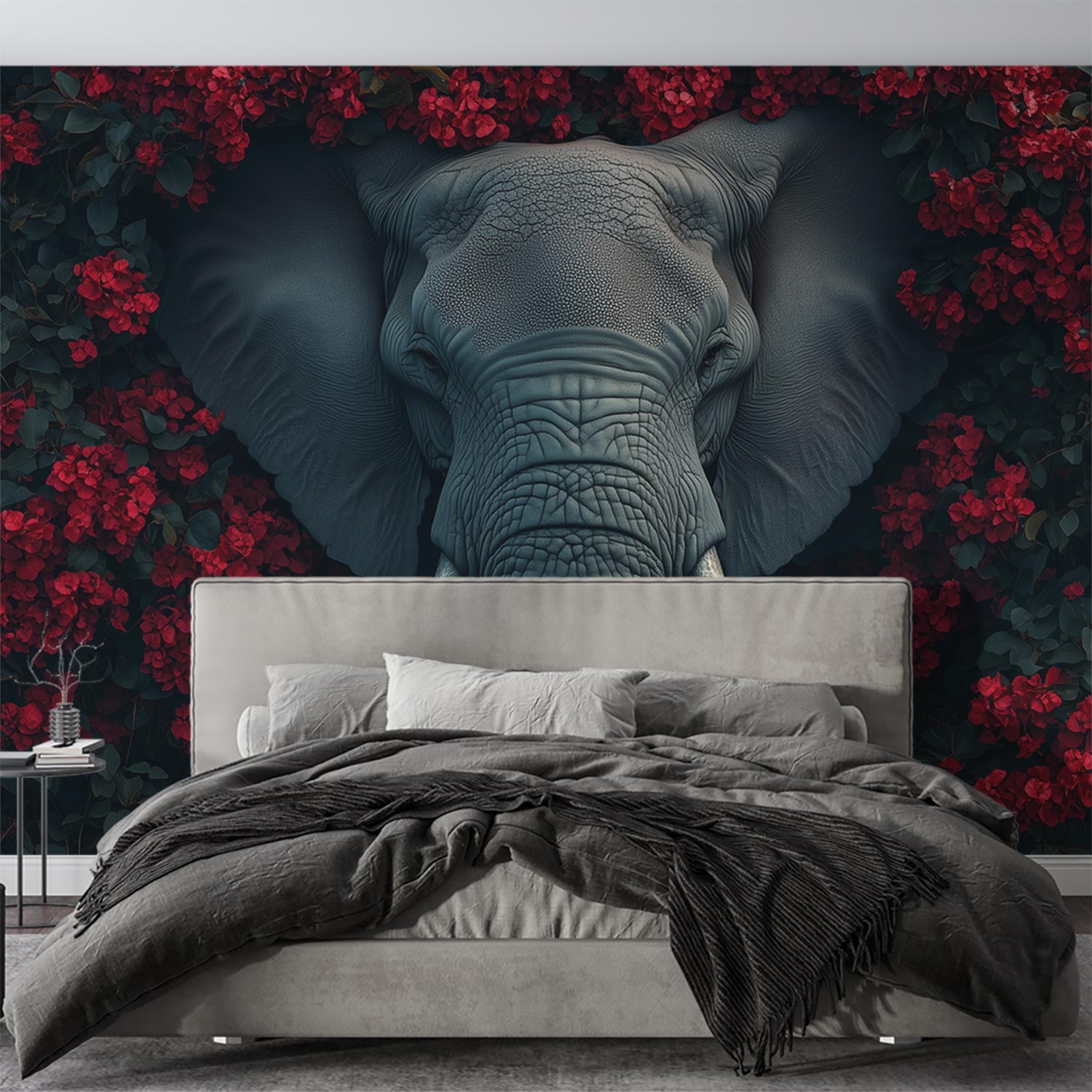 Terug naar collectie / Behang / Grijze olifant tussen rode bloemen behang