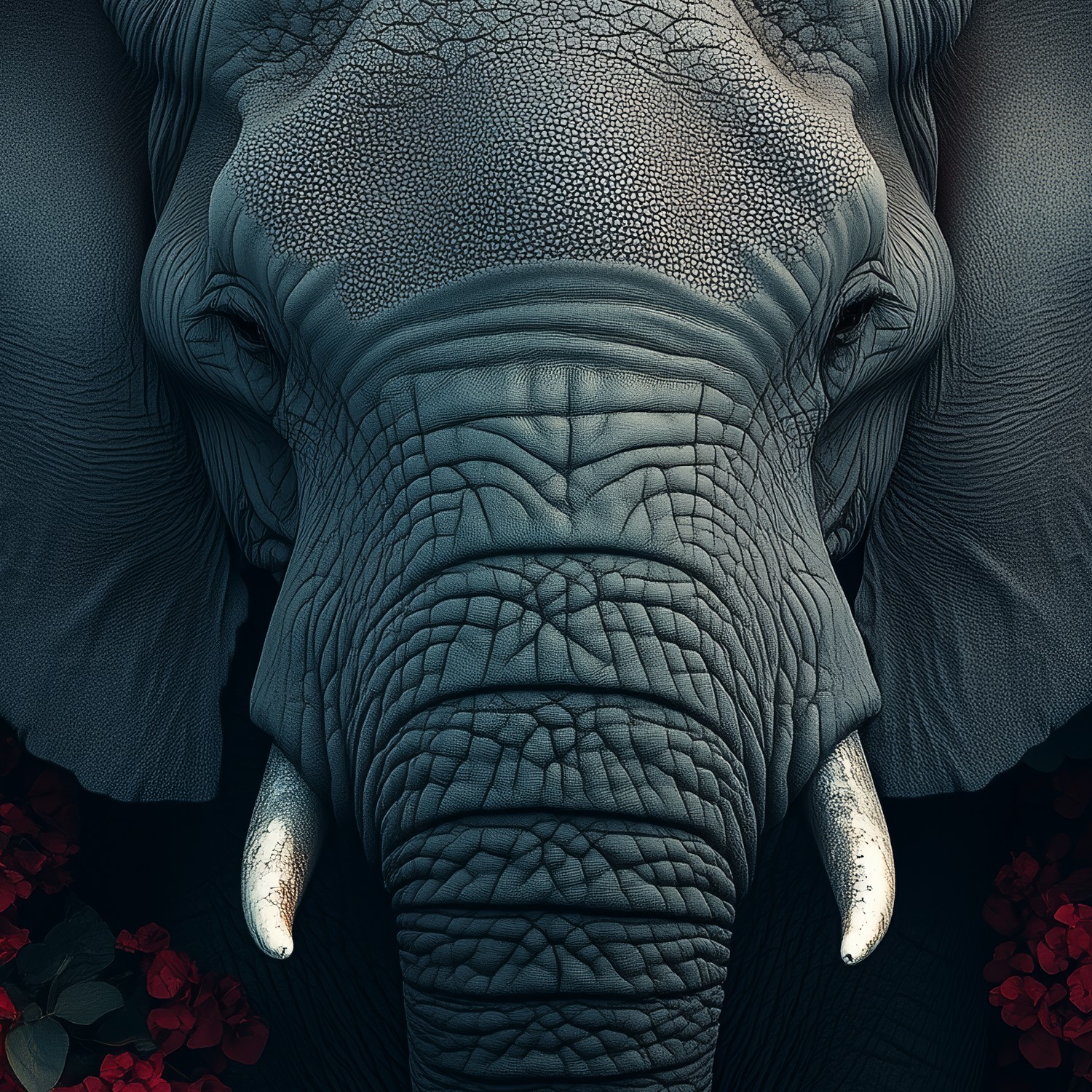 Grijze olifant tussen rode bloemen behang