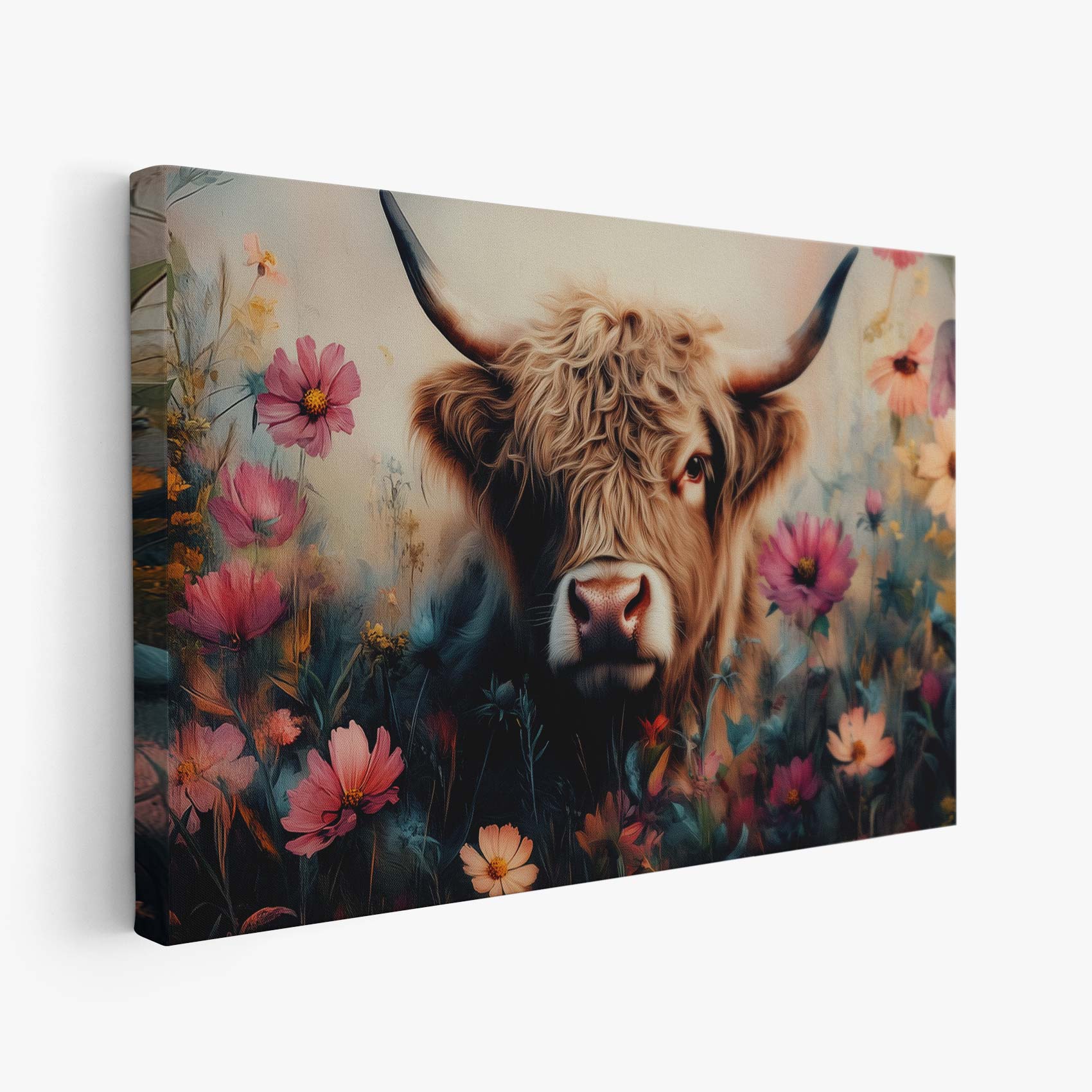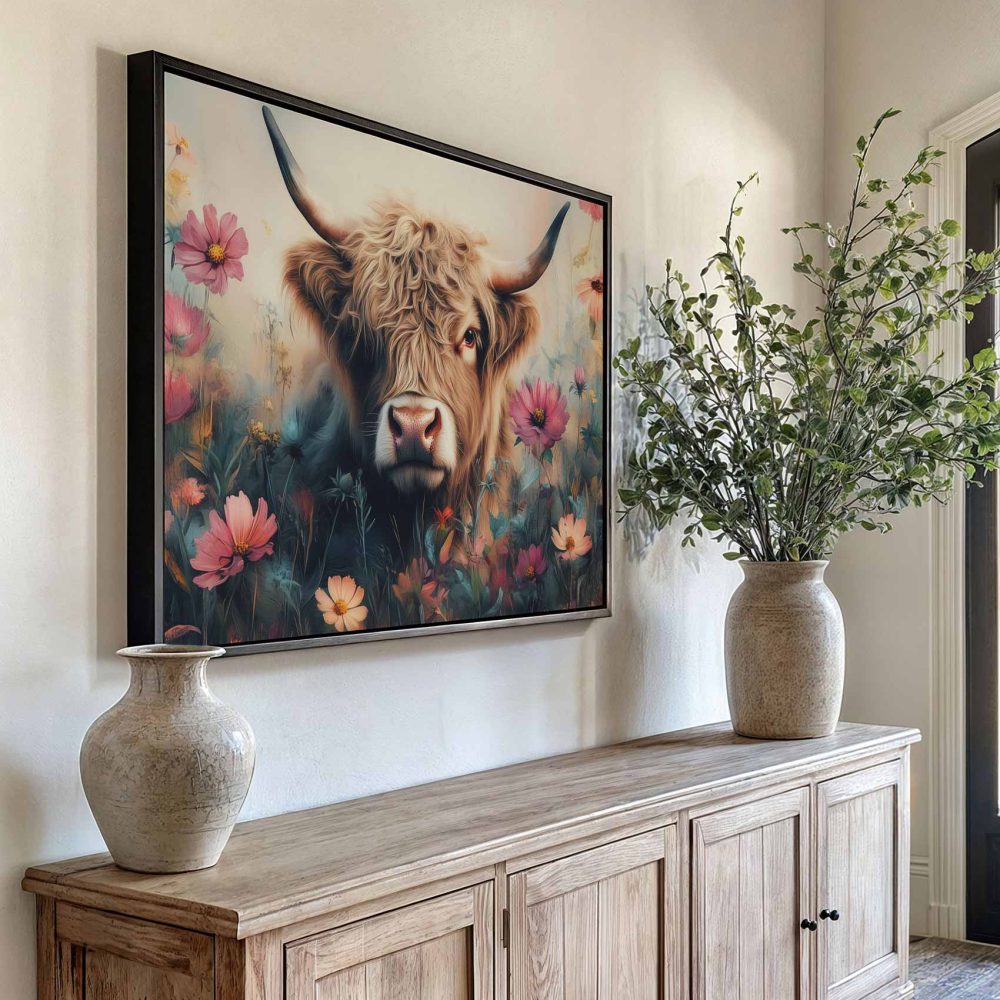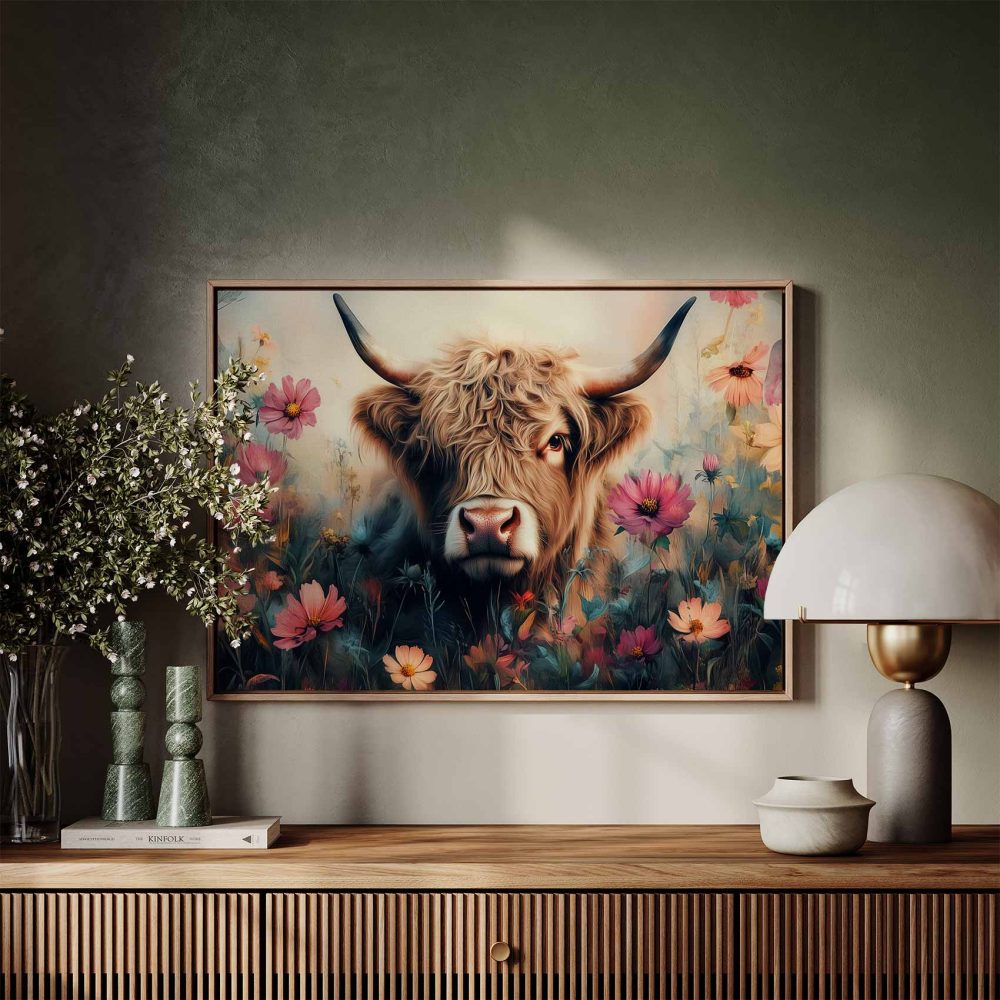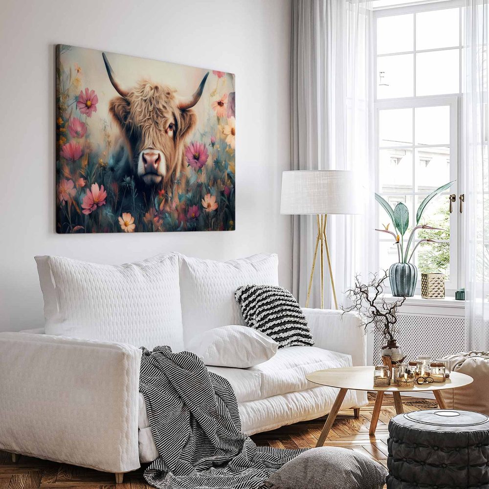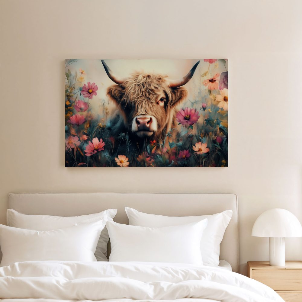 Terug naar collectie / Schilderijen / Bloemen Schilderij / Harige koe in bloemenveld