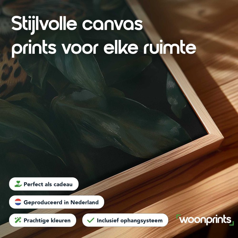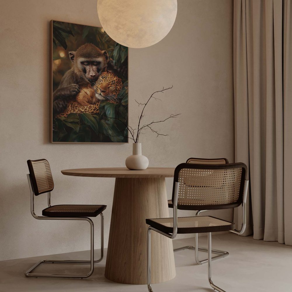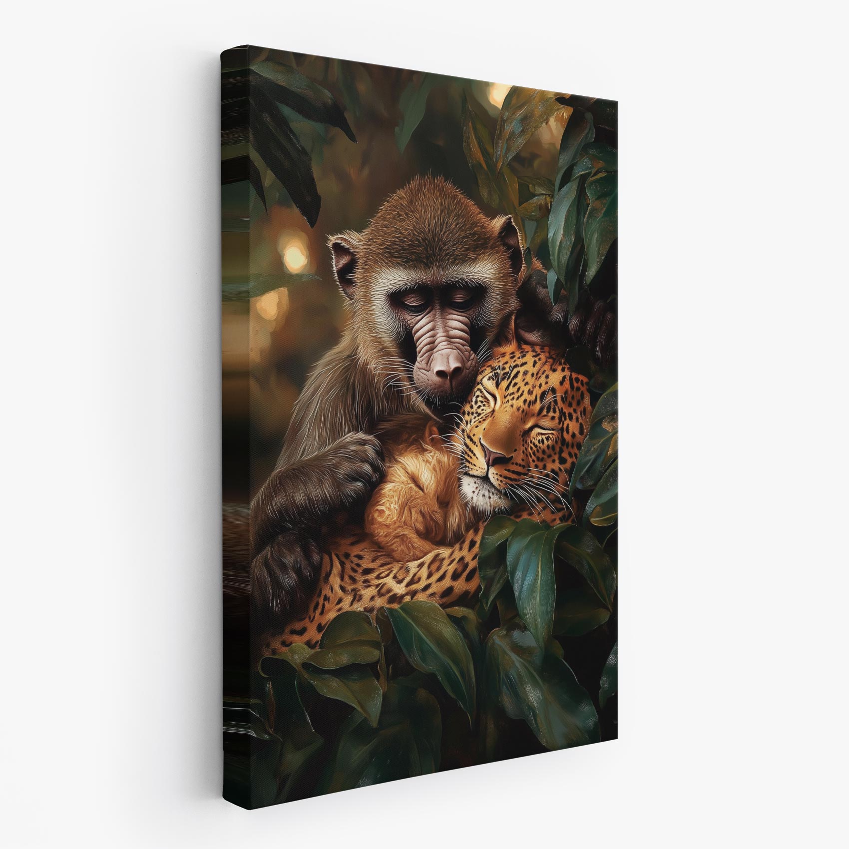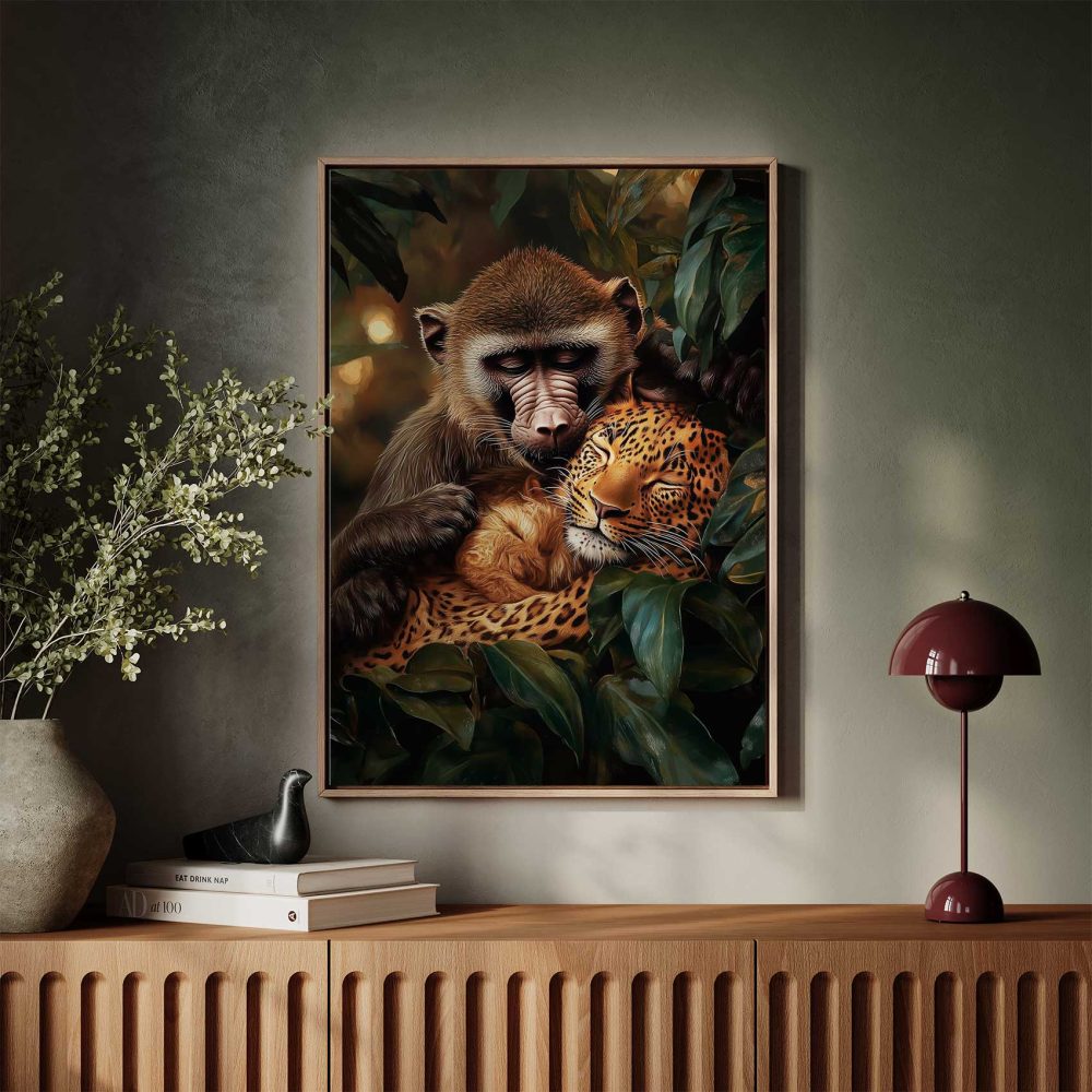 Terug naar collectie / Schilderijen / Bossen Schilderij / Harmonisch bosduo: aap & luipaard