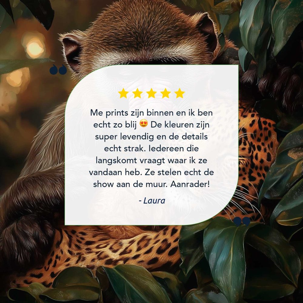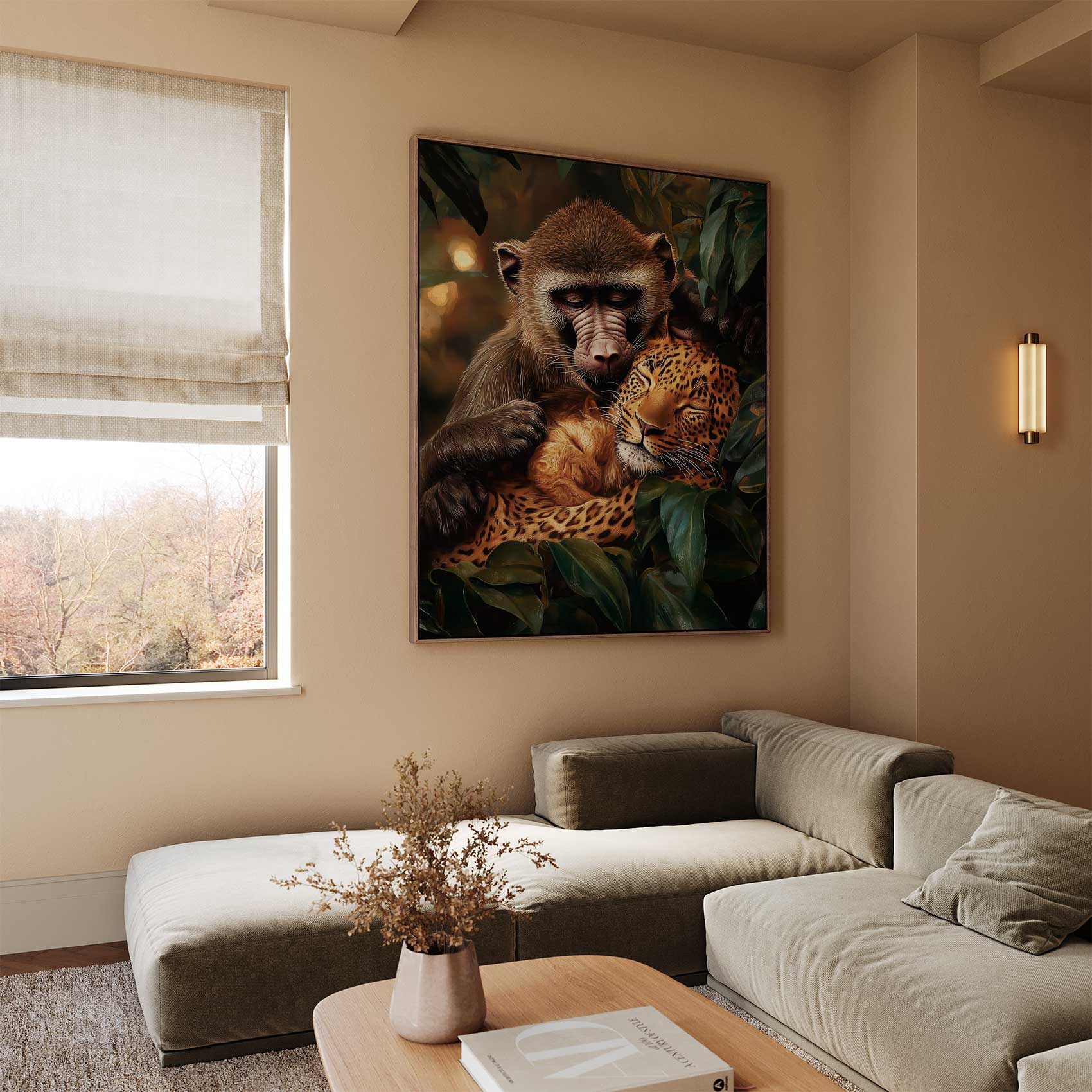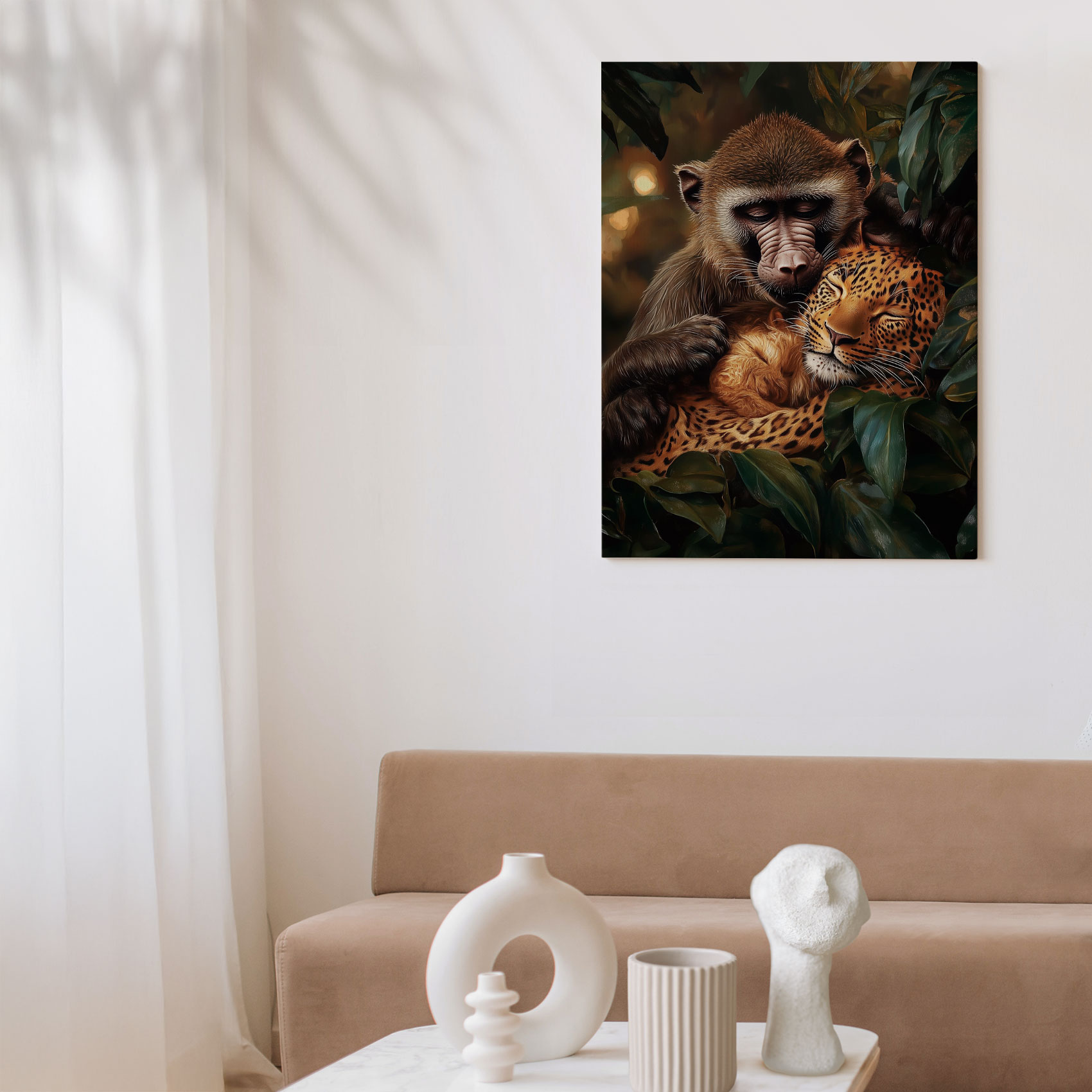 Terug naar collectie / Schilderijen / Bossen Schilderij / Harmonisch bosduo: aap & luipaard