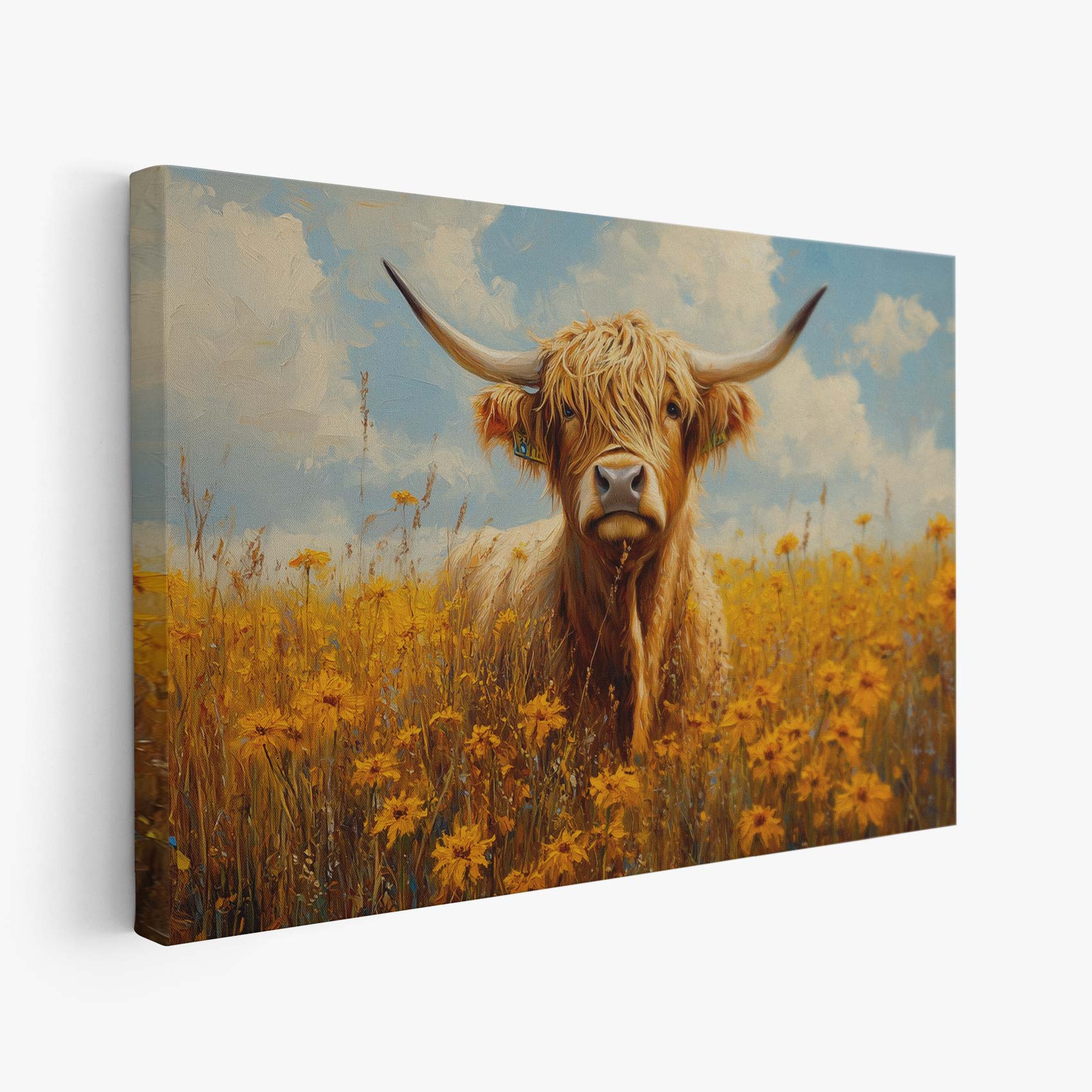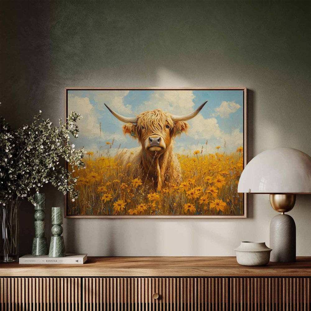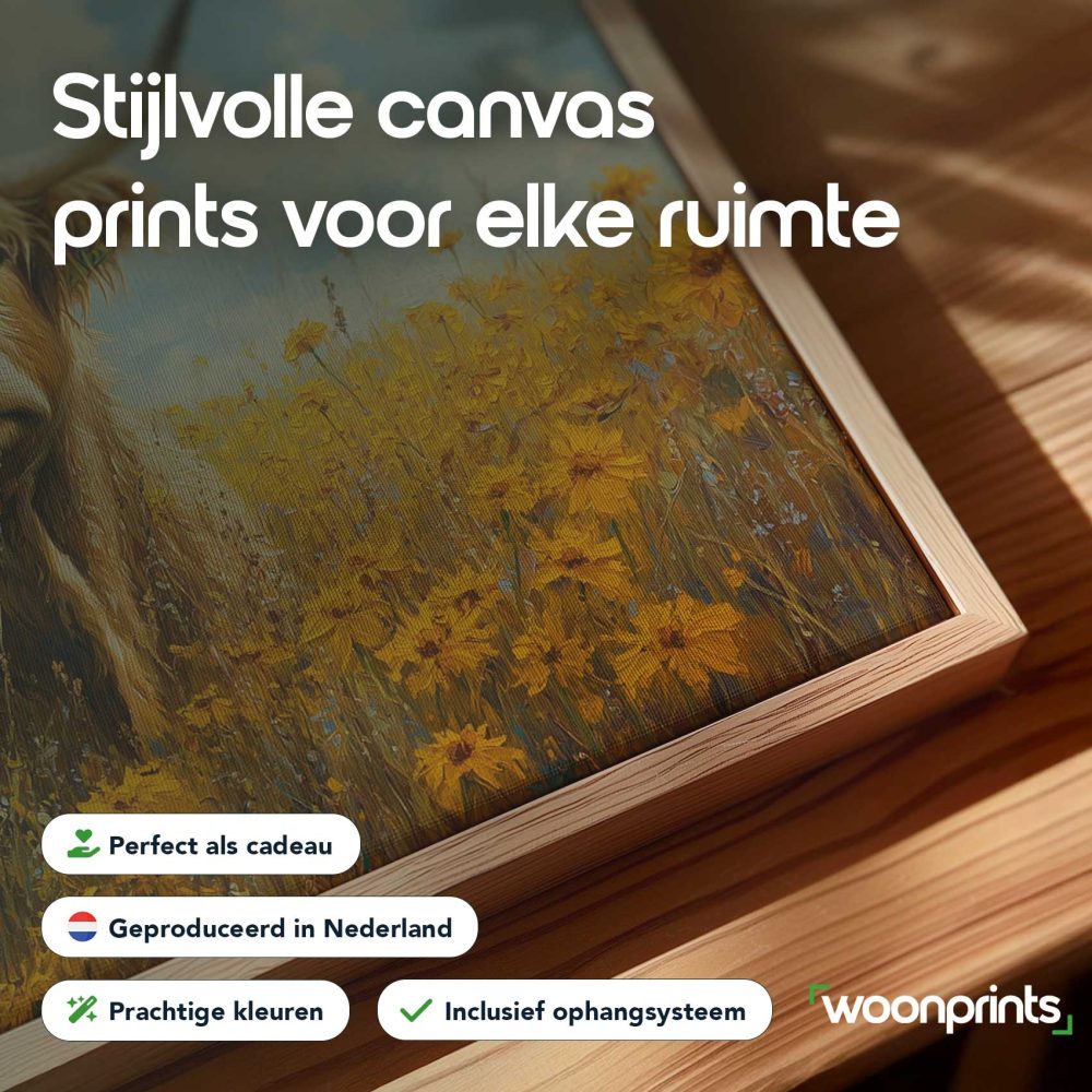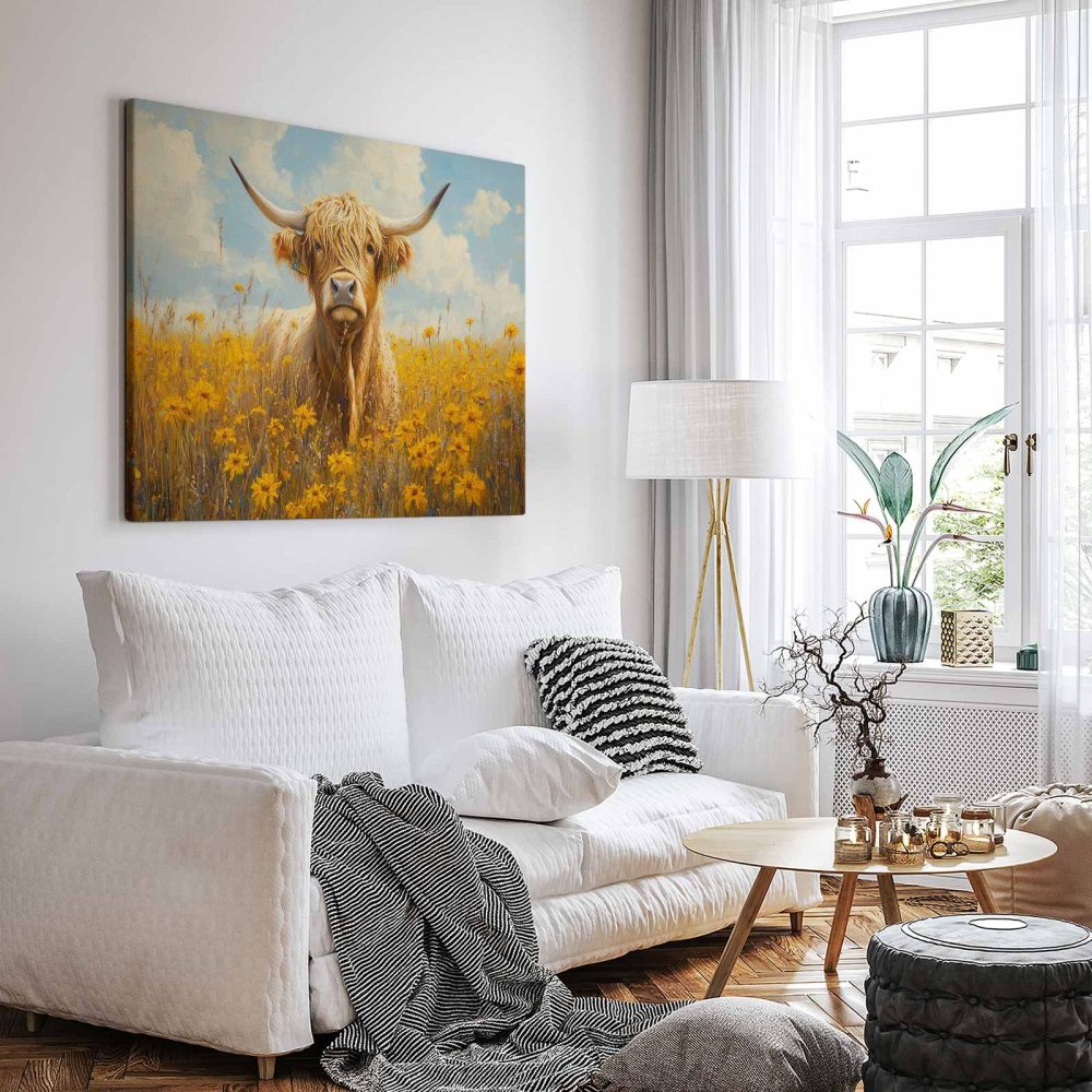 Terug naar collectie / Schilderijen / Bloemen Schilderij / Impressionistische hoornkoe in bloemenveld