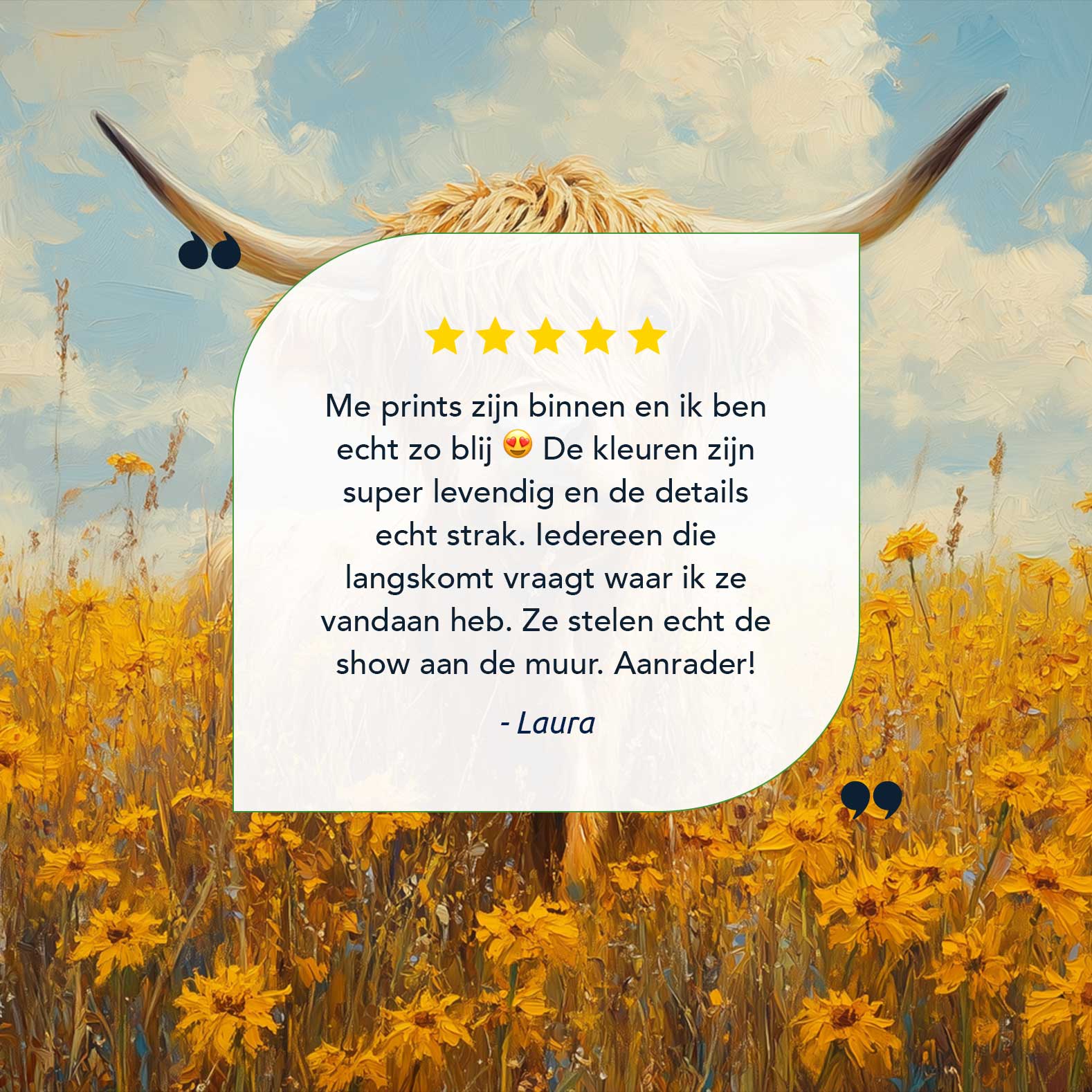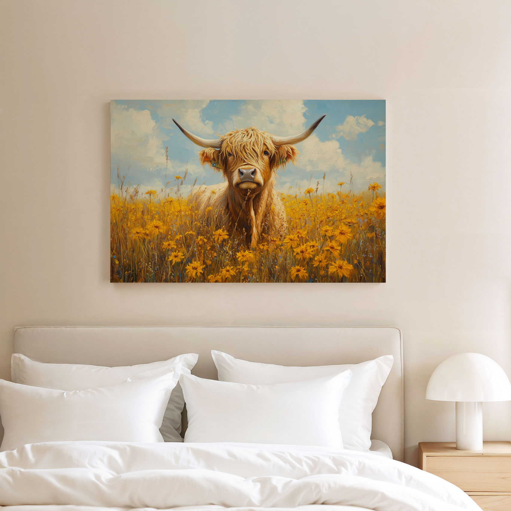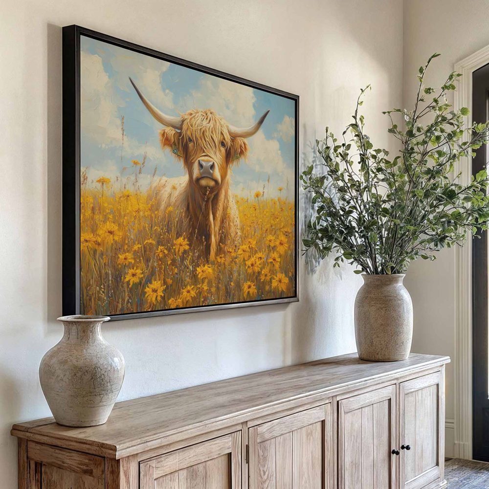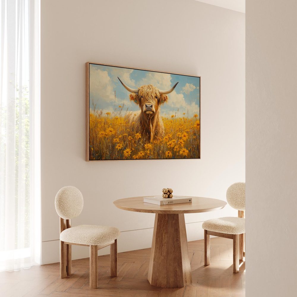 Terug naar collectie / Schilderijen / Bloemen Schilderij / Impressionistische hoornkoe in bloemenveld