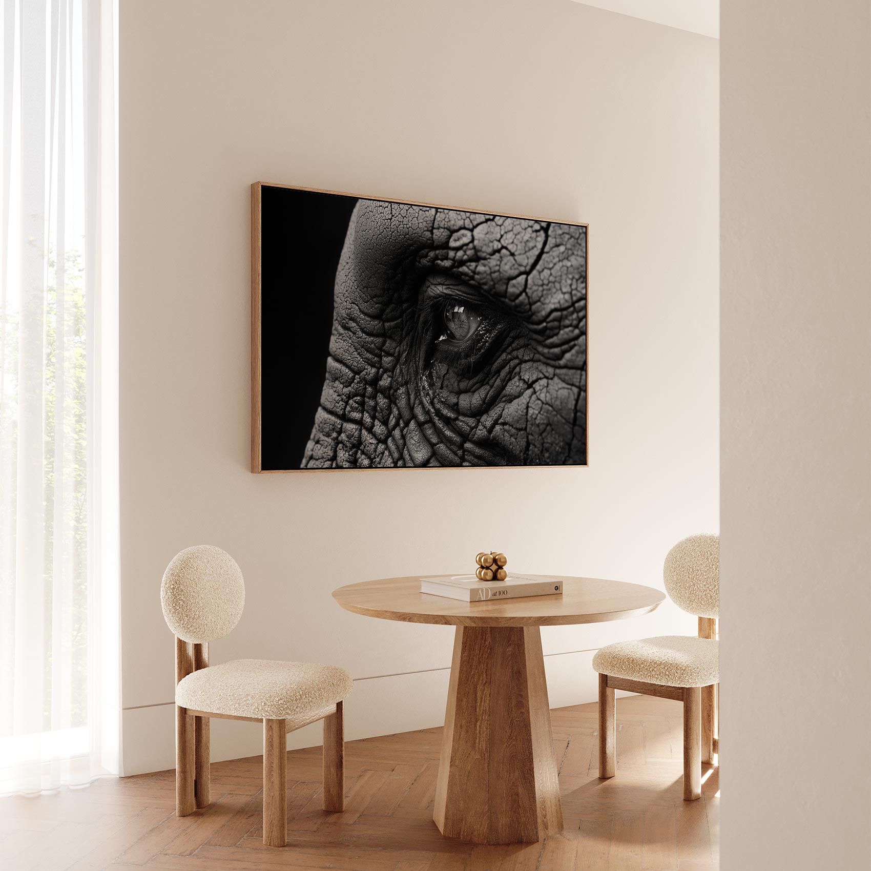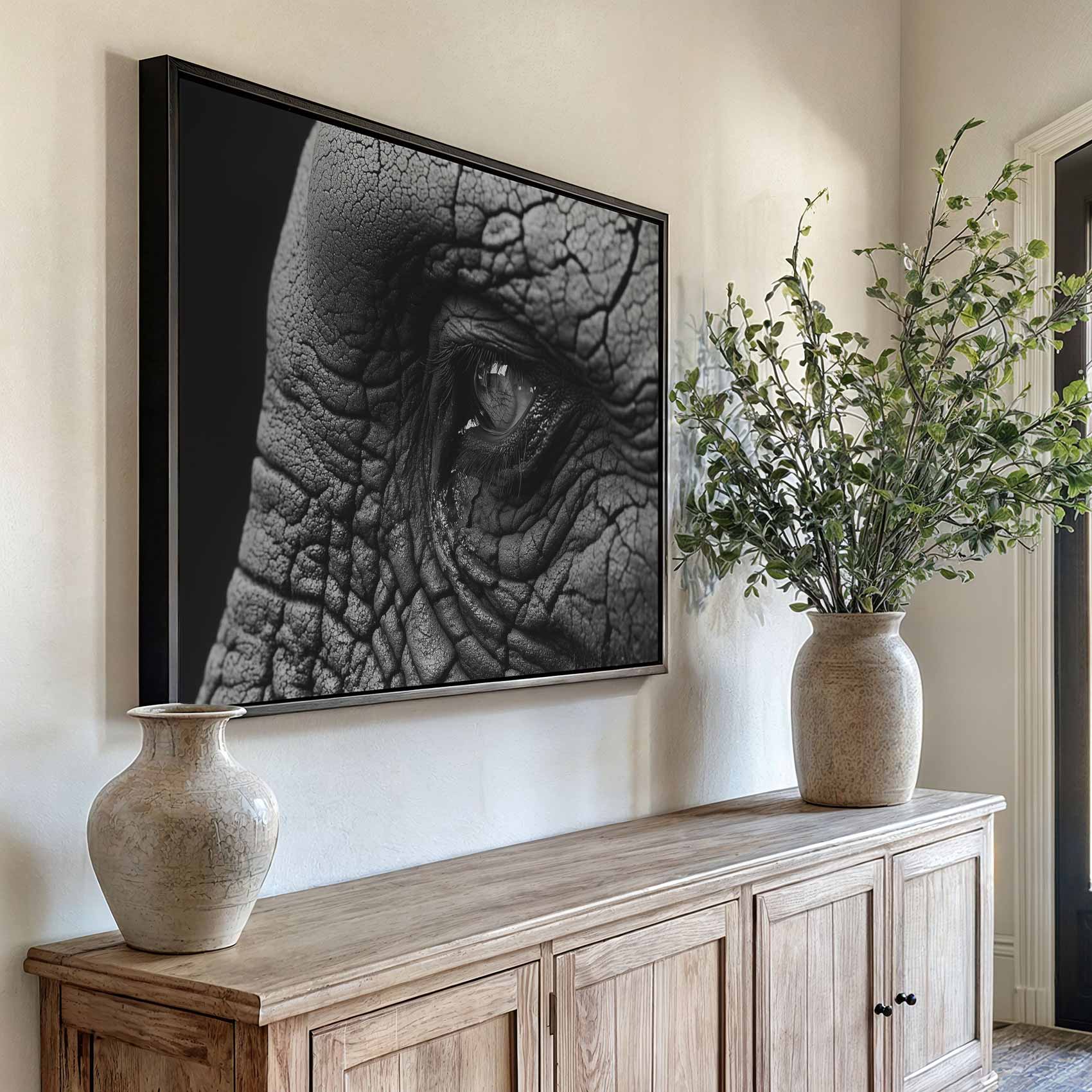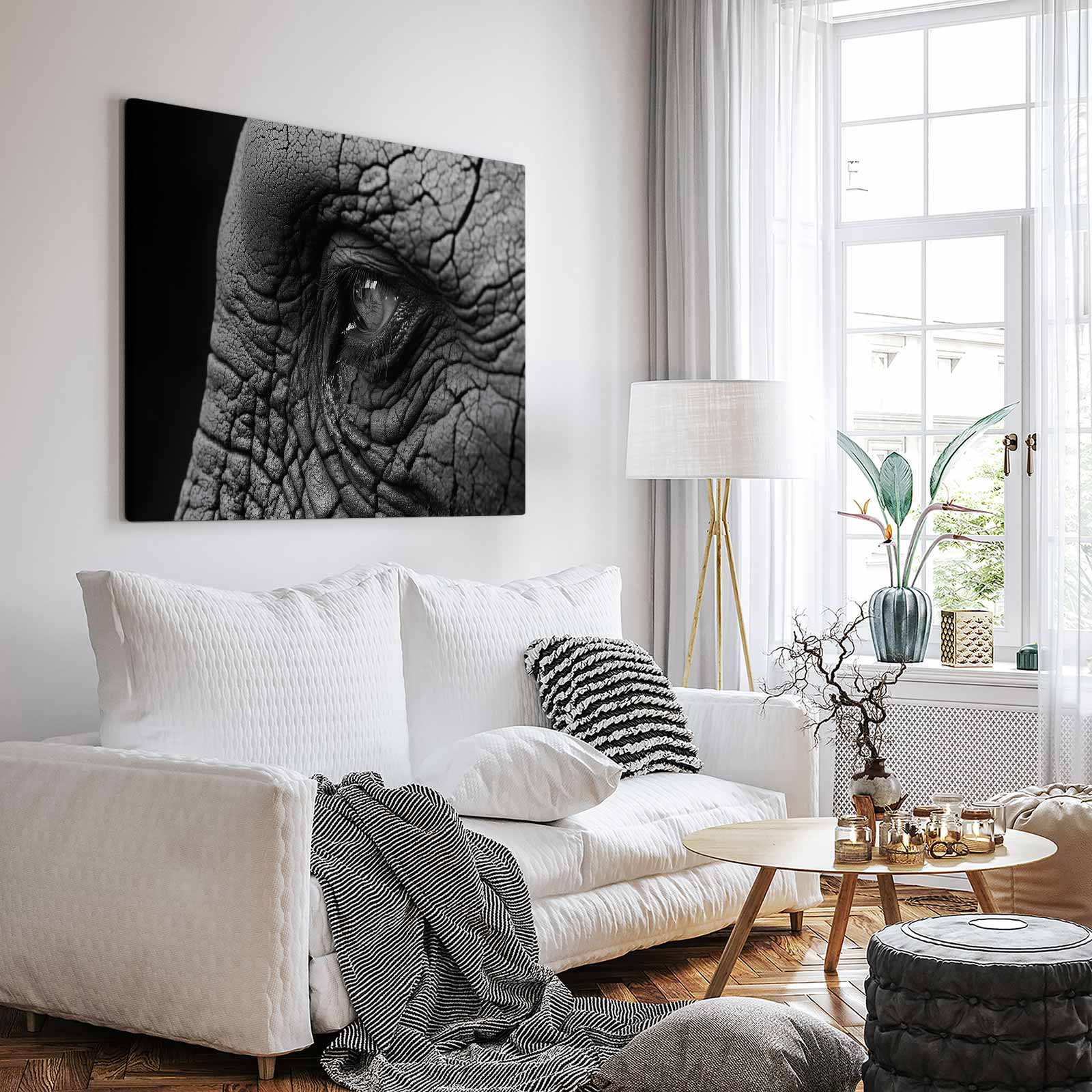 Terug naar collectie / Schilderijen / Dieren Schilderij / Indringend olifantenoog zwart-wit