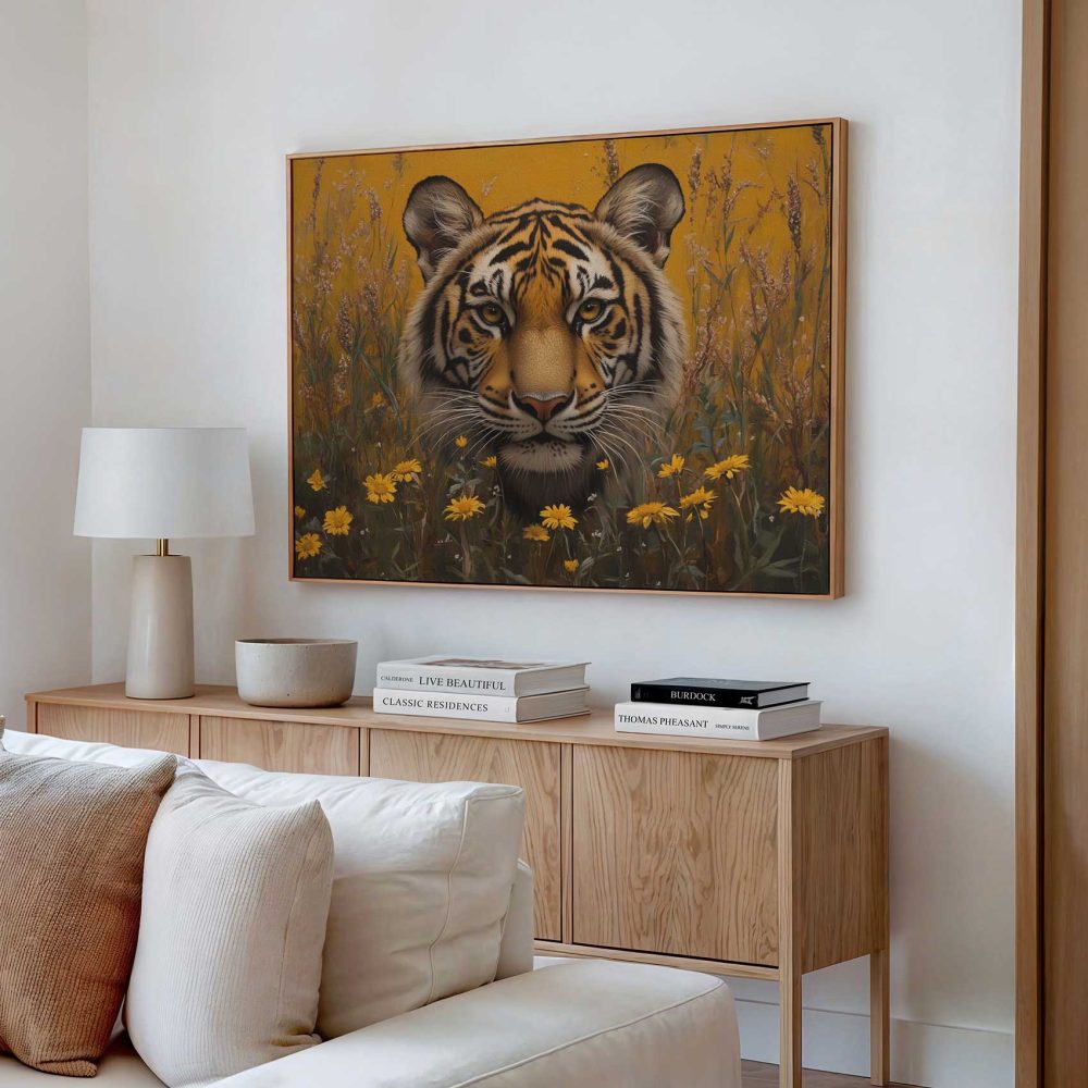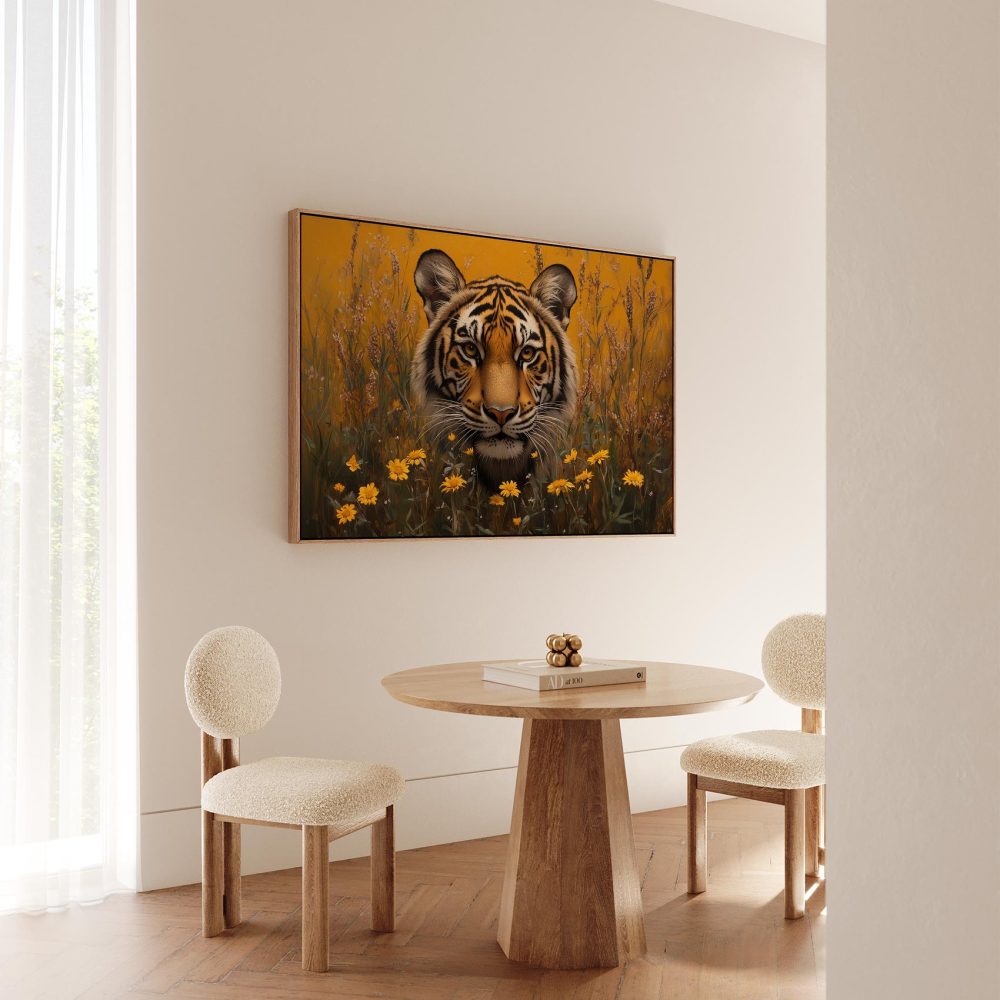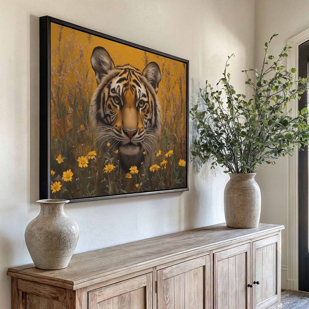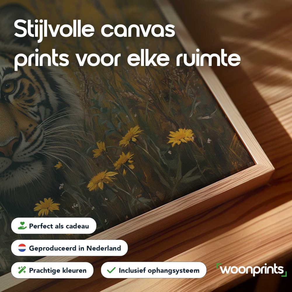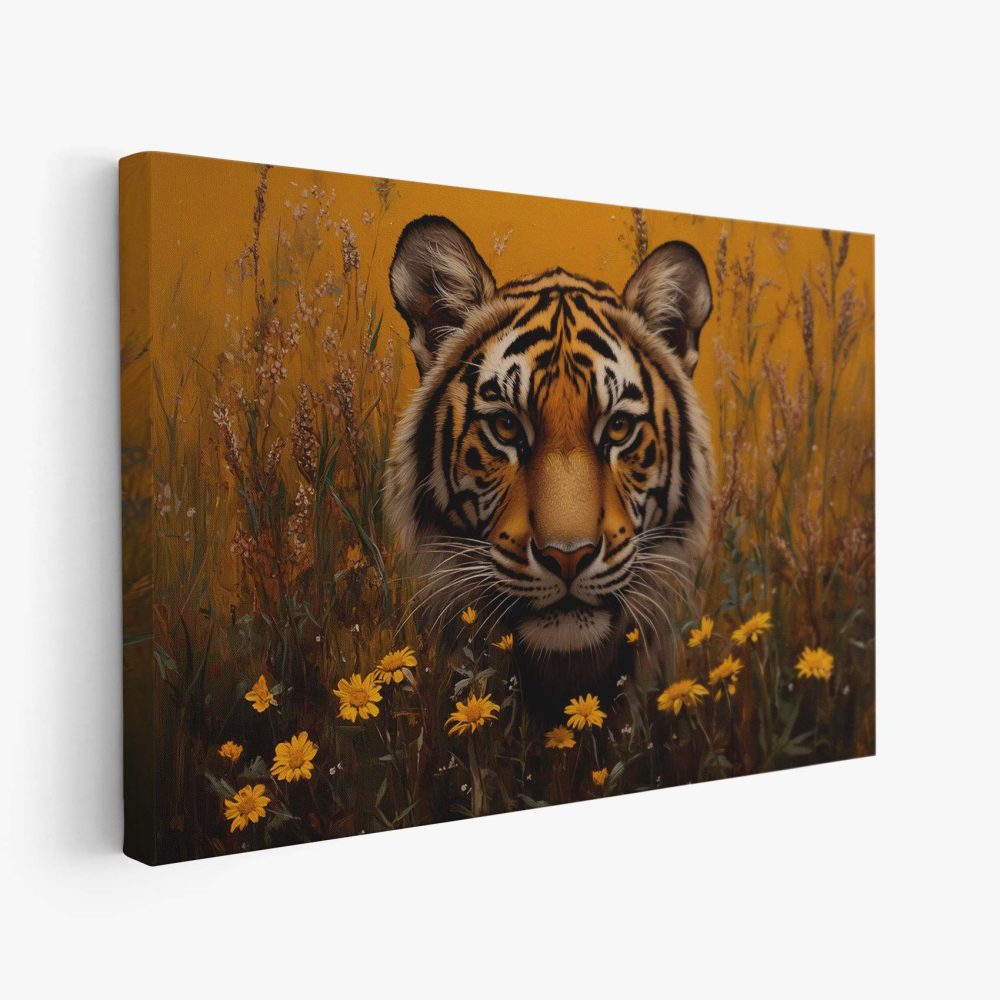 Terug naar collectie / Schilderijen / Bloemen Schilderij / Intenser tijgerportret met bloemen
