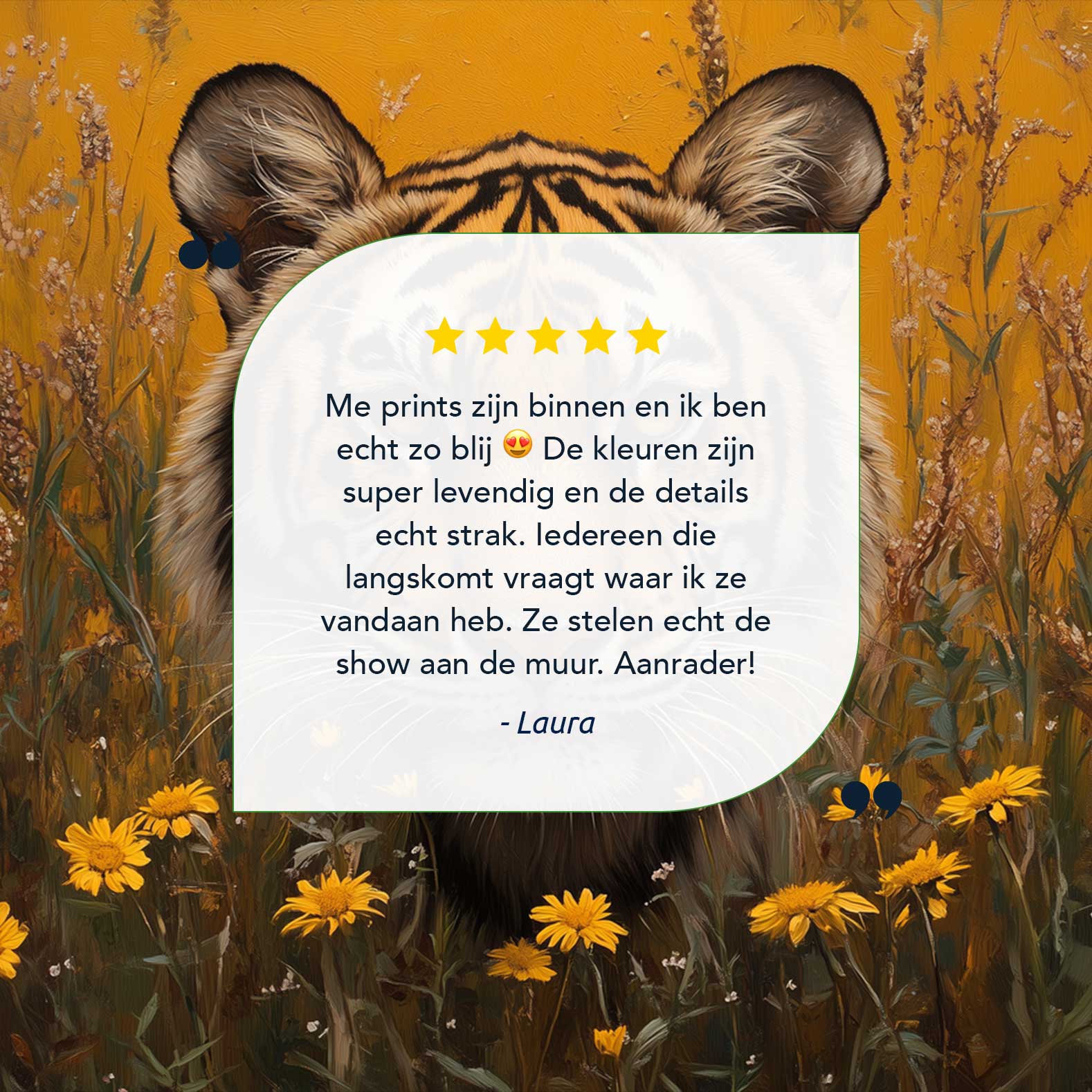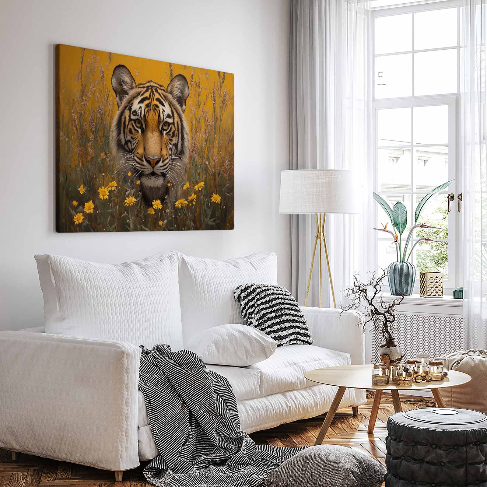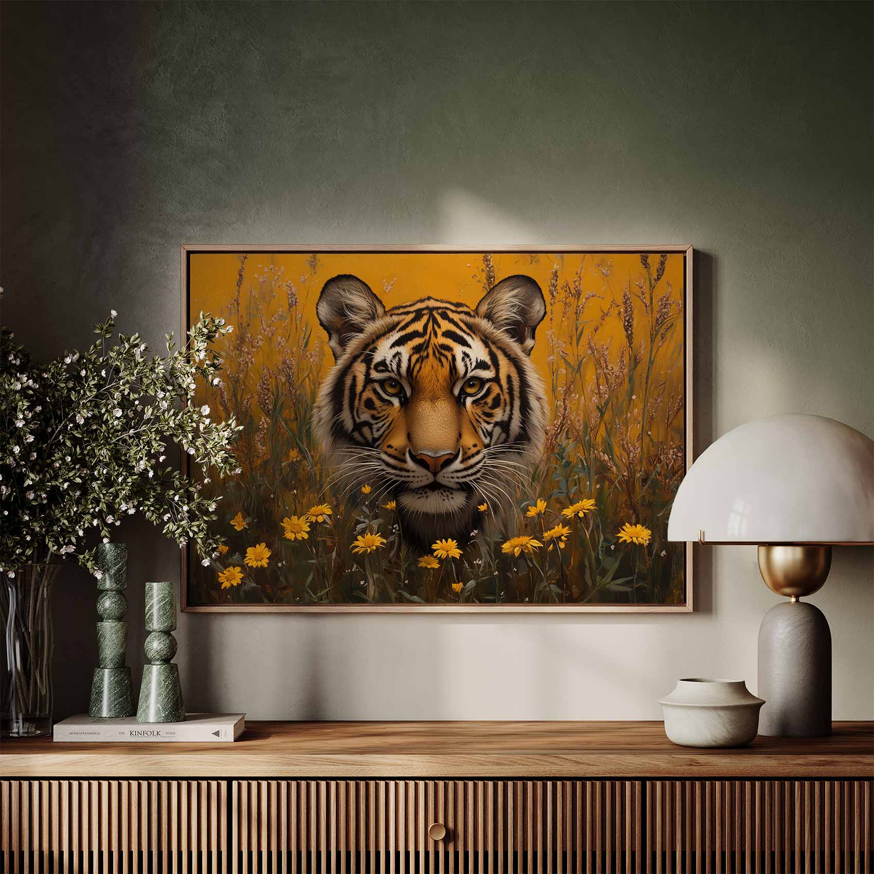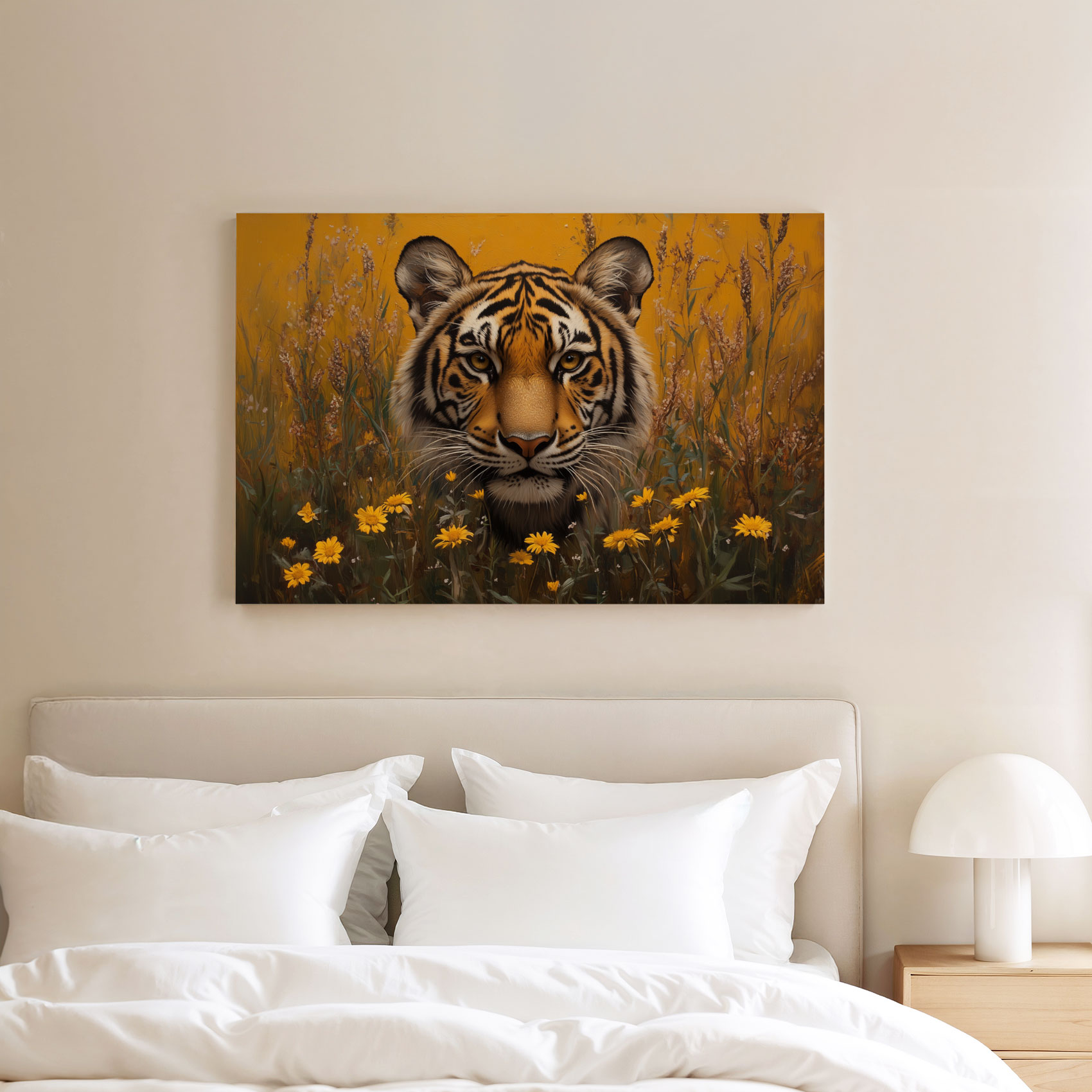 Terug naar collectie / Schilderijen / Bloemen Schilderij / Intenser tijgerportret met bloemen