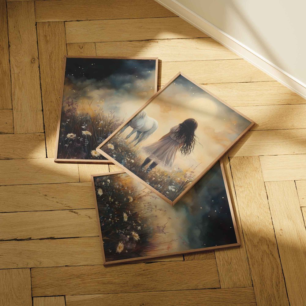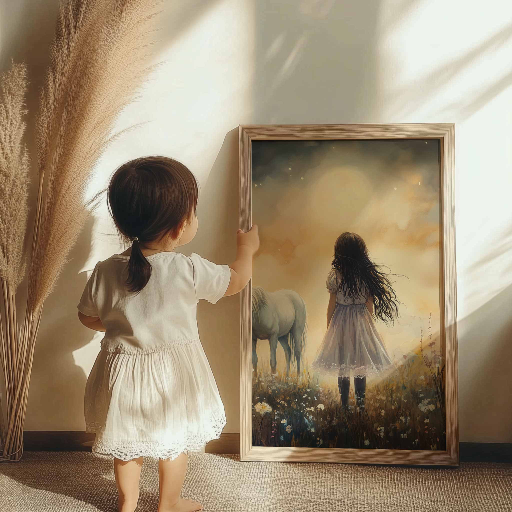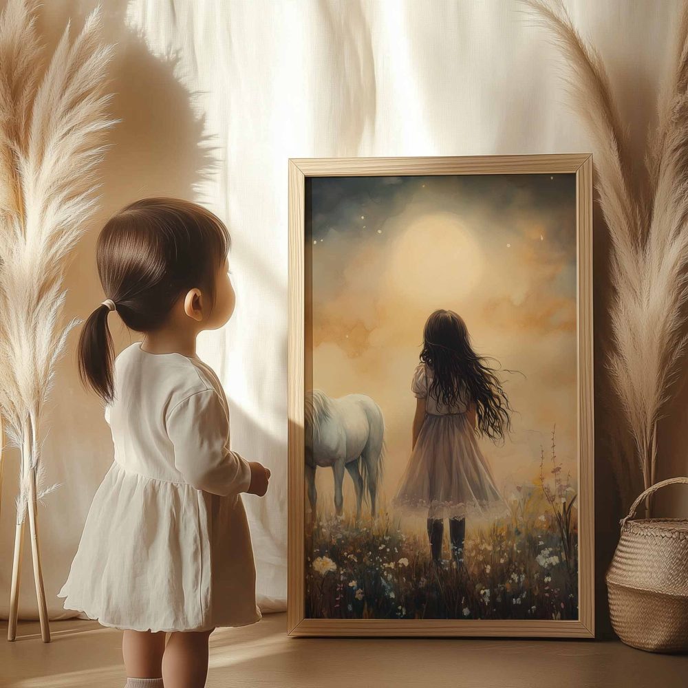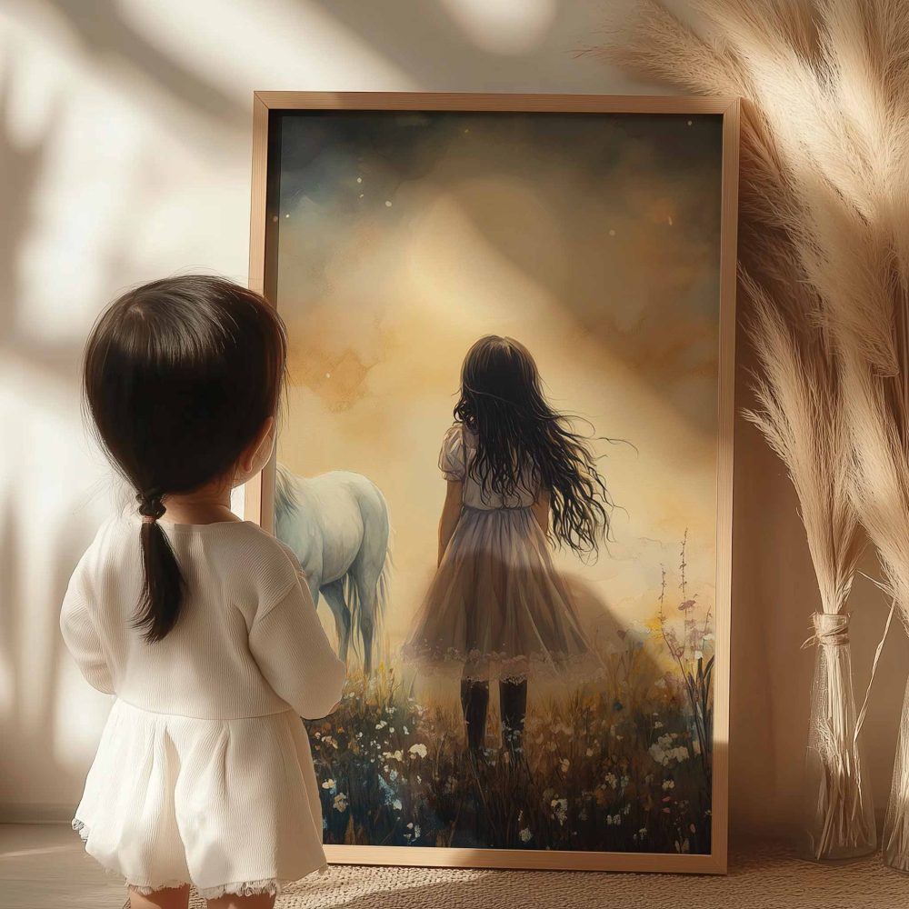 Terug naar collectie / Uncategorized / Jong Meisje en Witte Paard in Dromerig Bloemenveld