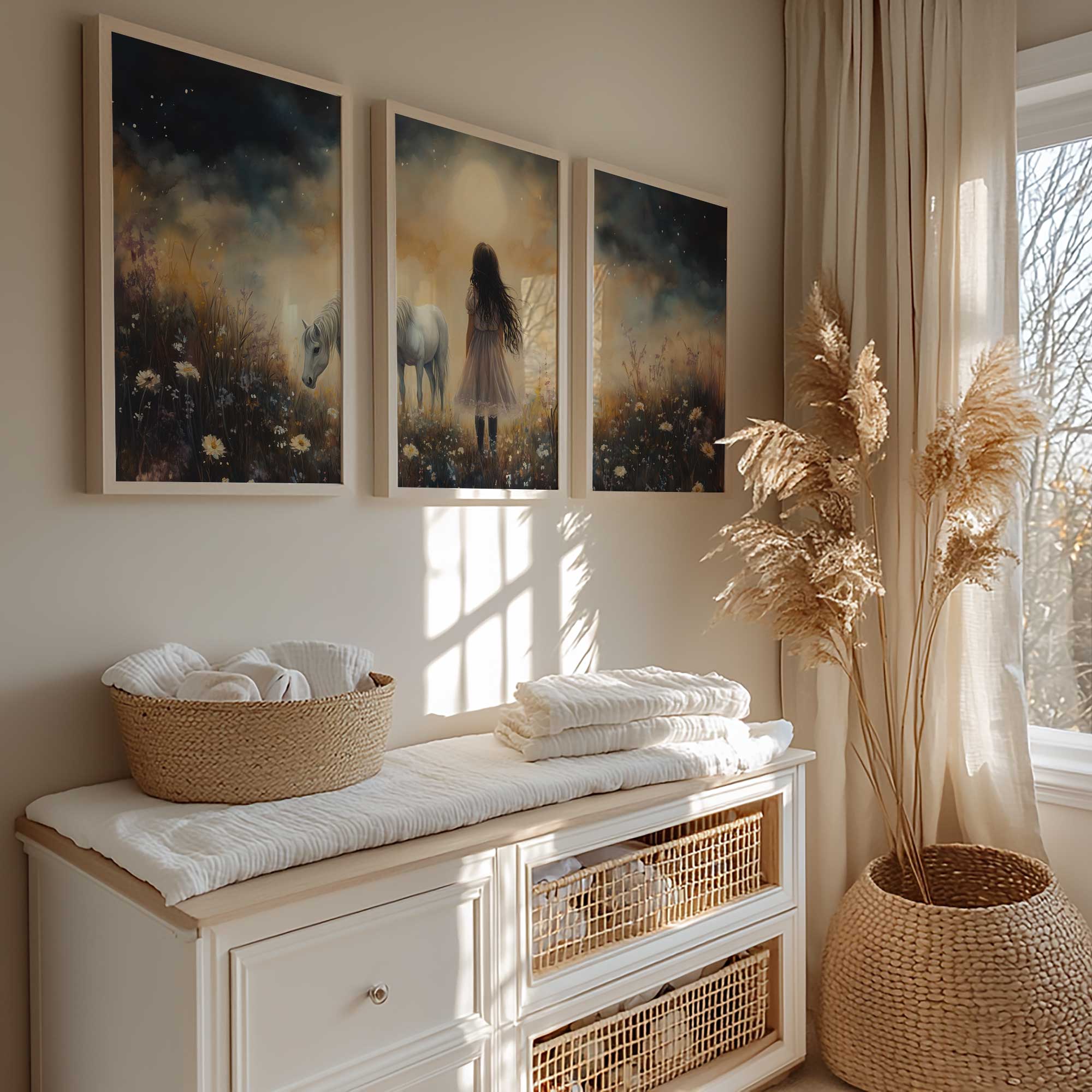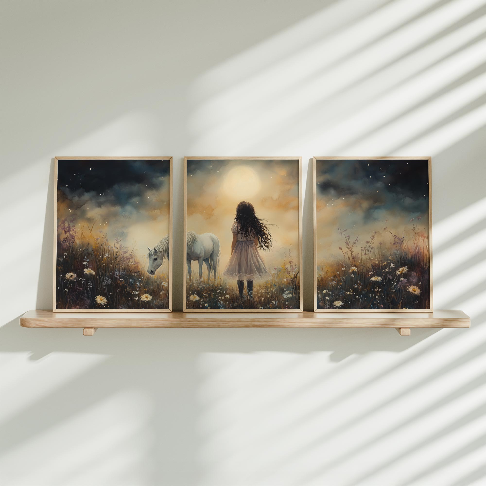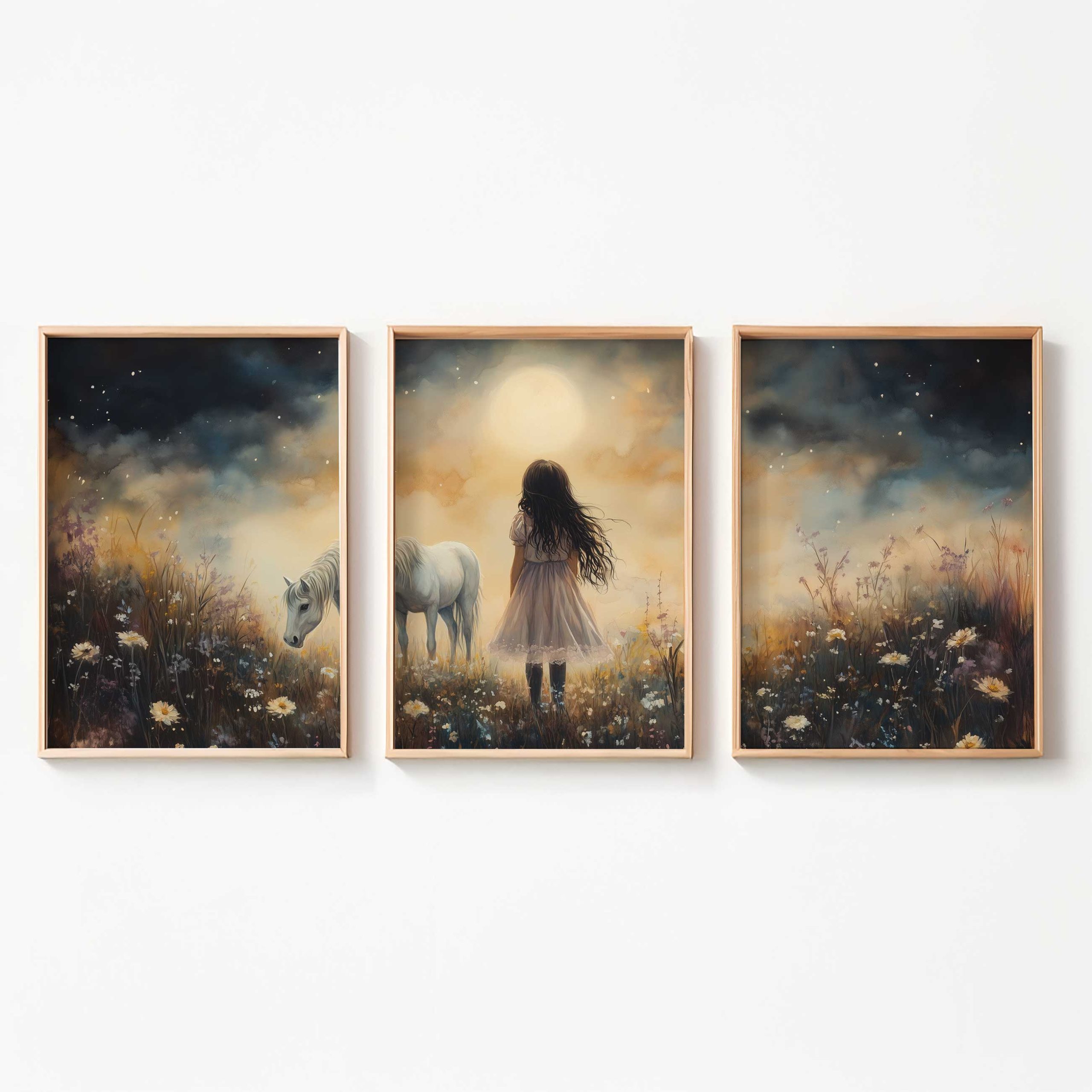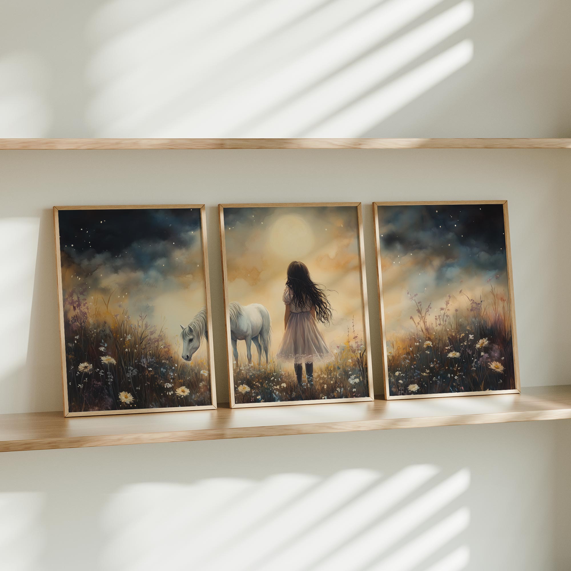 Terug naar collectie / Uncategorized / Jong Meisje en Witte Paard in Dromerig Bloemenveld