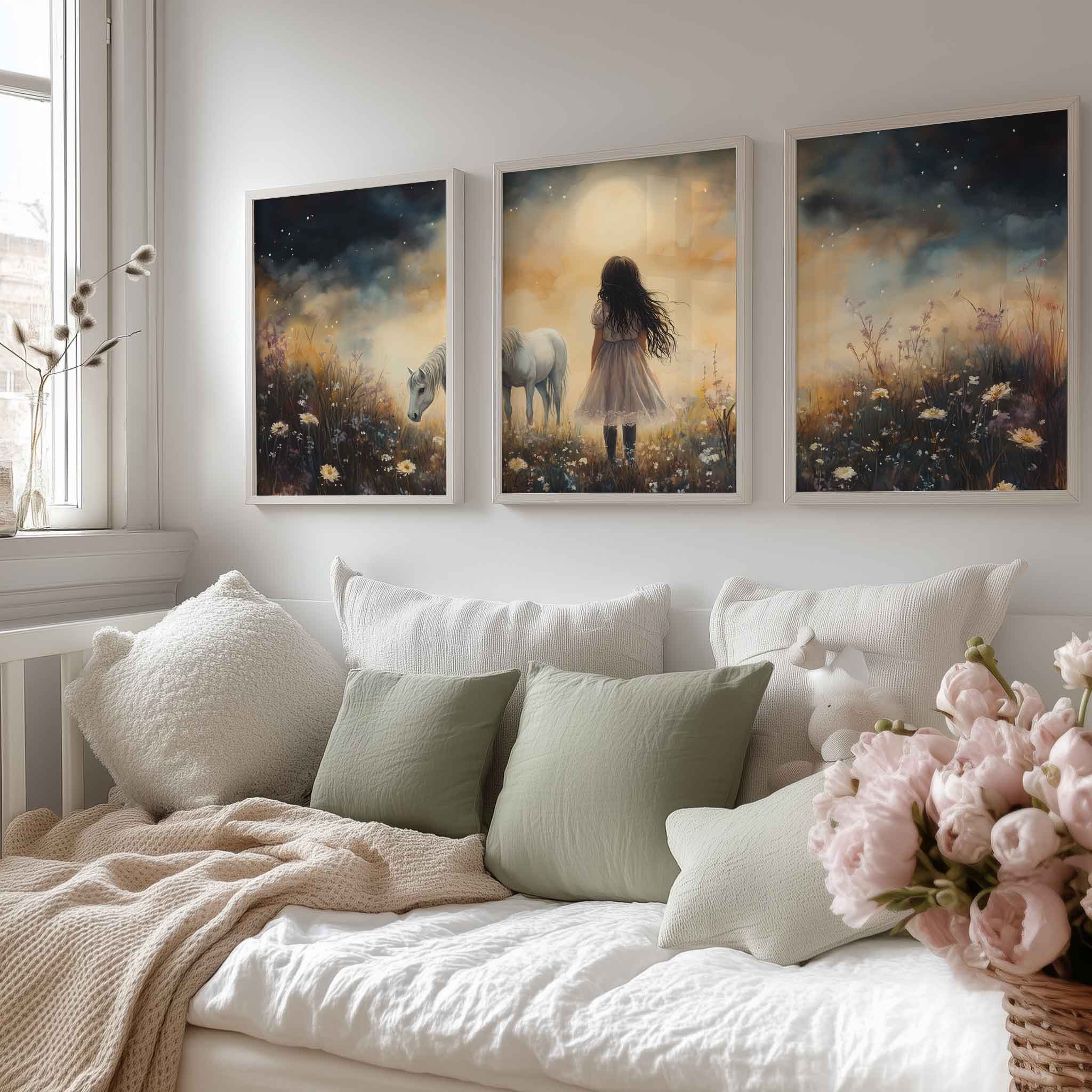 Jong Meisje en Witte Paard in Dromerig Bloemenveld