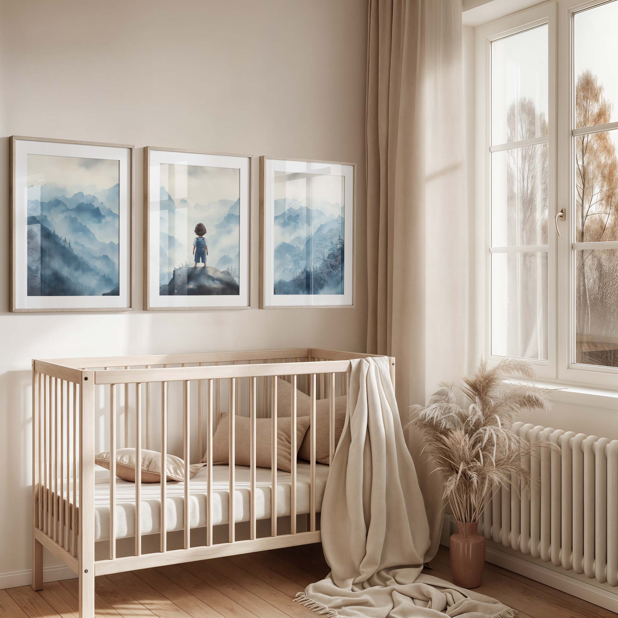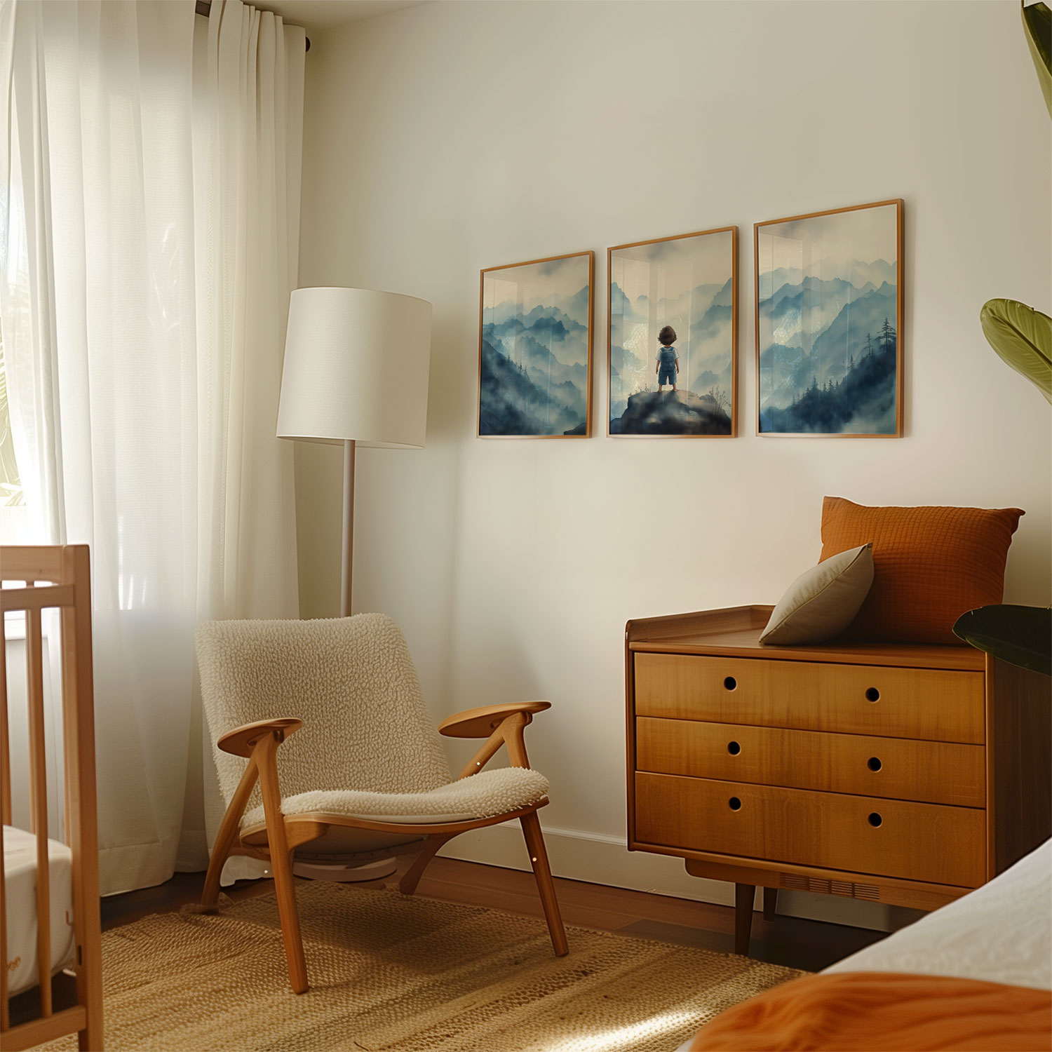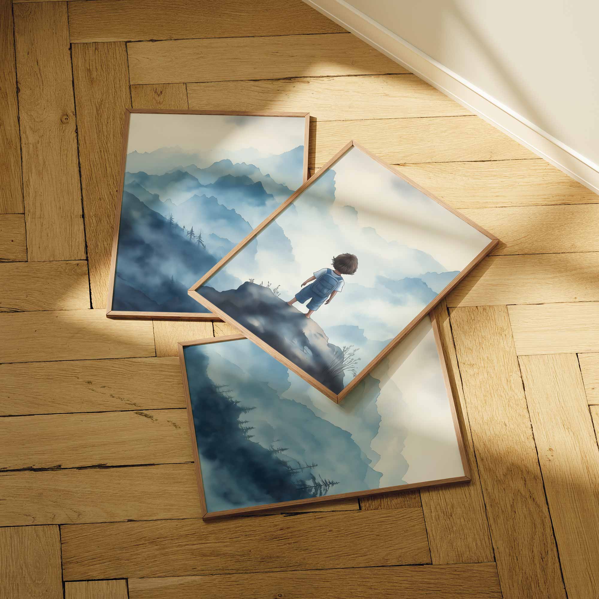 Terug naar collectie / Kinderkamer posters / Avontuurlijk posters / Jonge Avonturier in Mistige Bergen – Droom en Ontdek
