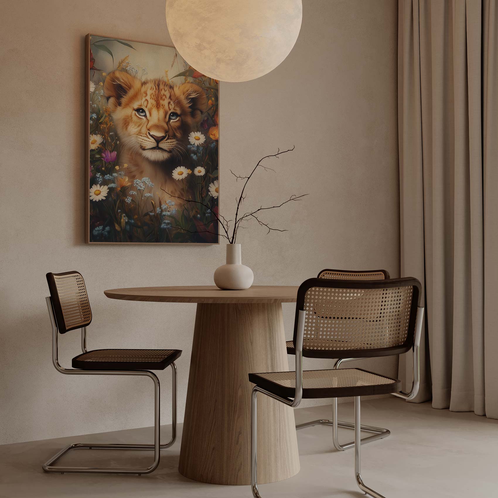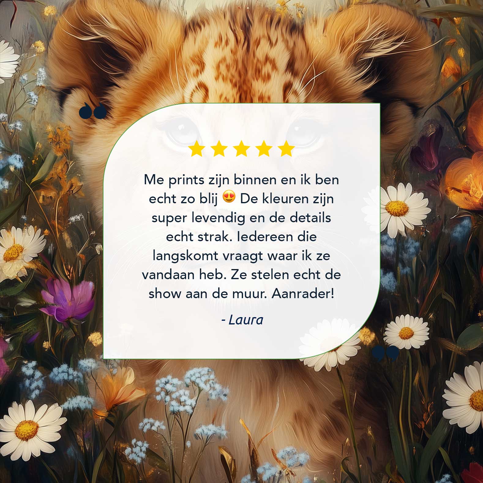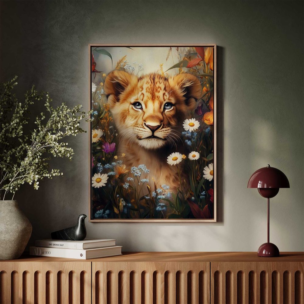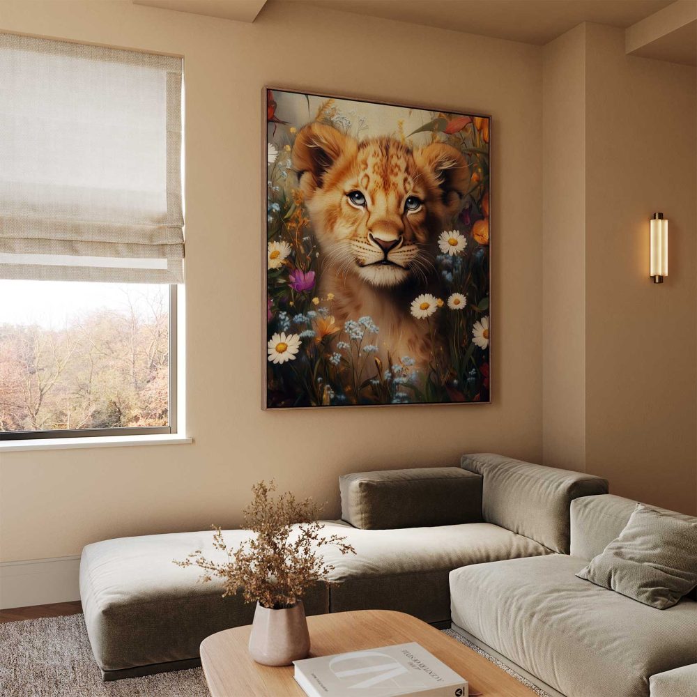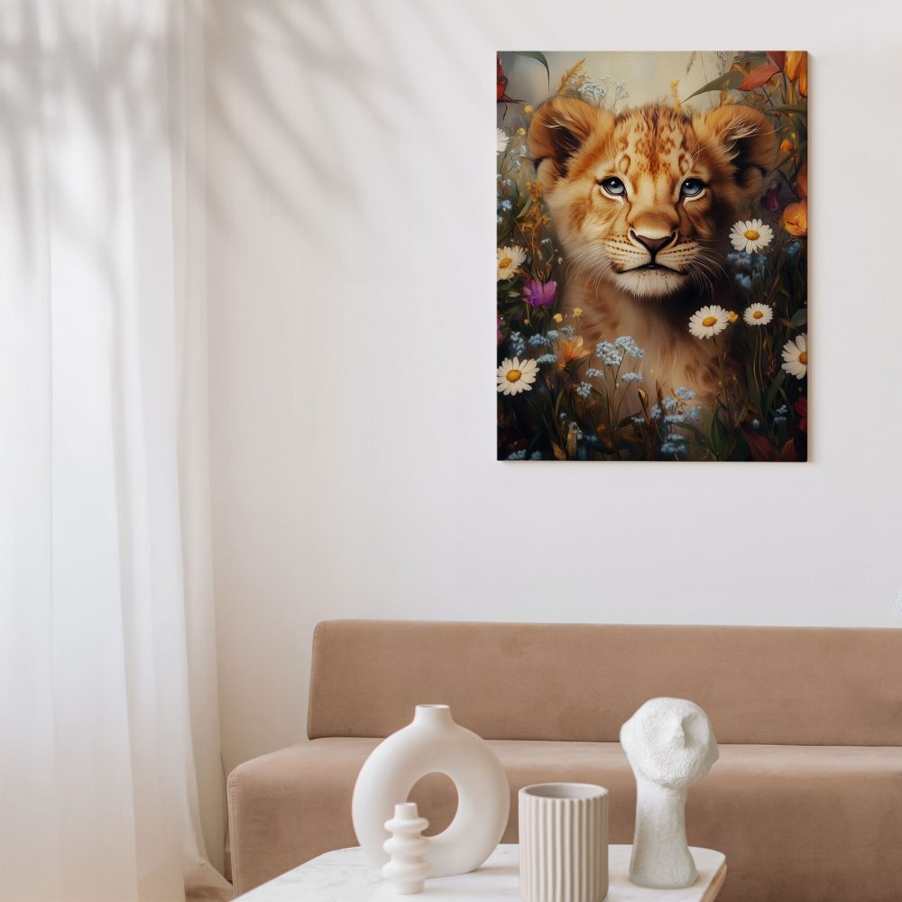 Terug naar collectie / Schilderijen / Bloemen Schilderij / Jonge leeuw in bloementuin
