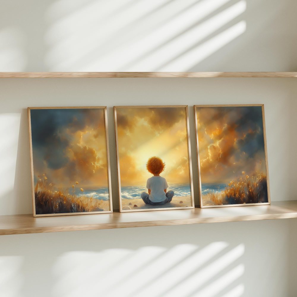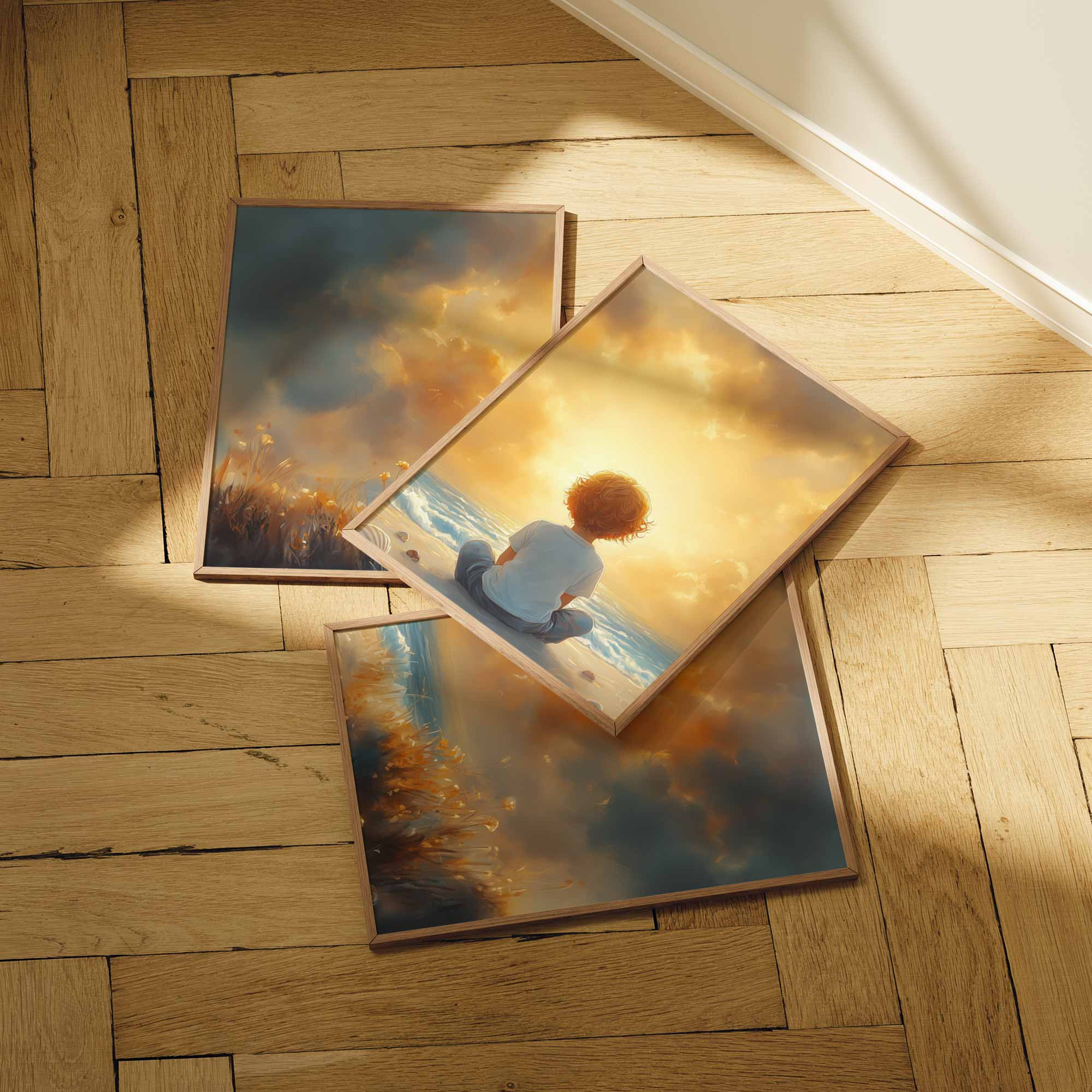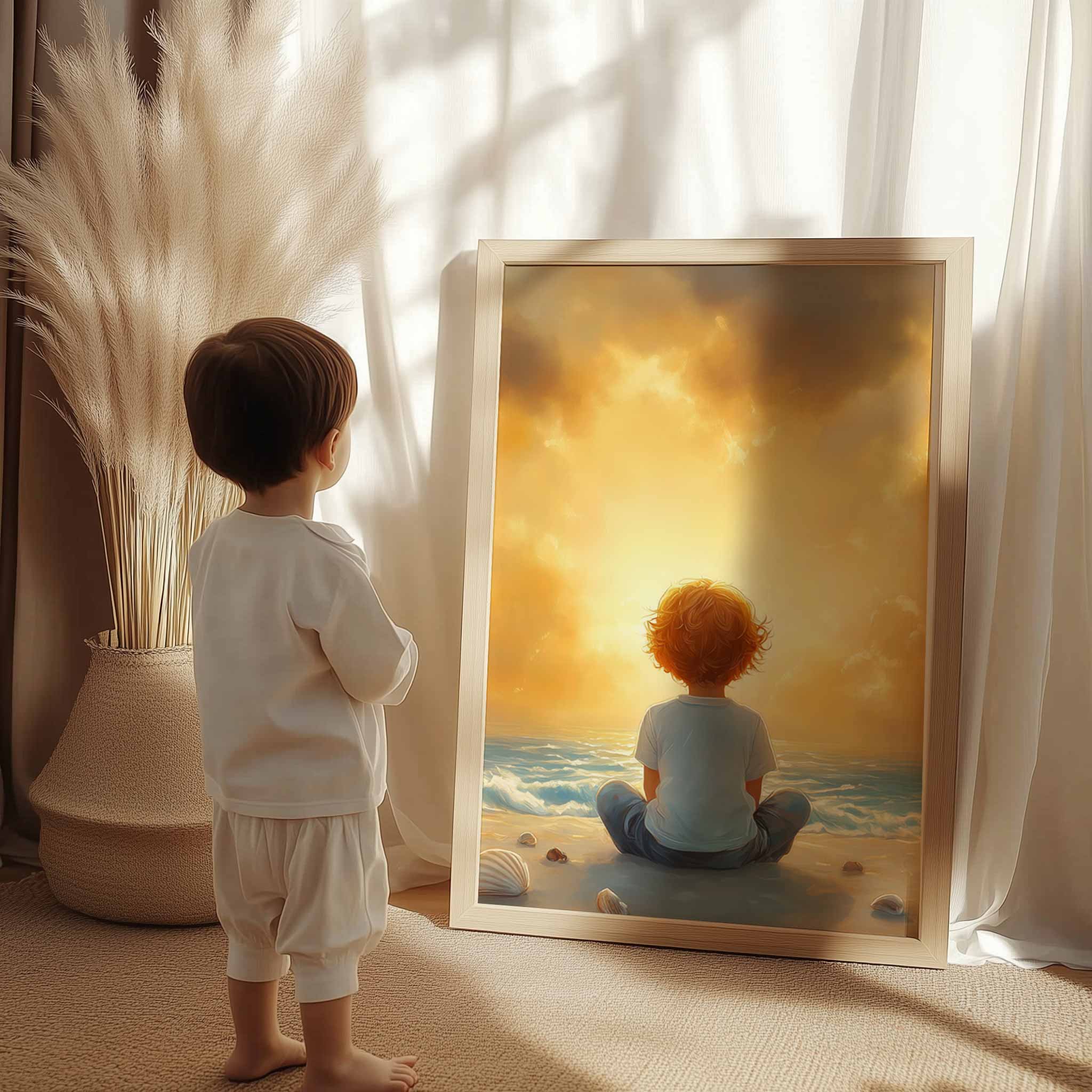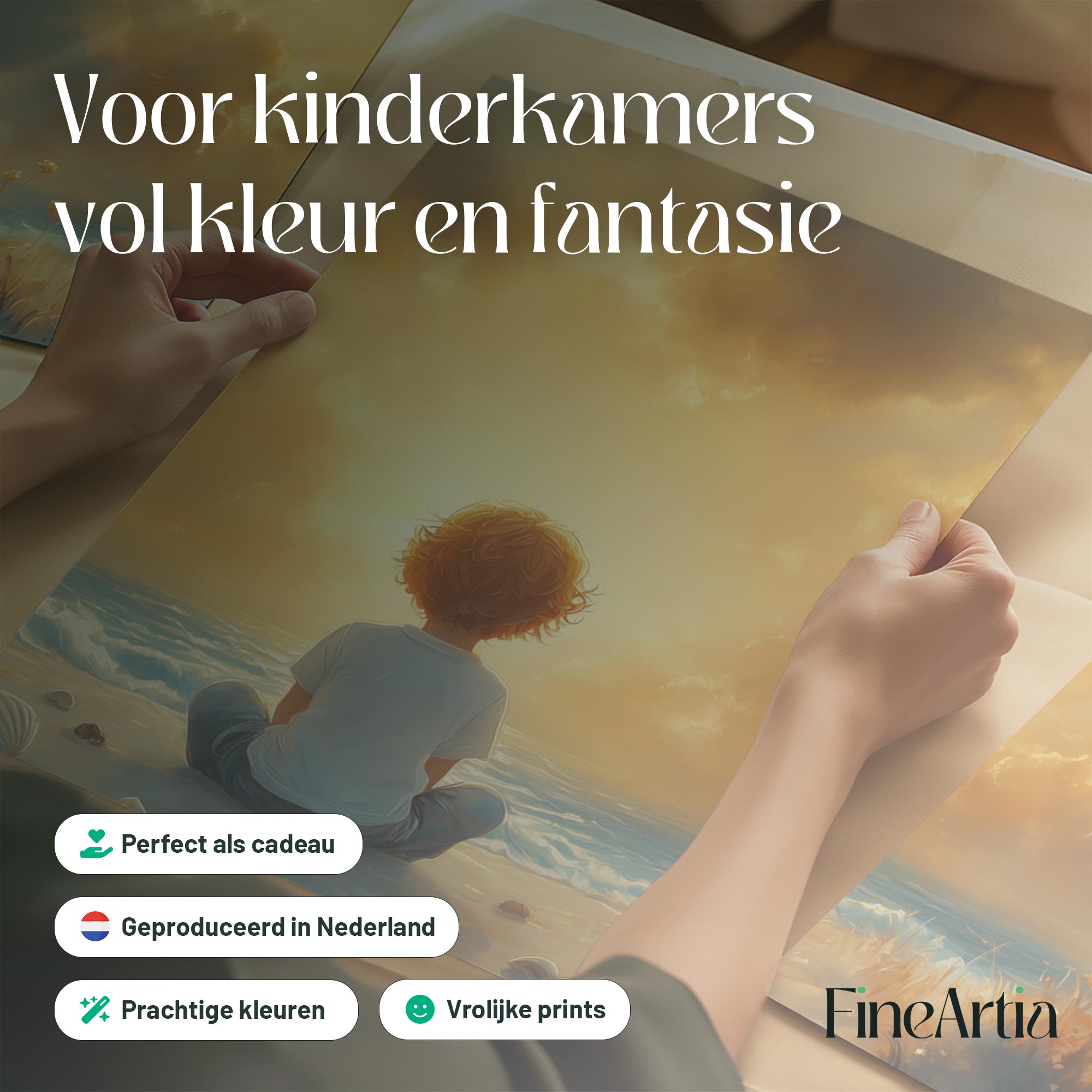 Terug naar collectie / Kinderkamer posters / Jongen aan zee: rustig strandtafereel in zachte tinten
