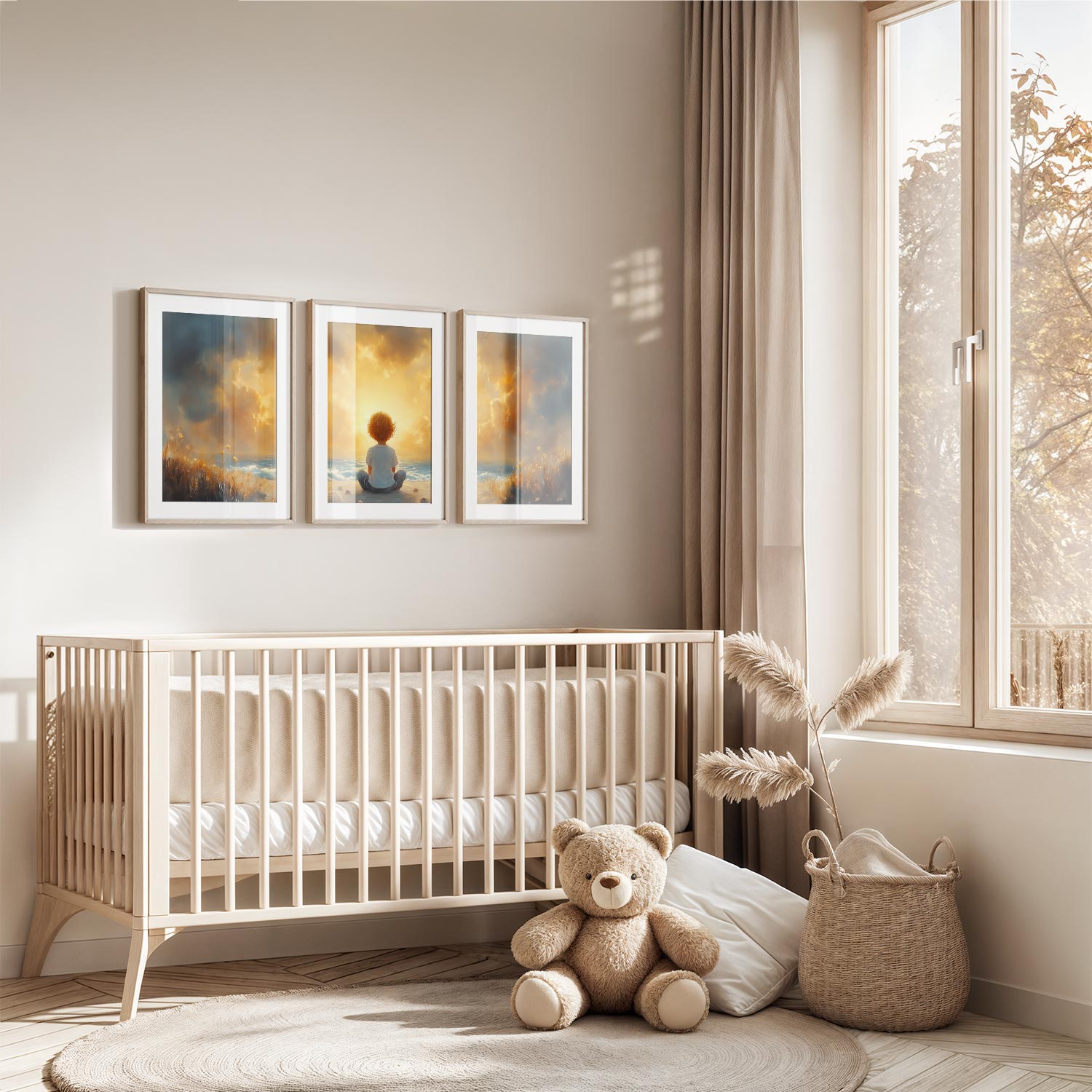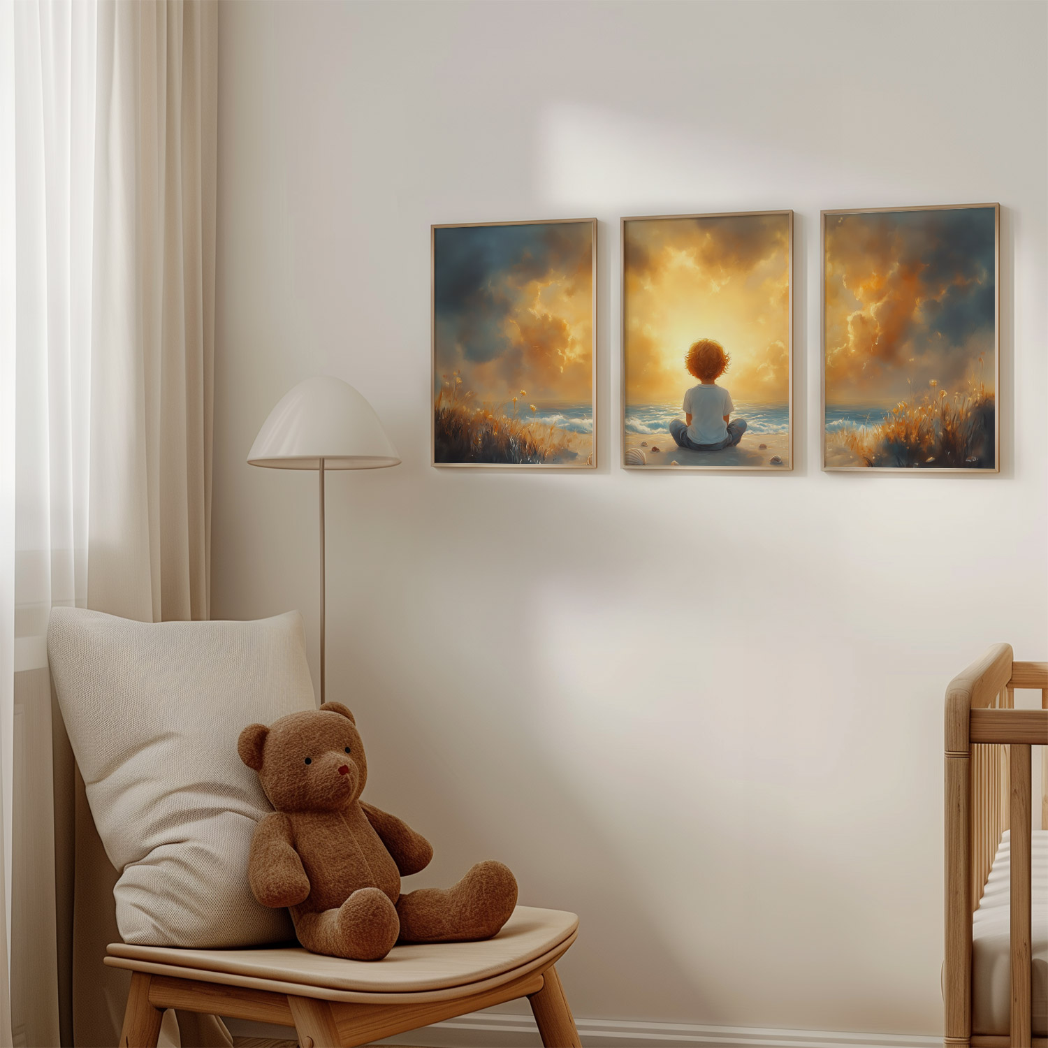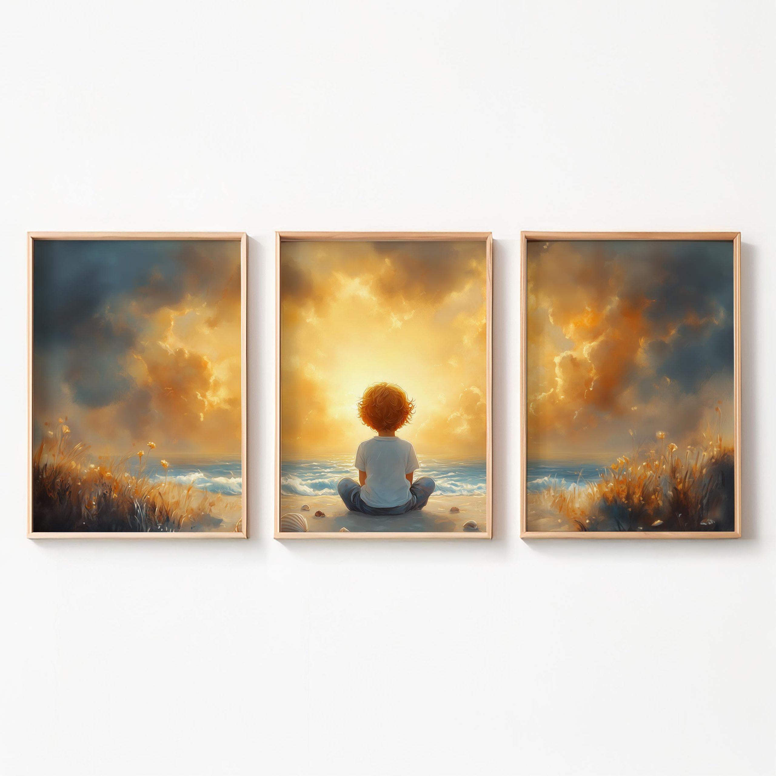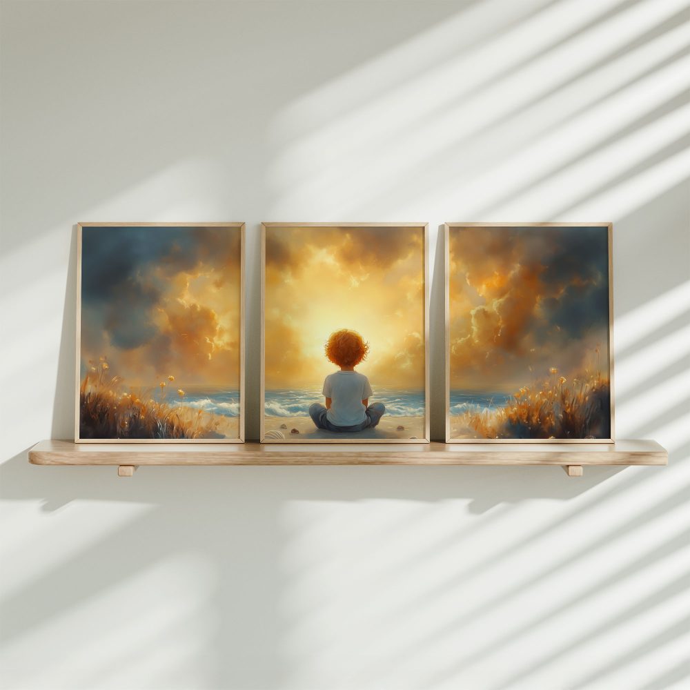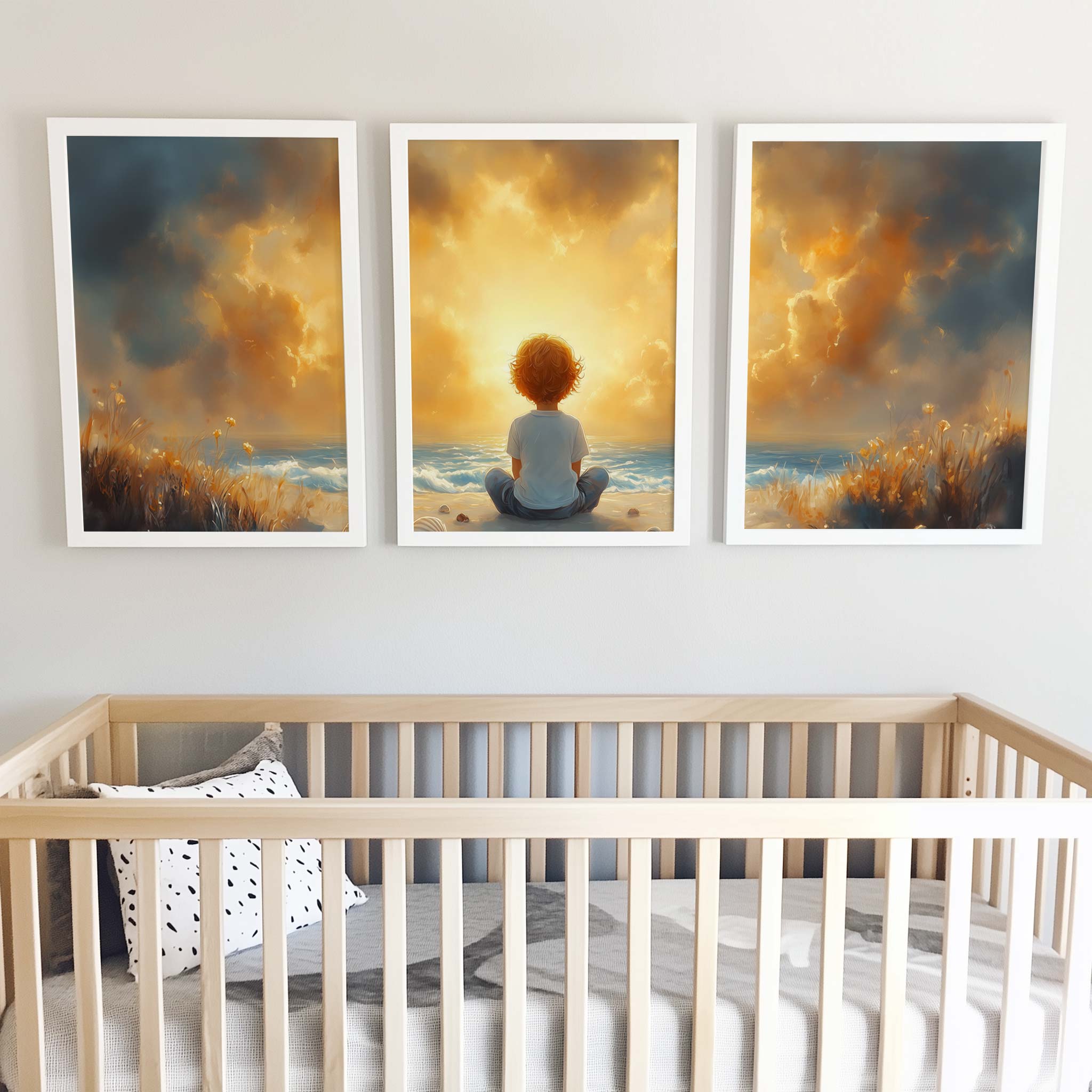 Terug naar collectie / Kinderkamer posters / Jongen aan zee: rustig strandtafereel in zachte tinten