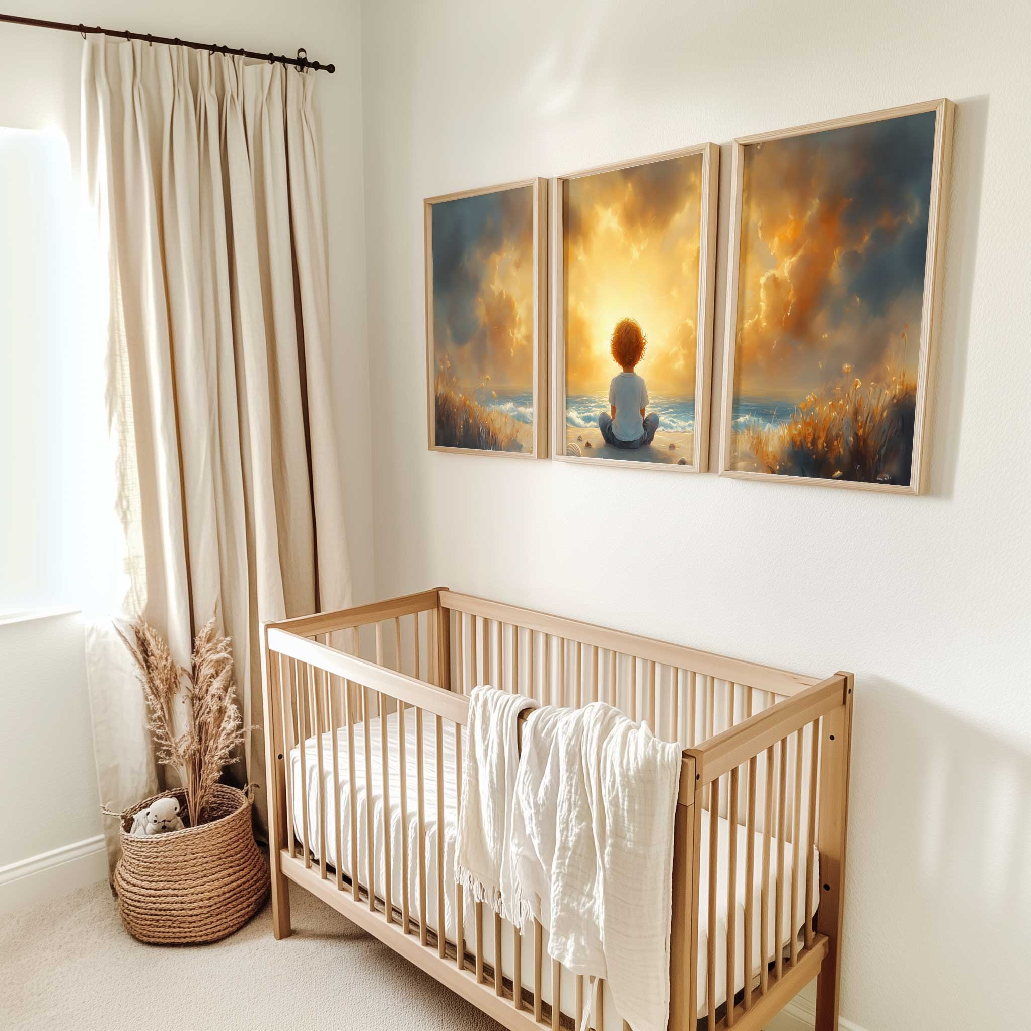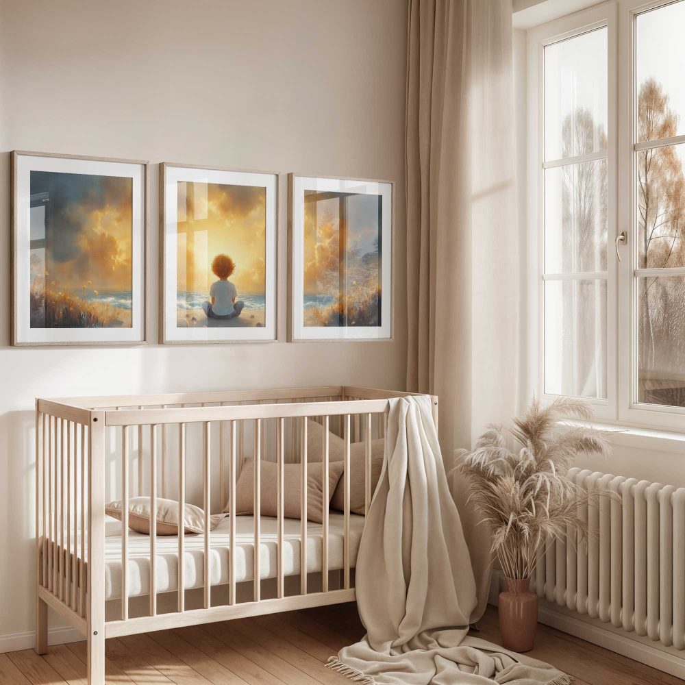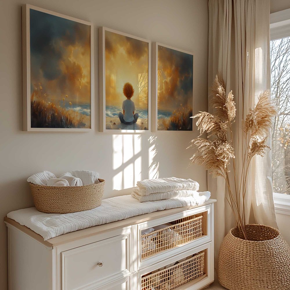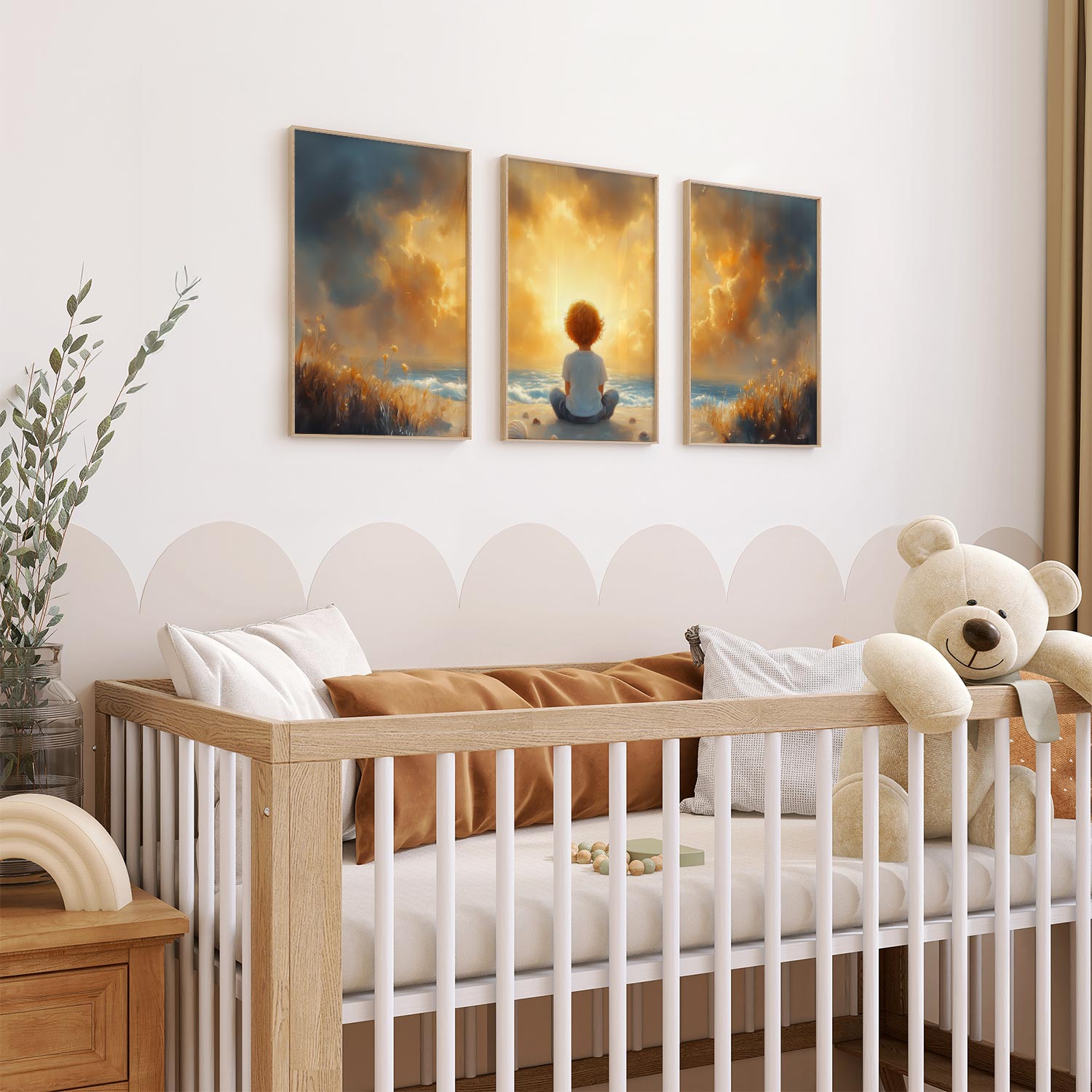 Terug naar collectie / Kinderkamer posters / Jongen aan zee: rustig strandtafereel in zachte tinten