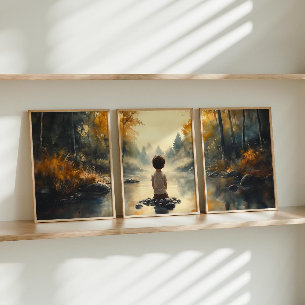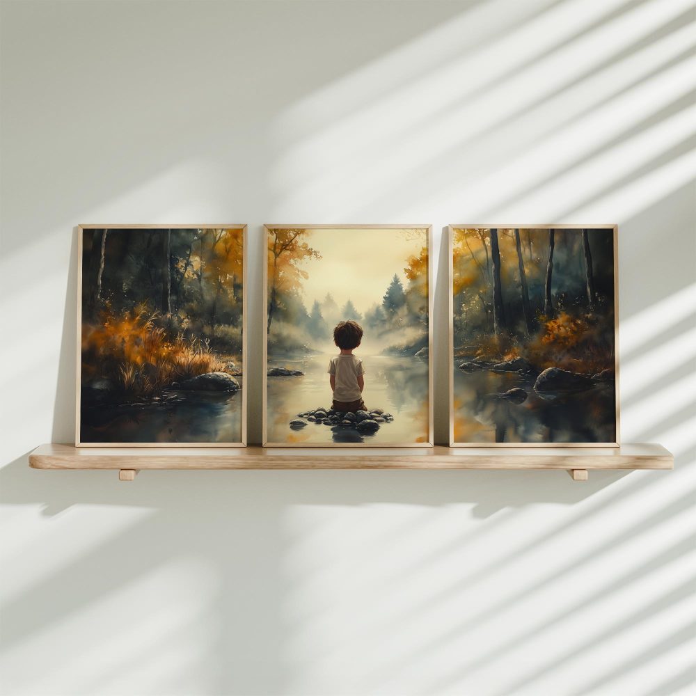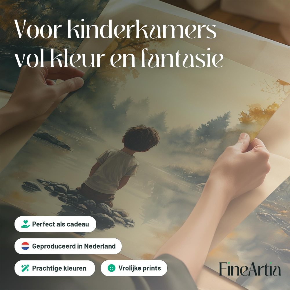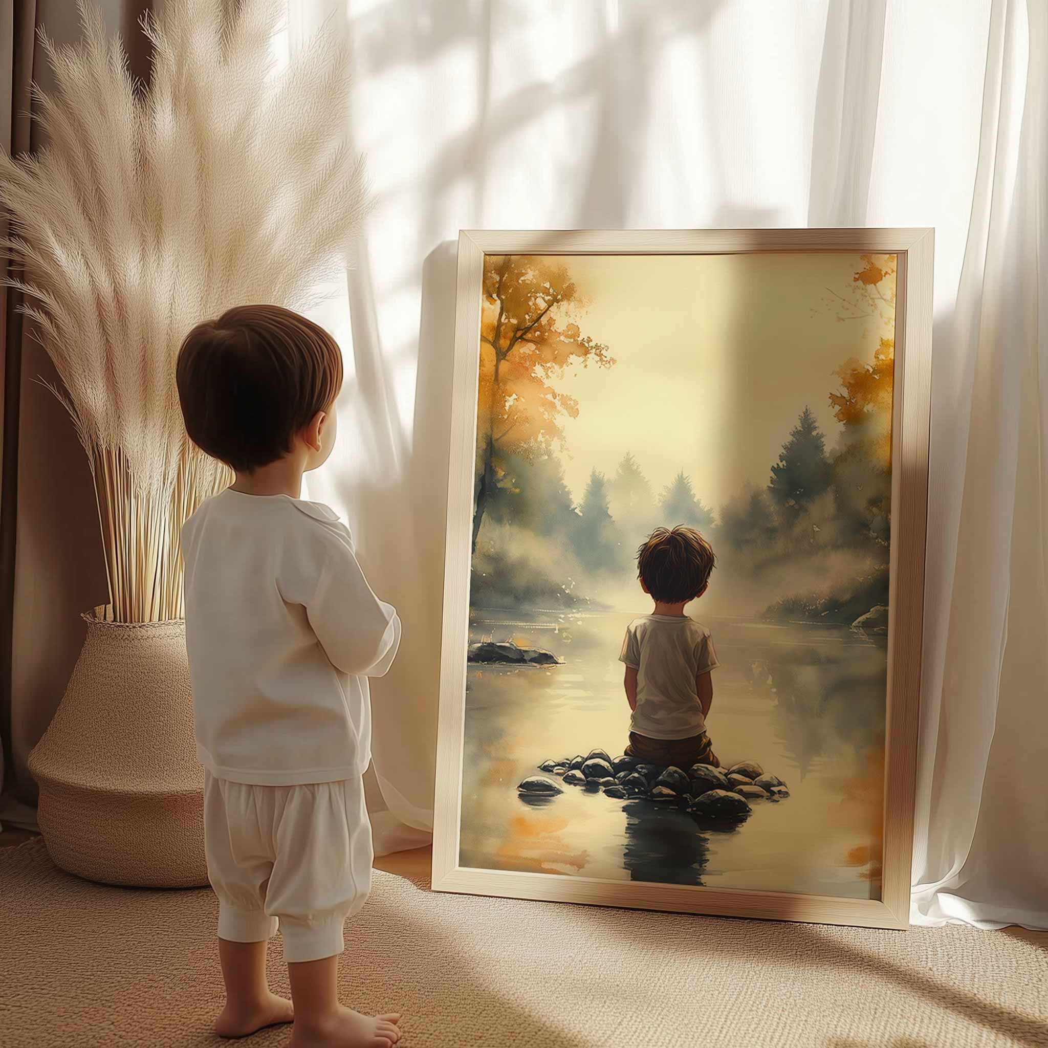 Terug naar collectie / Kinderkamer posters / Jongen bij de rivier: Dromerig herfsttafereel
