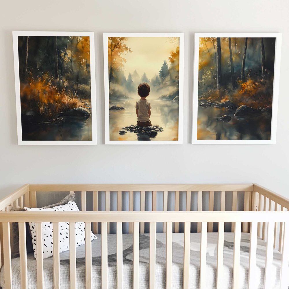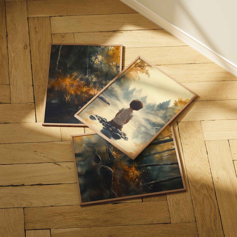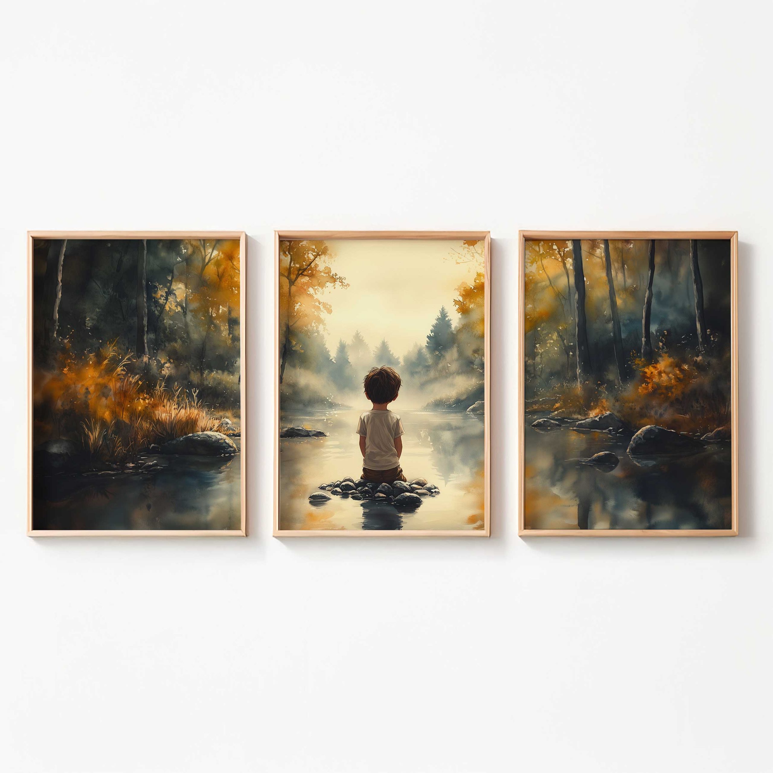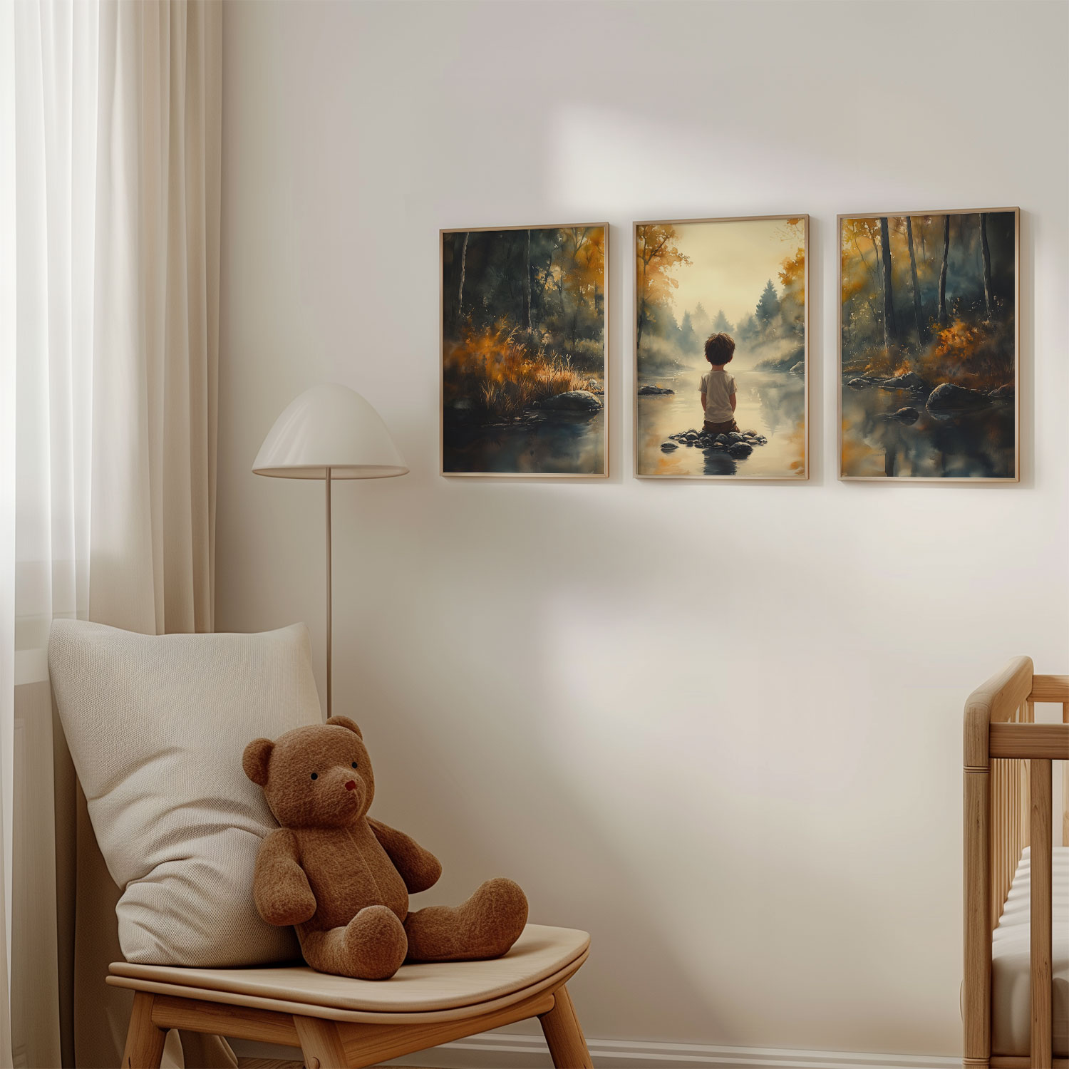 Terug naar collectie / Kinderkamer posters / Jongen bij de rivier: Dromerig herfsttafereel