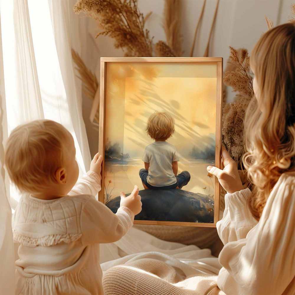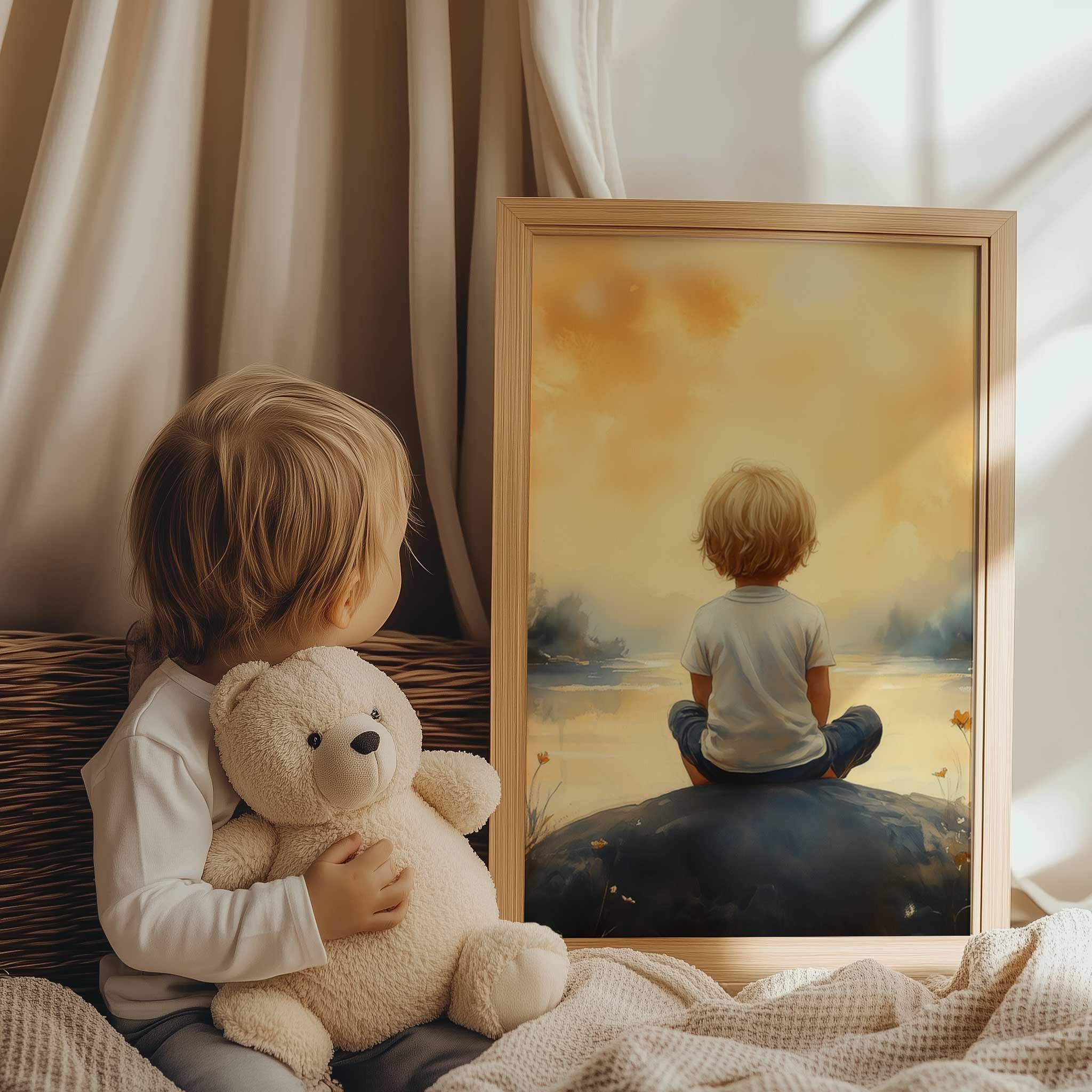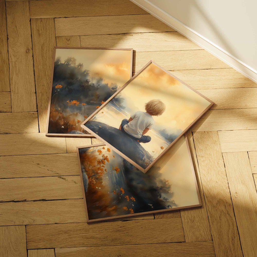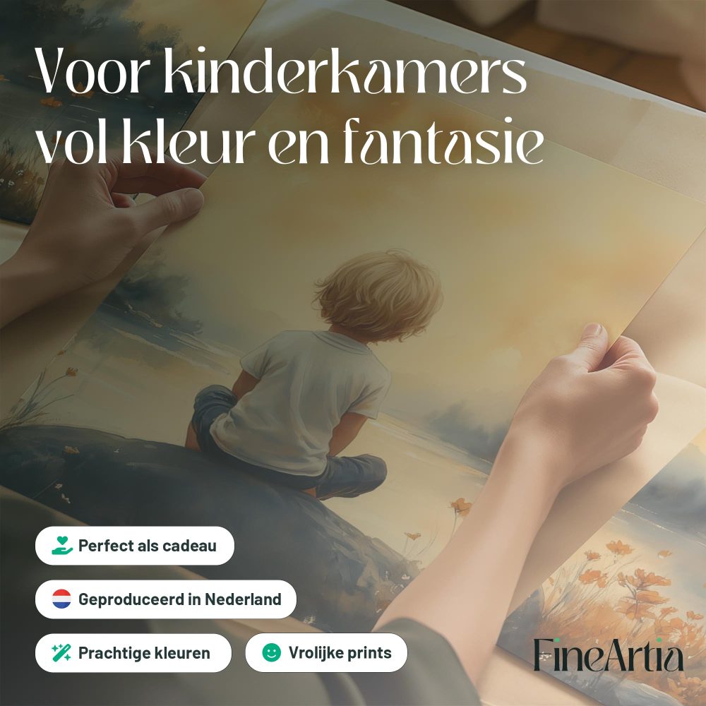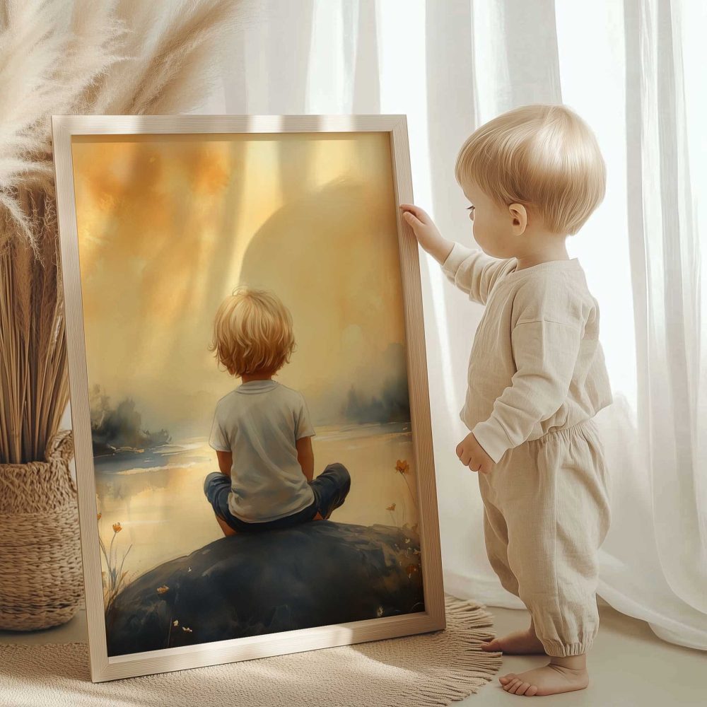 Terug naar collectie / Kinderkamer posters / Bloemen posters / Jongen bij het meer: warm en vredig landschap