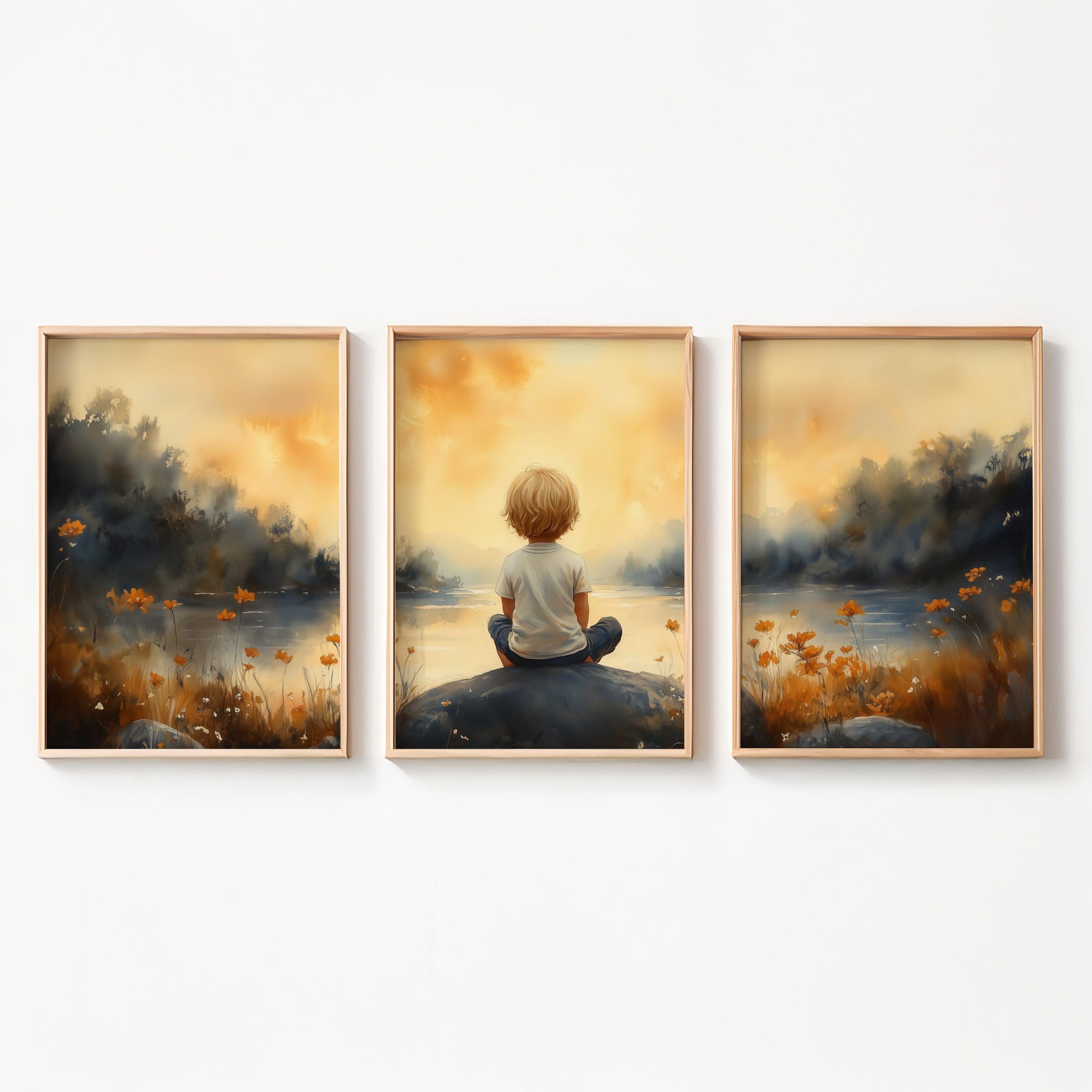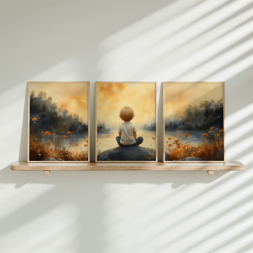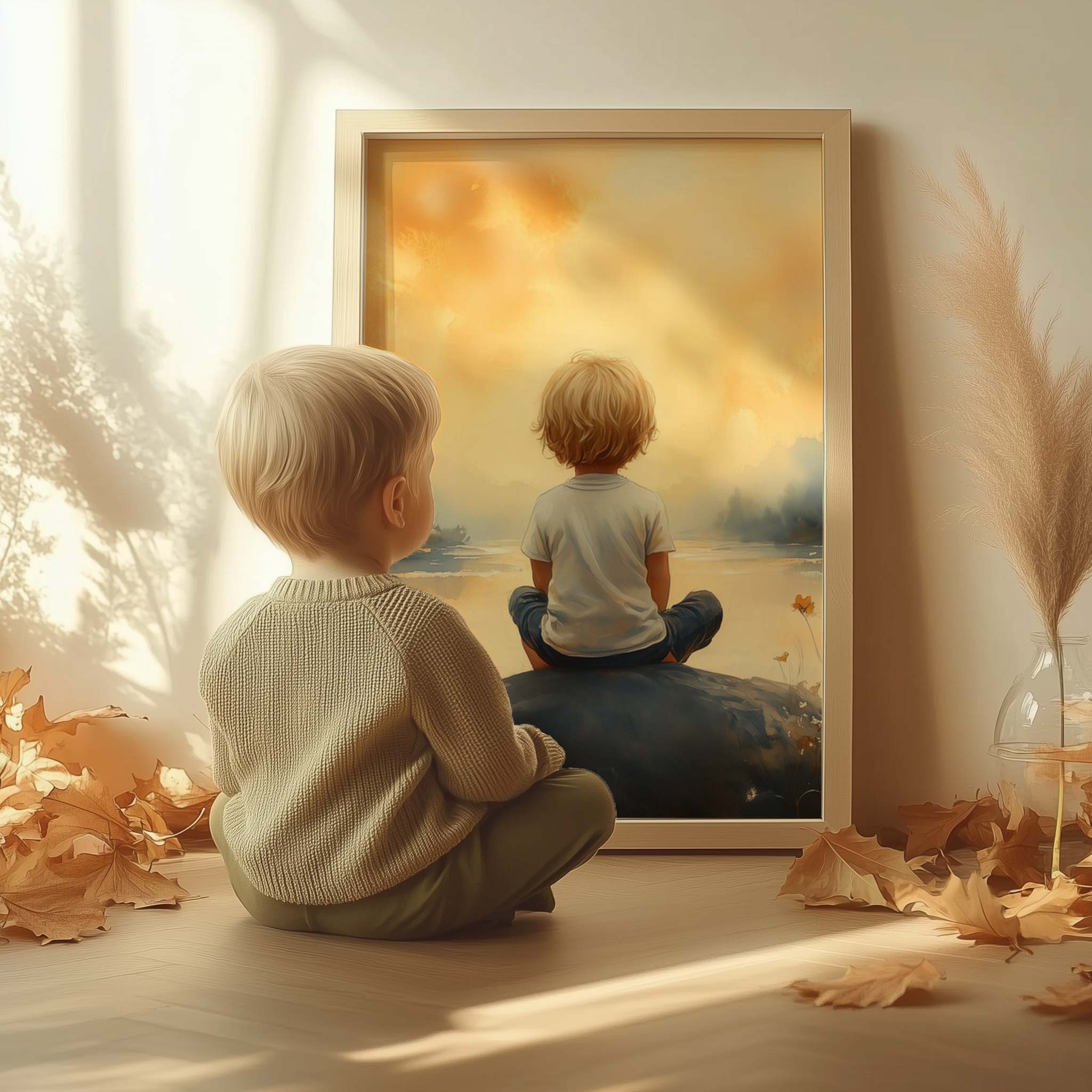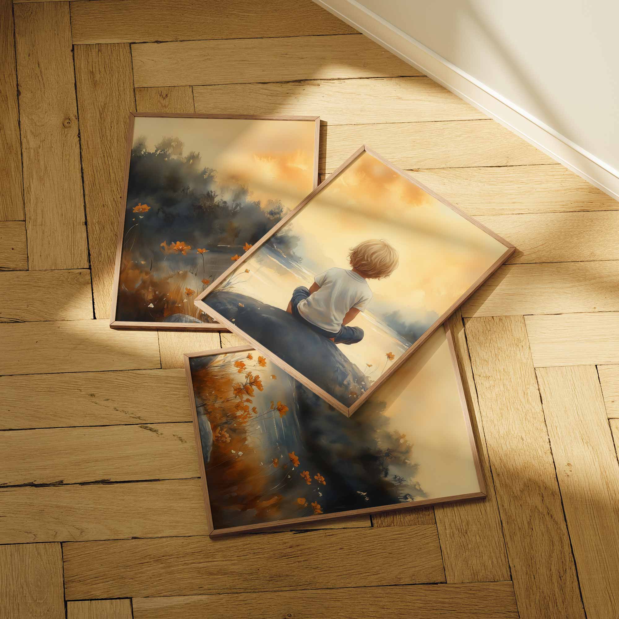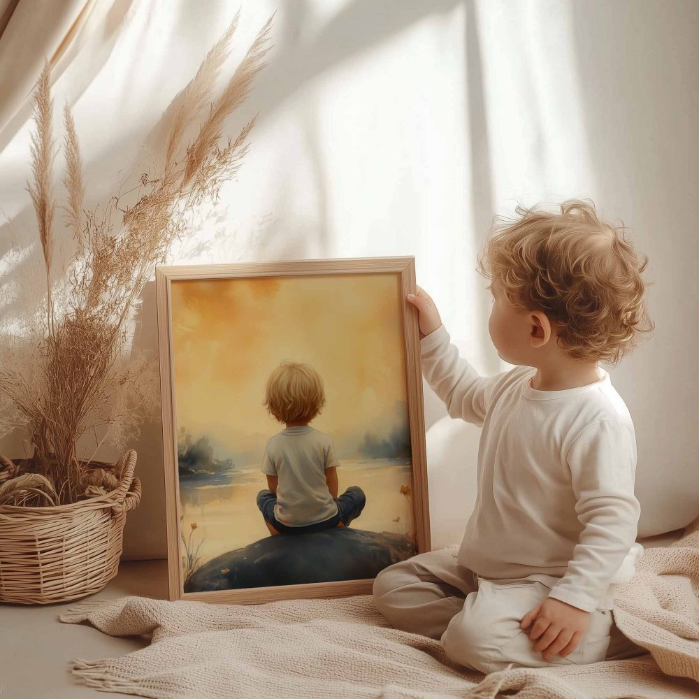 Terug naar collectie / Kinderkamer posters / Bloemen posters / Jongen bij het meer: warm en vredig landschap