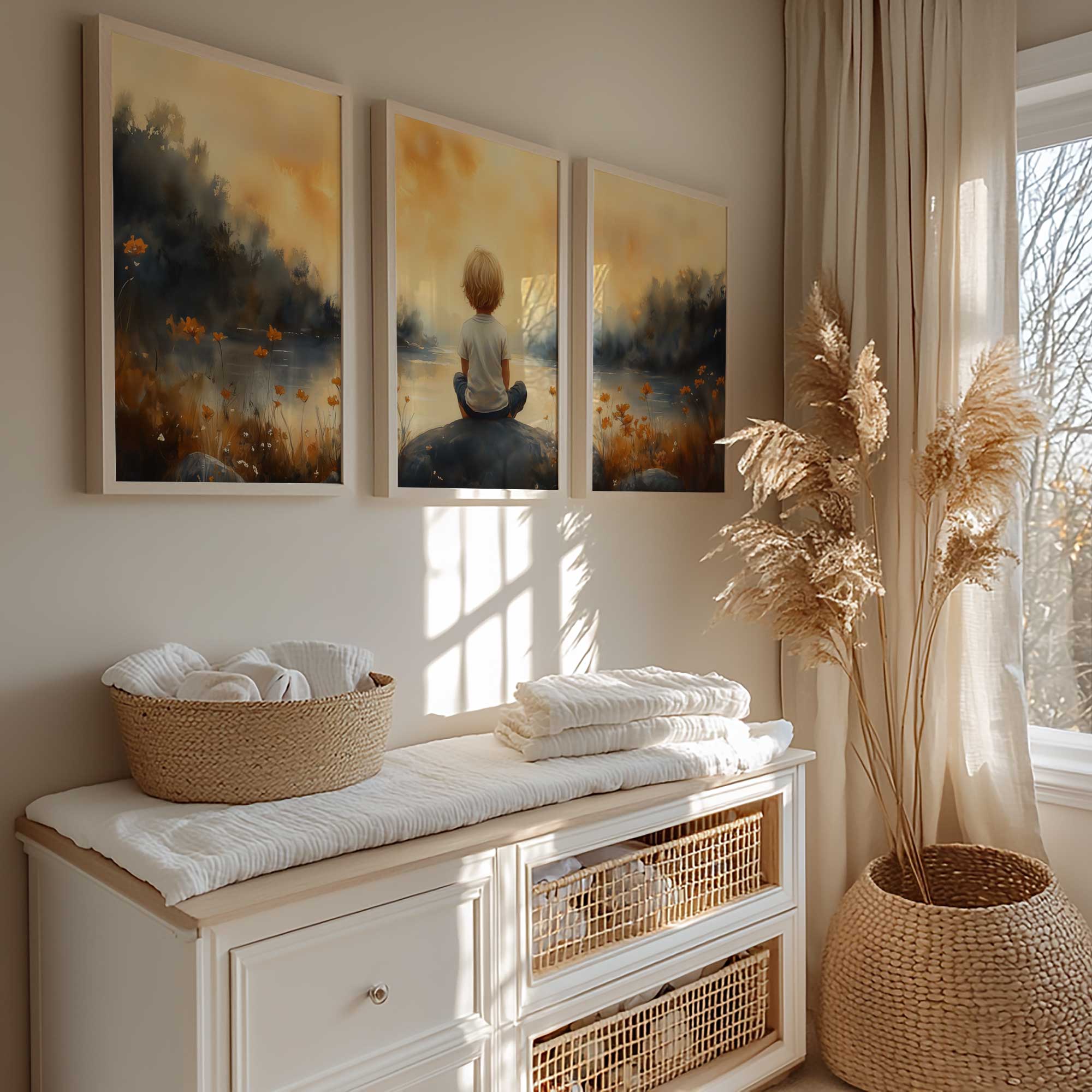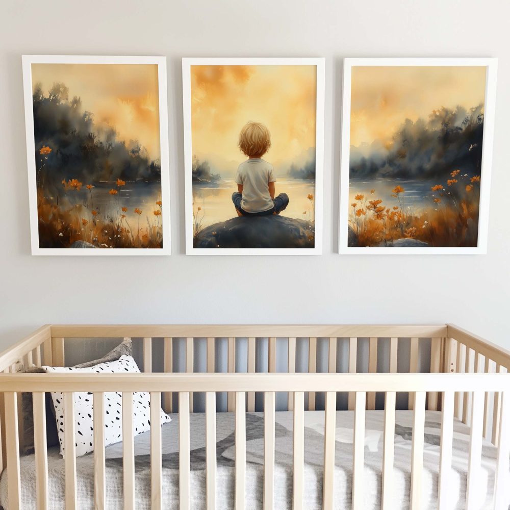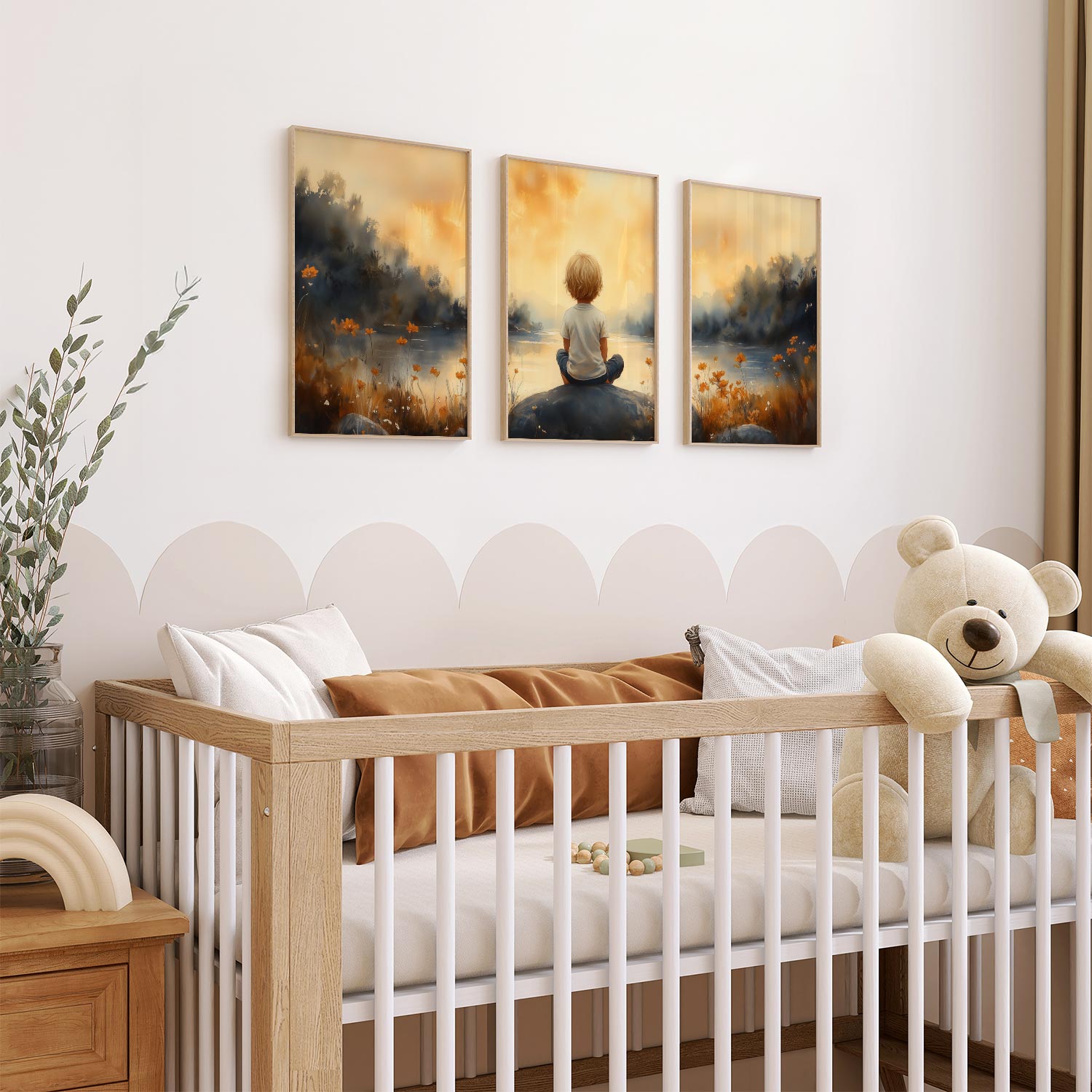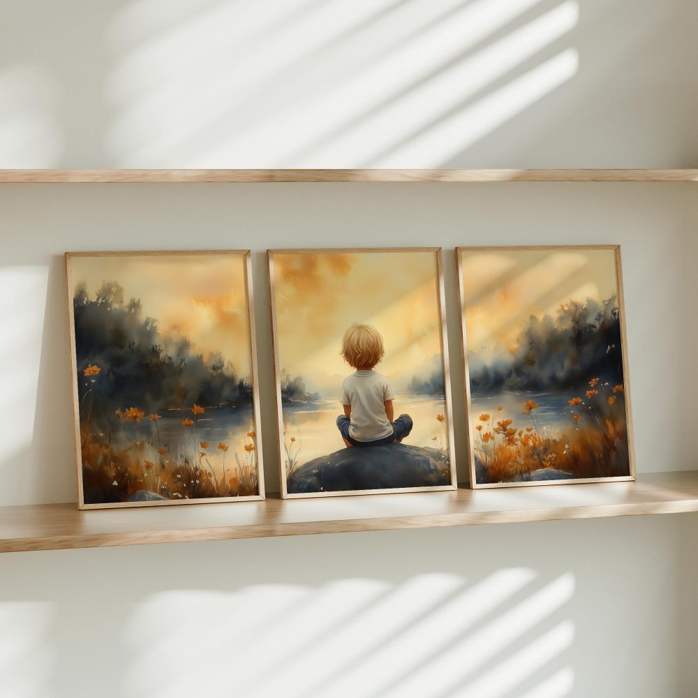 Terug naar collectie / Kinderkamer posters / Bloemen posters / Jongen bij het meer: warm en vredig landschap
