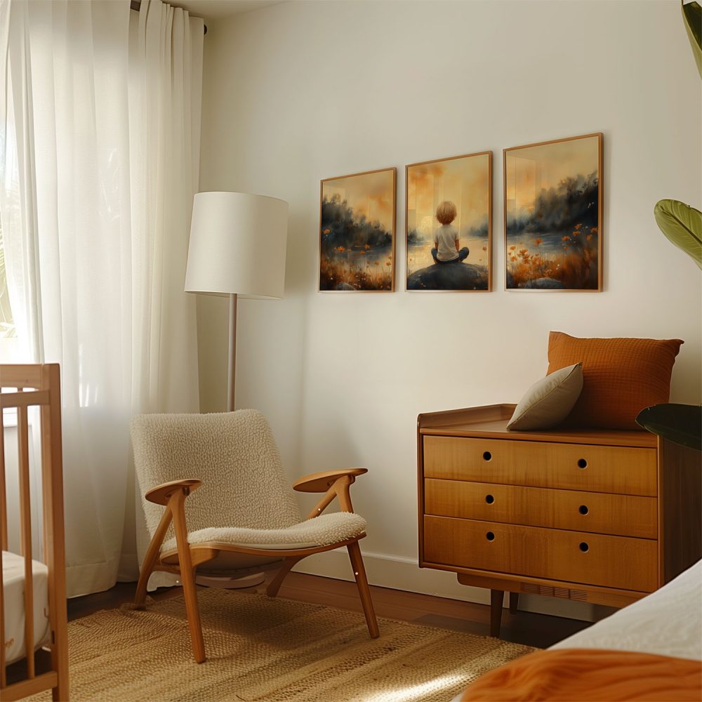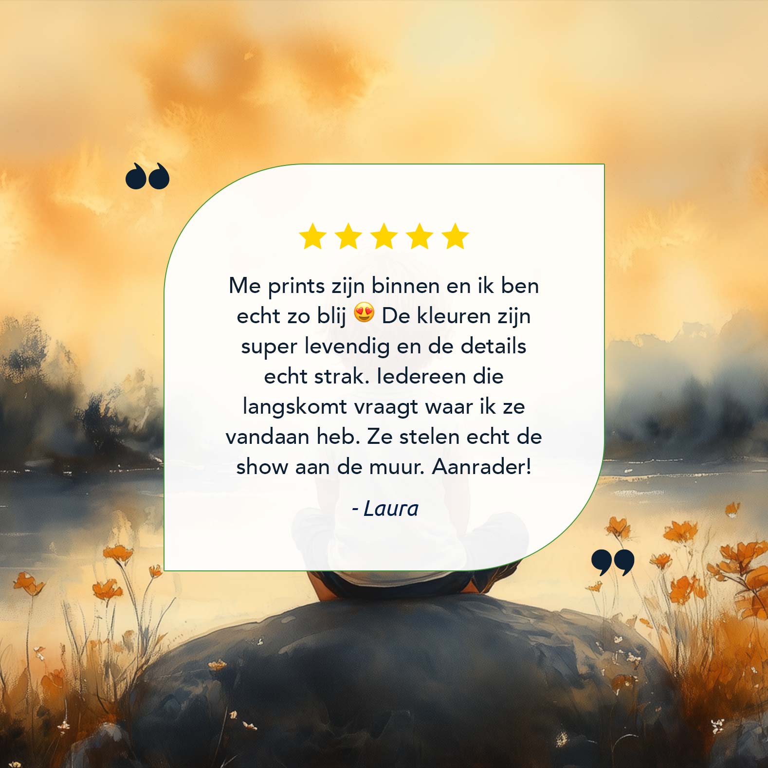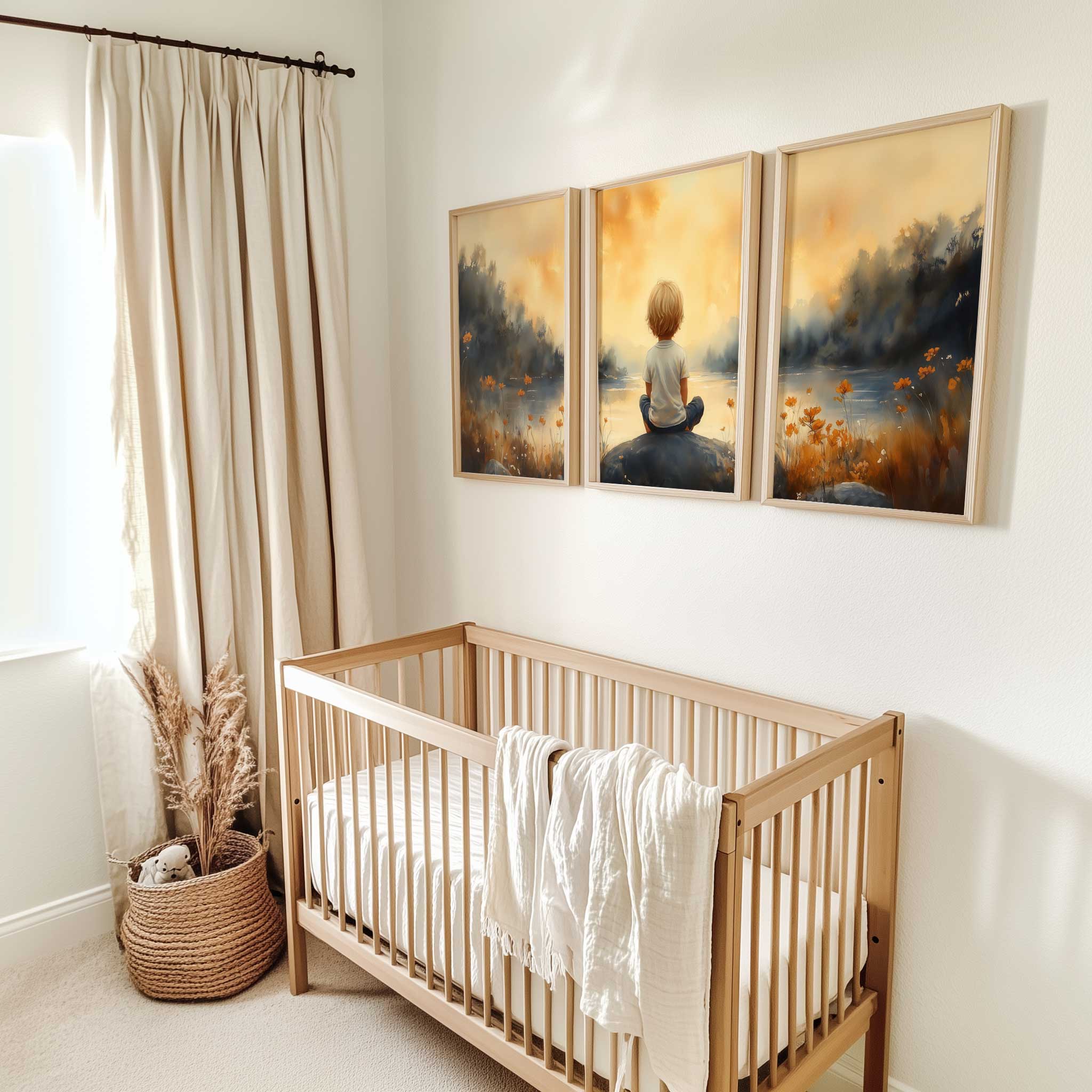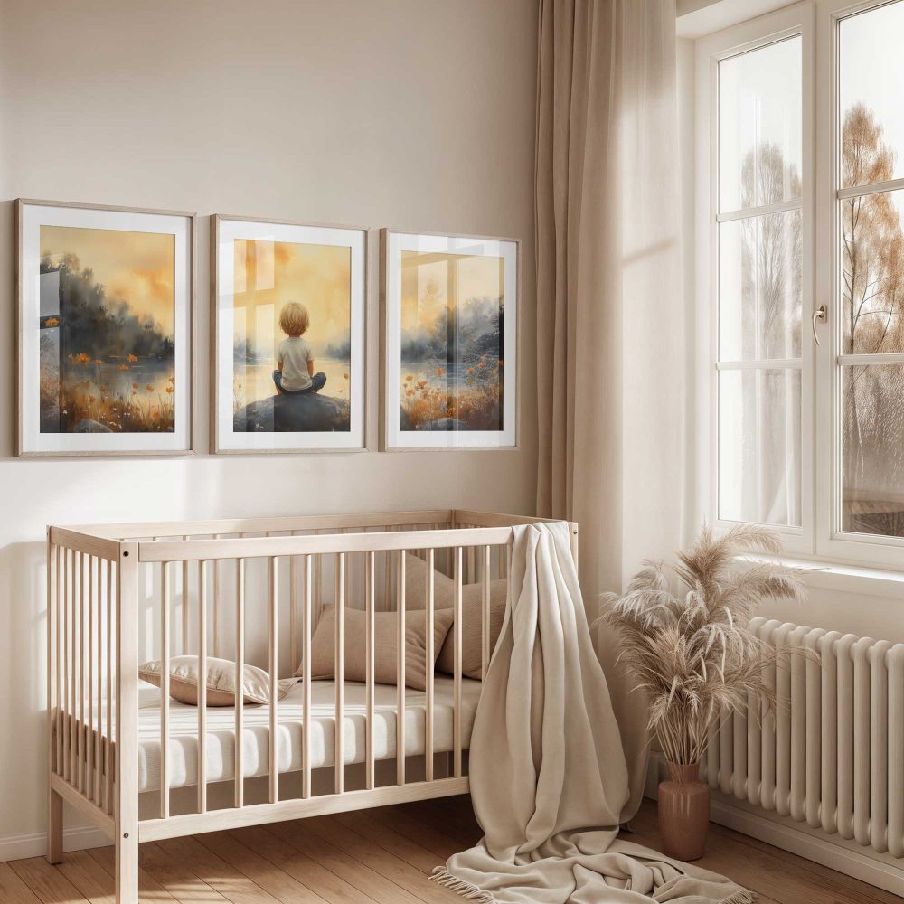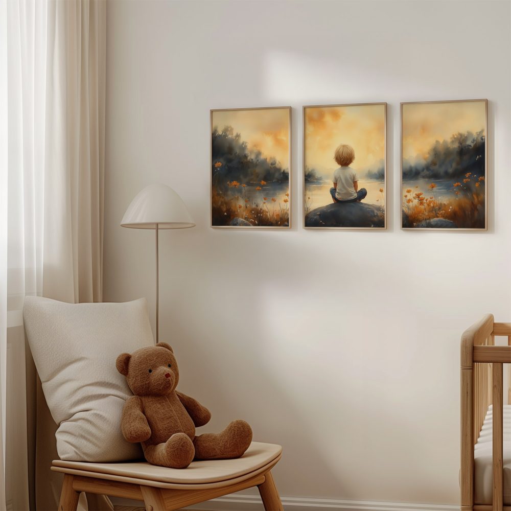 Terug naar collectie / Kinderkamer posters / Bloemen posters / Jongen bij het meer: warm en vredig landschap