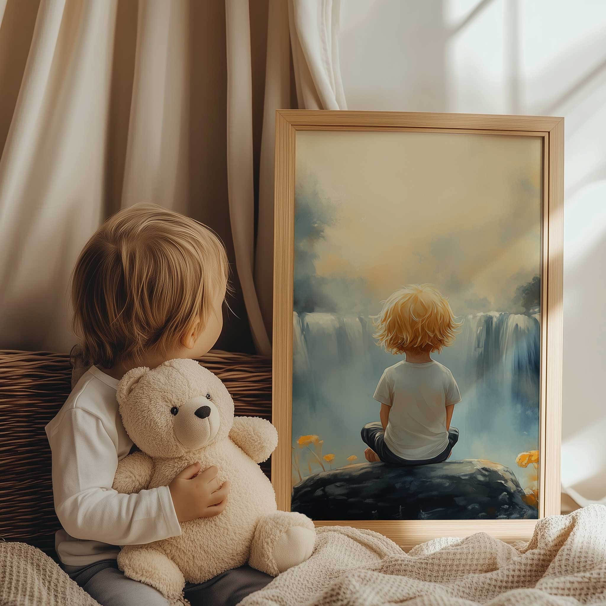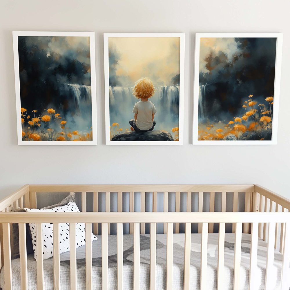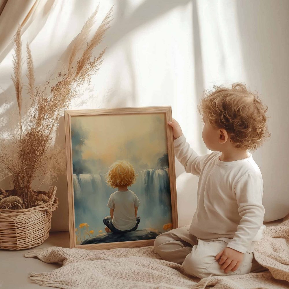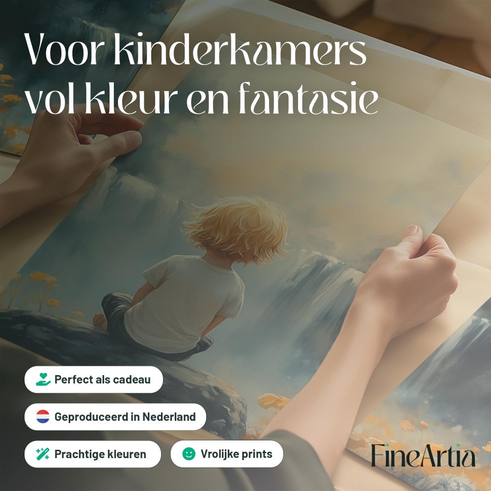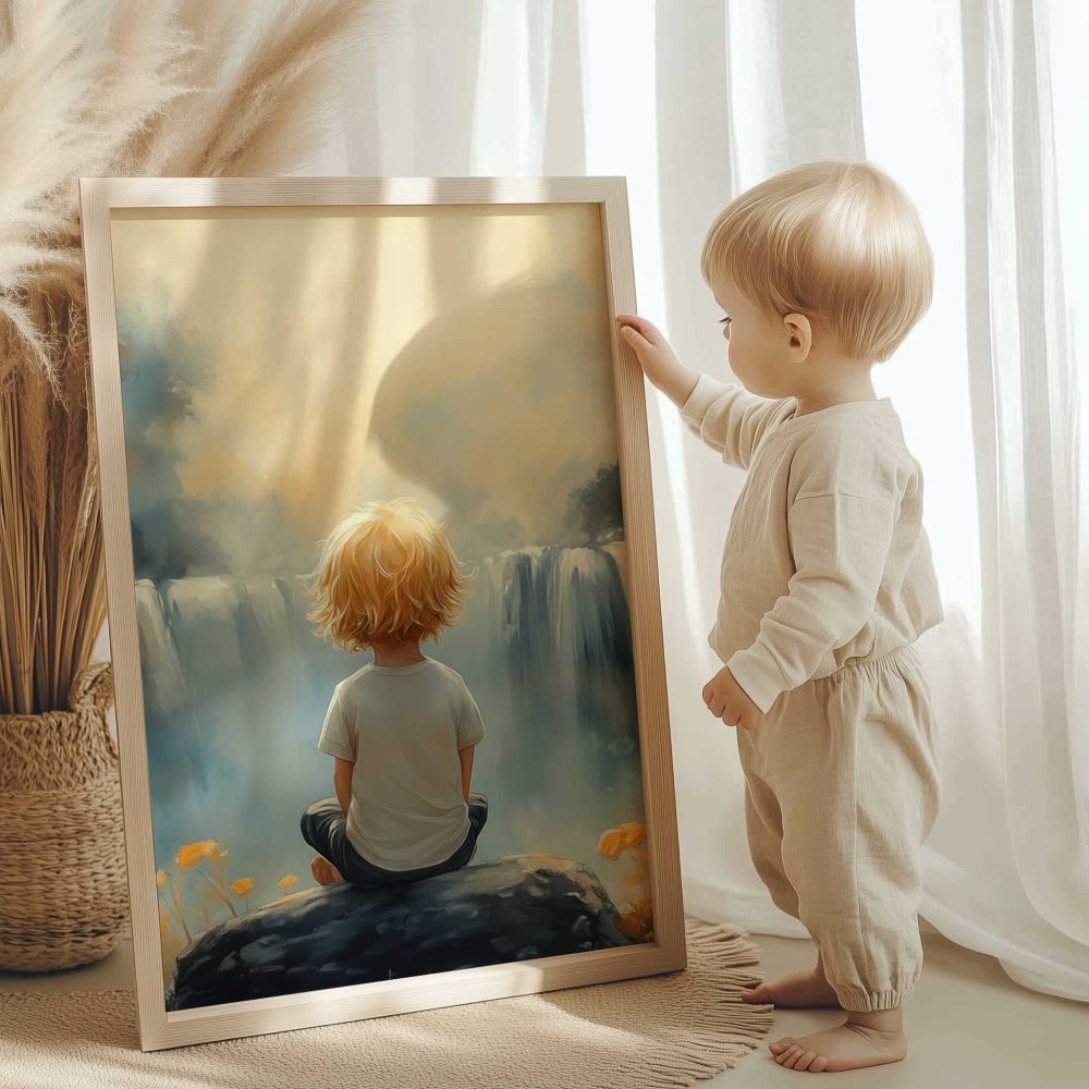 Terug naar collectie / Kinderkamer posters / Bloemen posters / Jongen bij waterval in dromerig bloemenveld