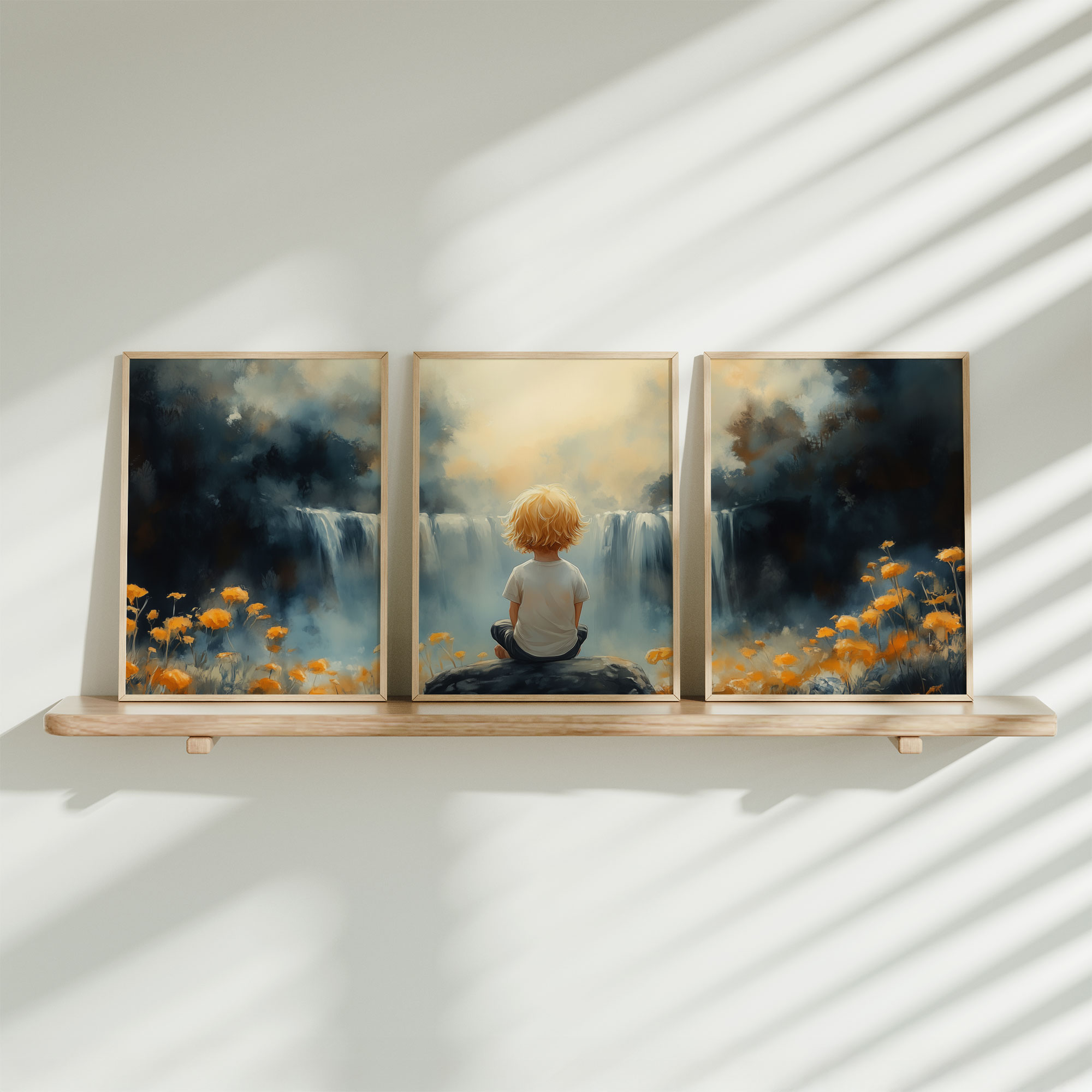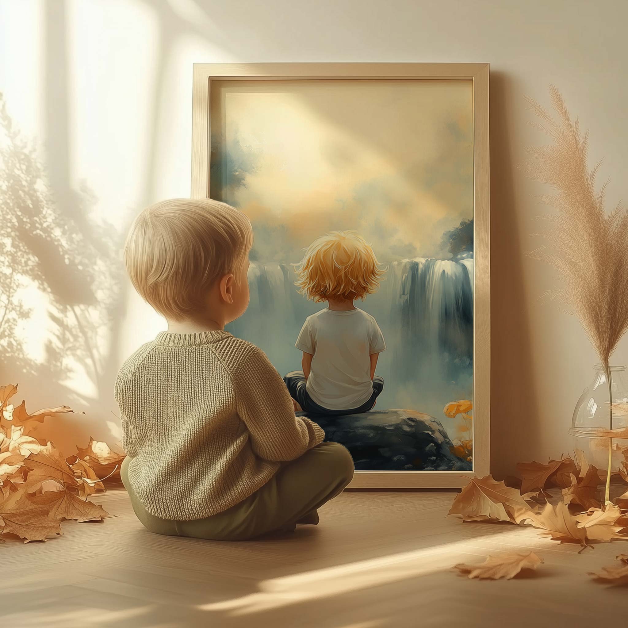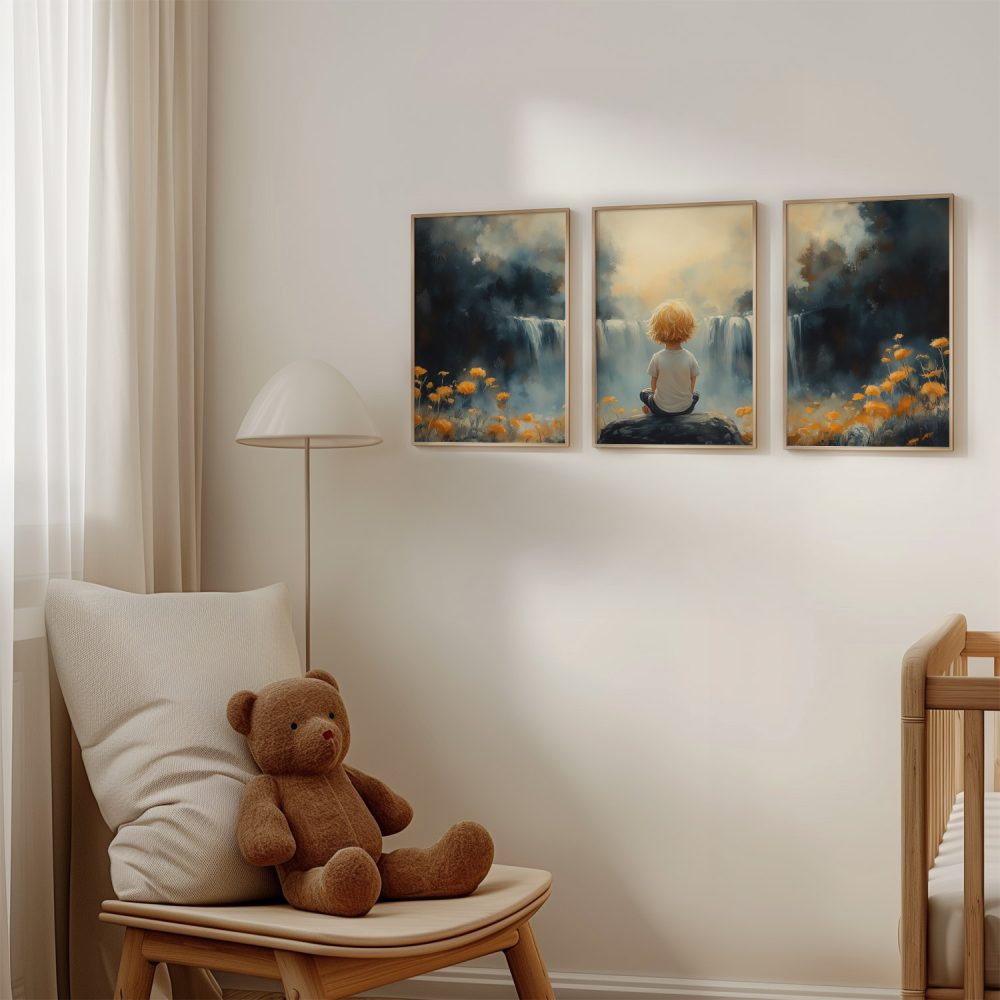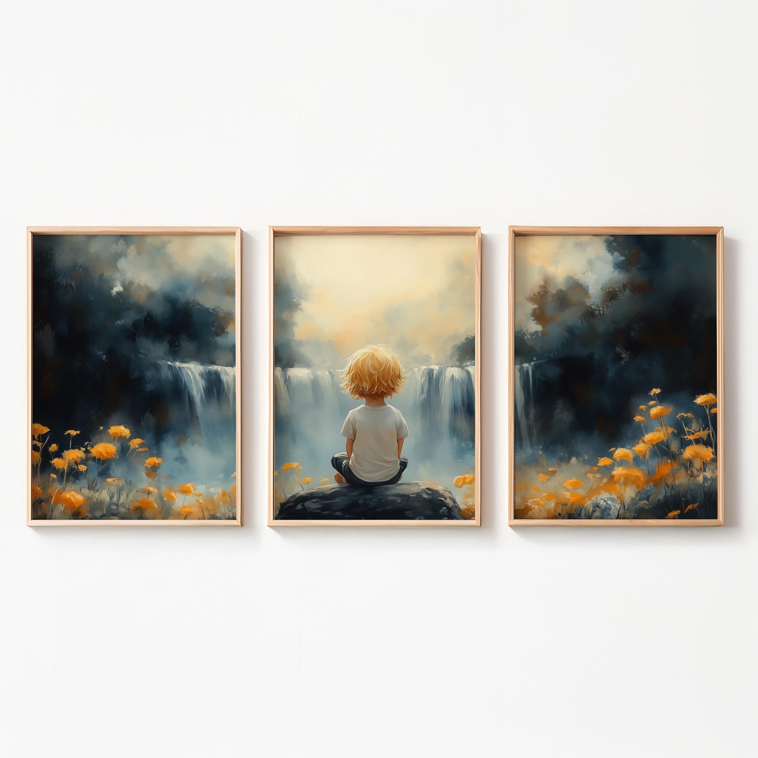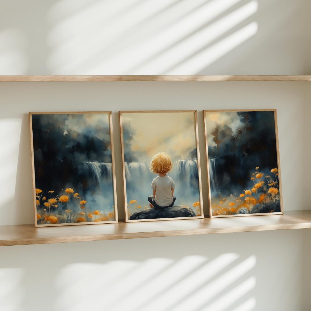Terug naar collectie / Kinderkamer posters / Bloemen posters / Jongen bij waterval in dromerig bloemenveld