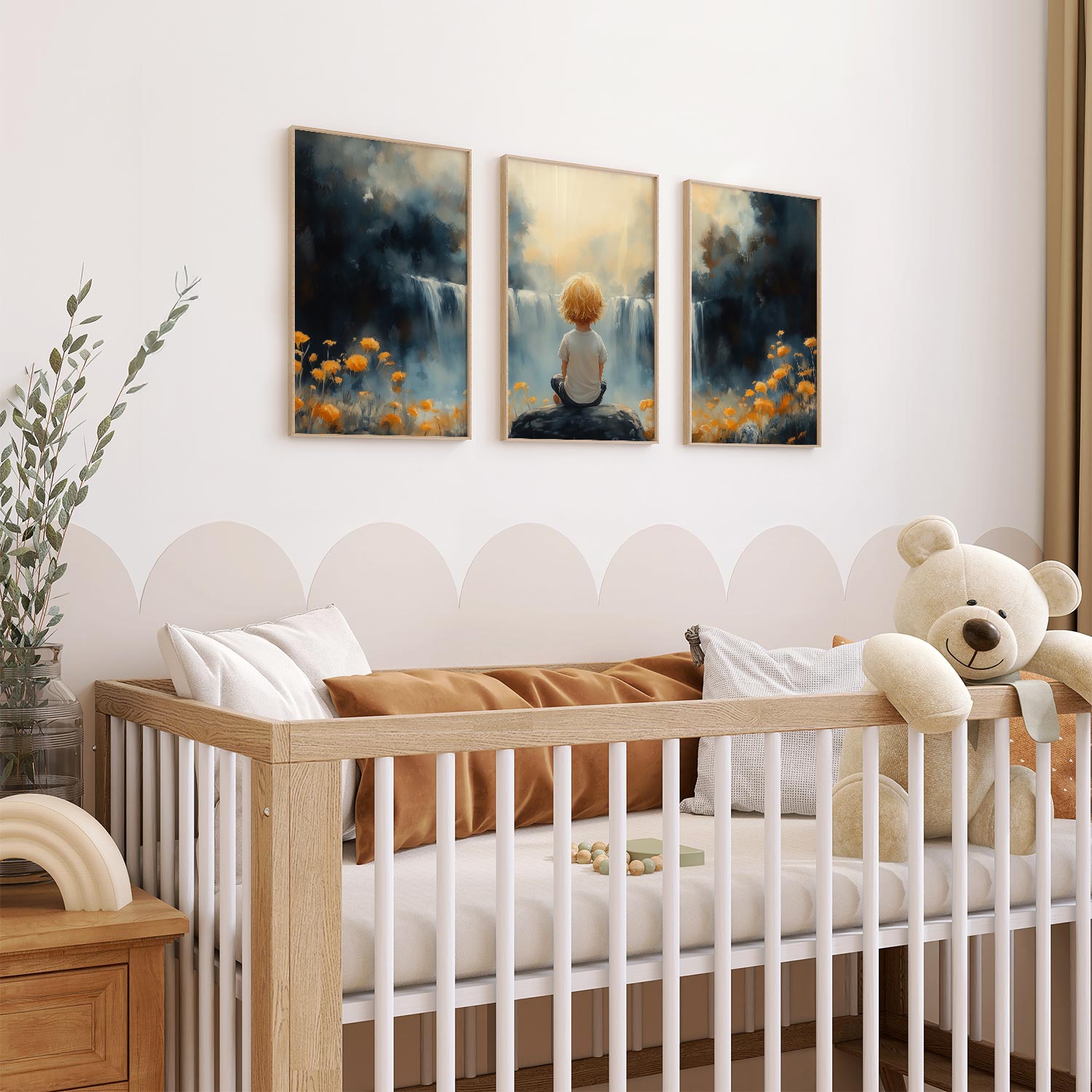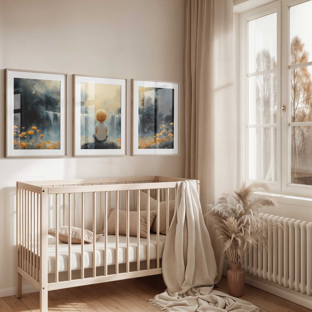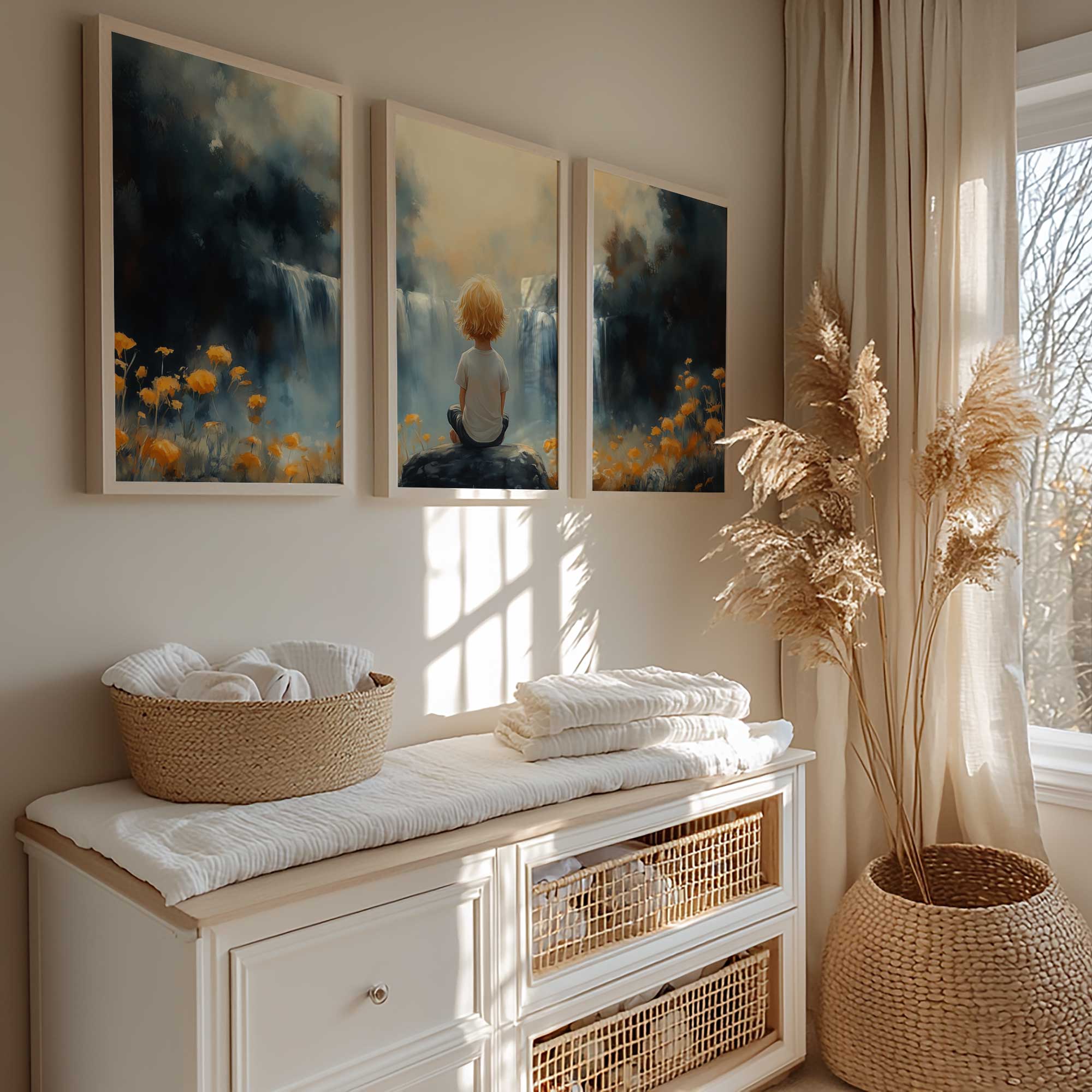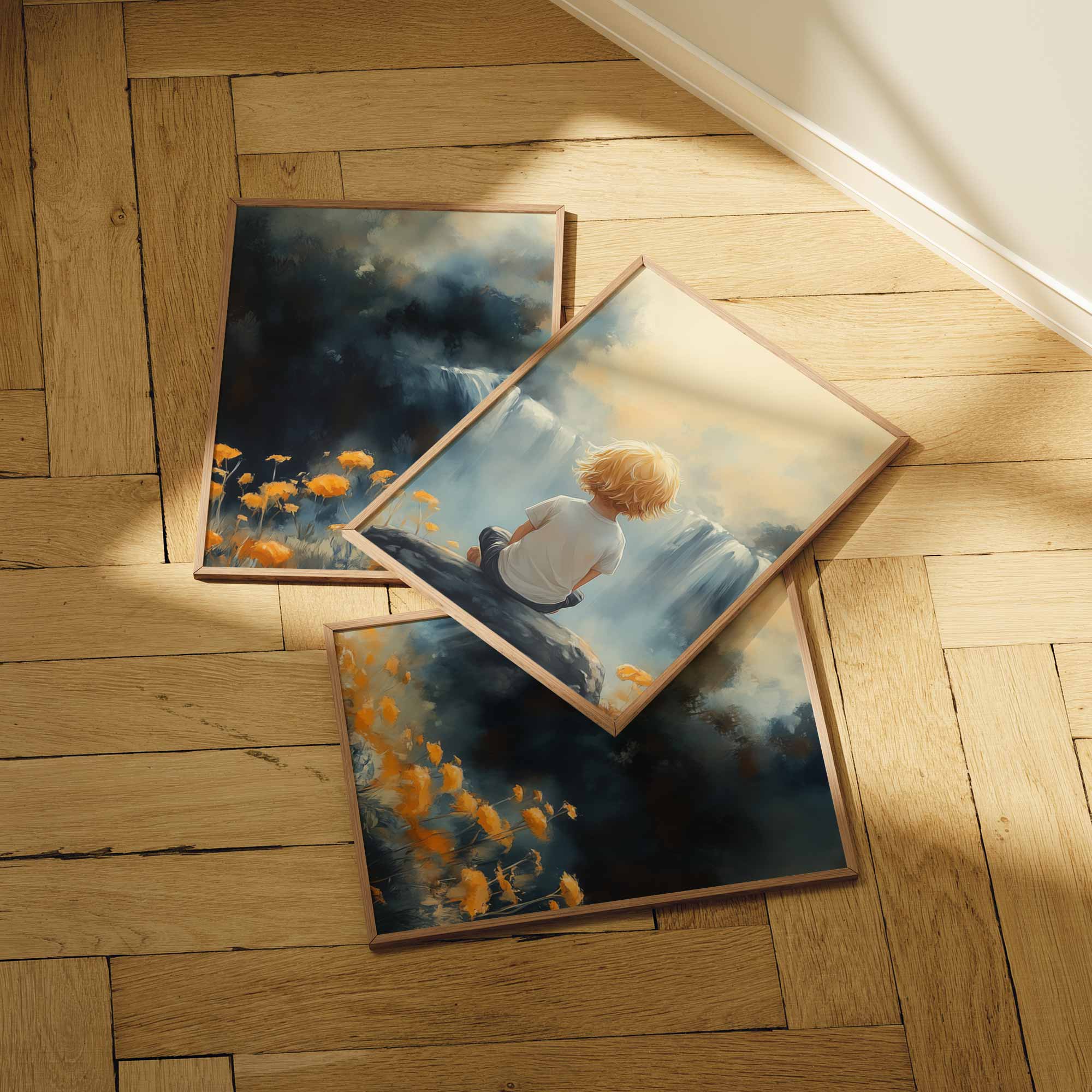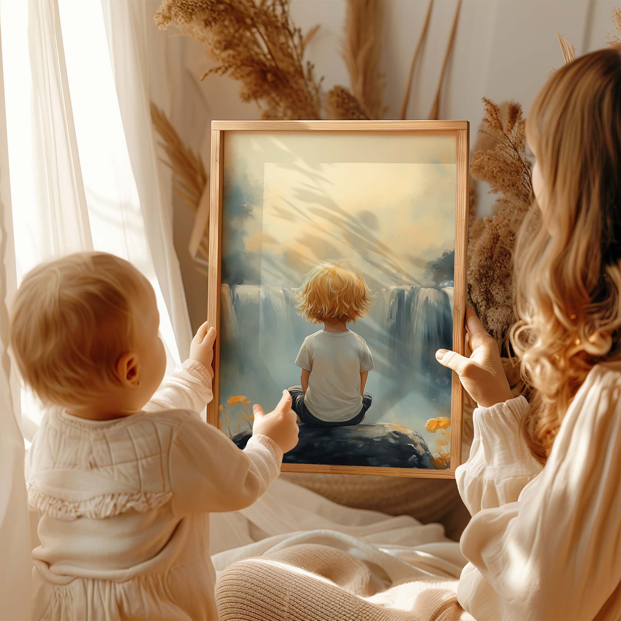 Terug naar collectie / Kinderkamer posters / Bloemen posters / Jongen bij waterval in dromerig bloemenveld