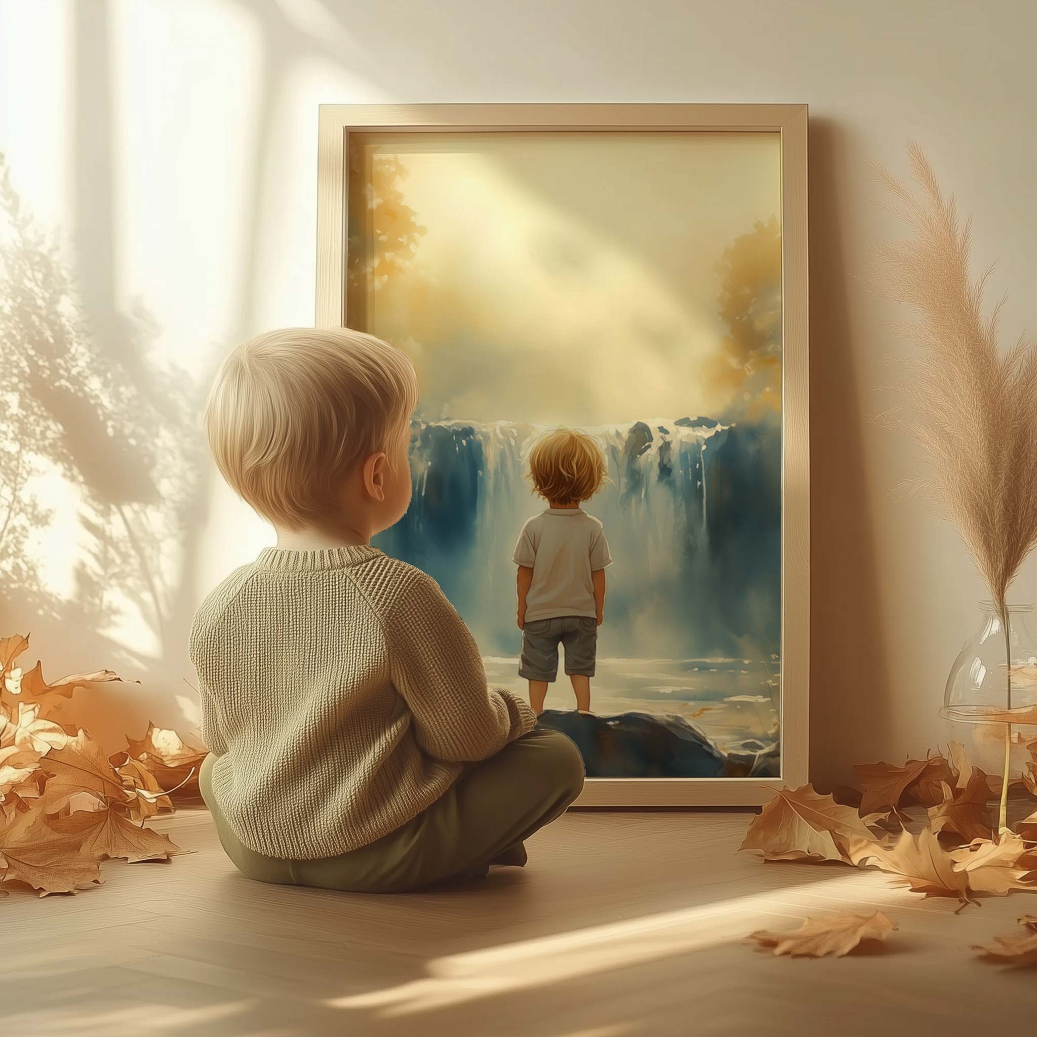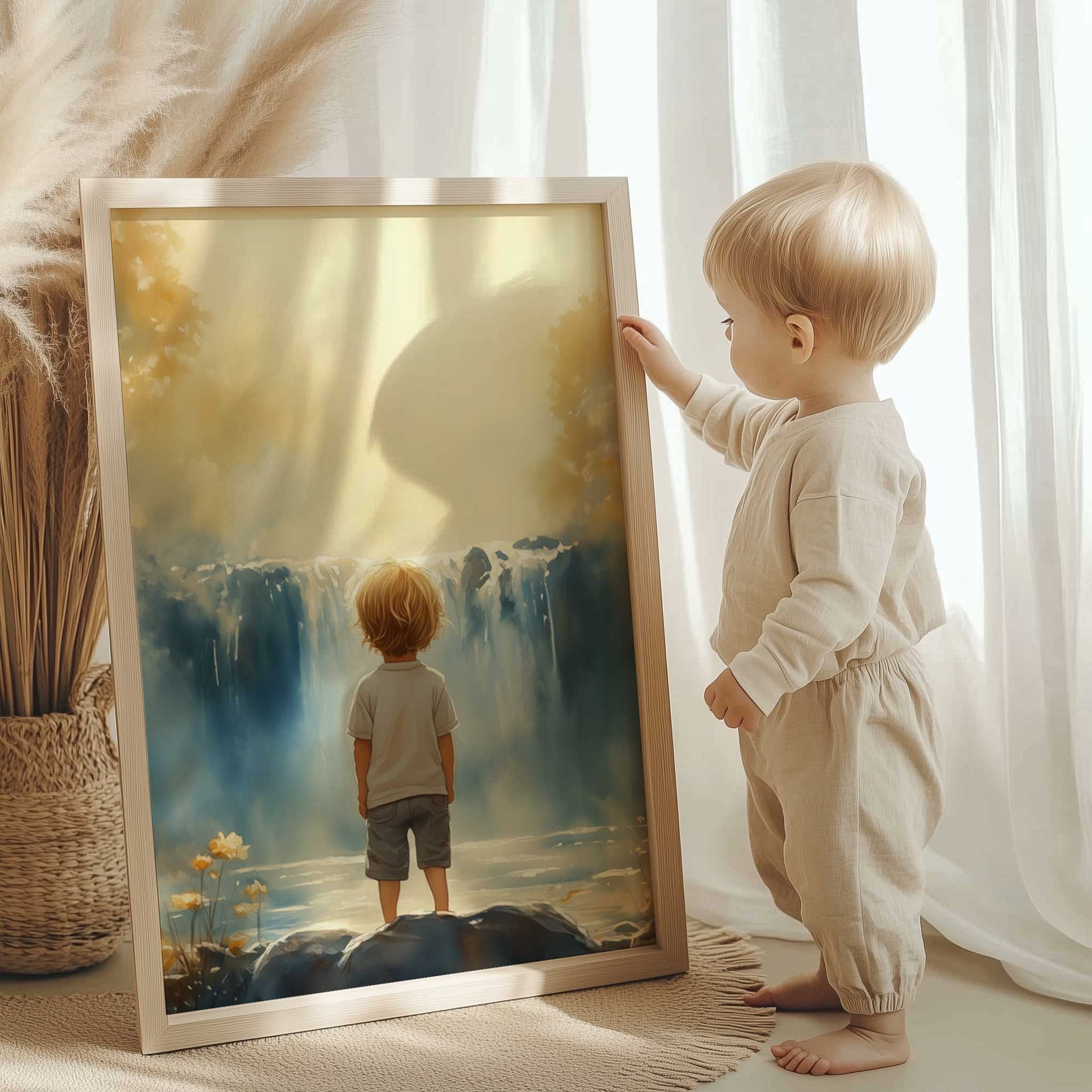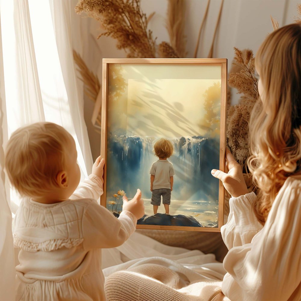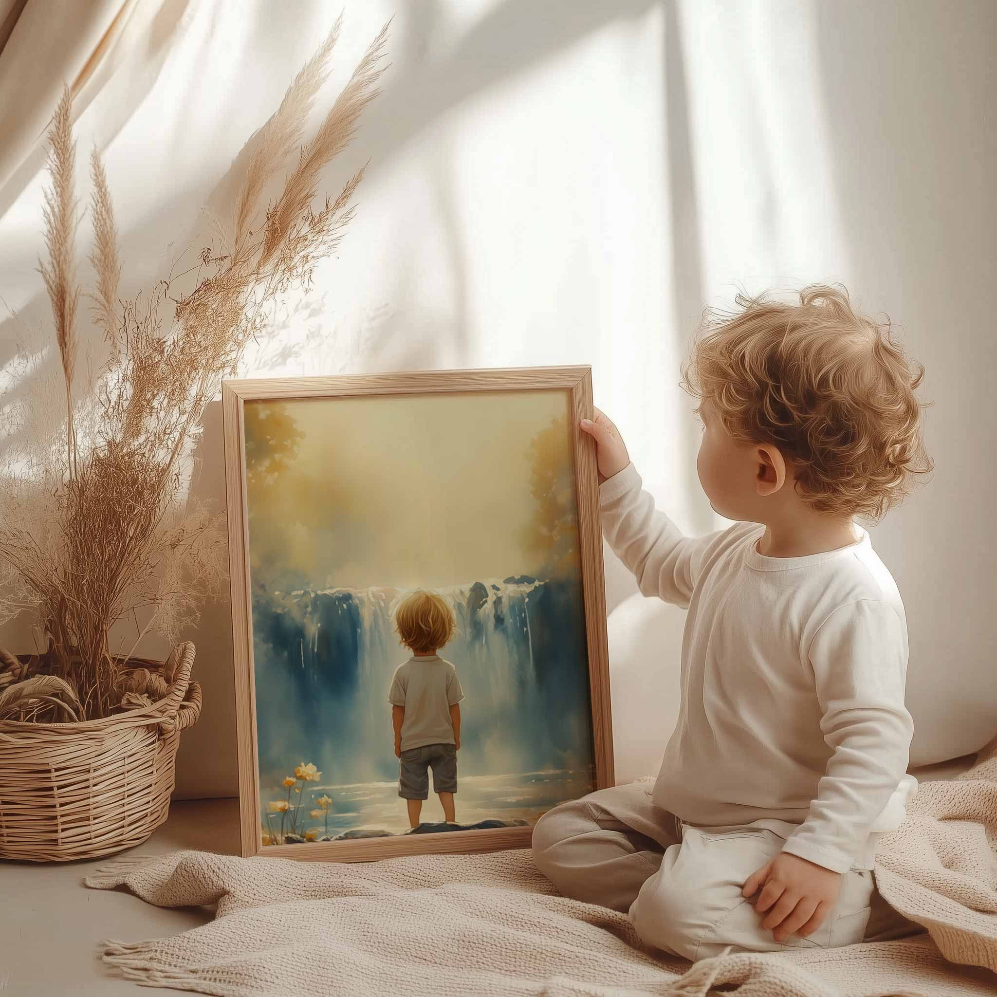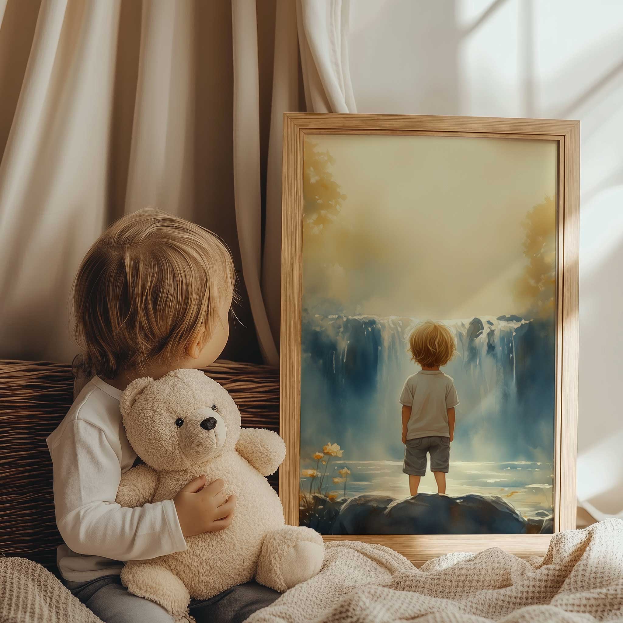 Terug naar collectie / Kinderkamer posters / Avontuurlijk posters / Jongen bij waterval – Speels en vredig tafereel