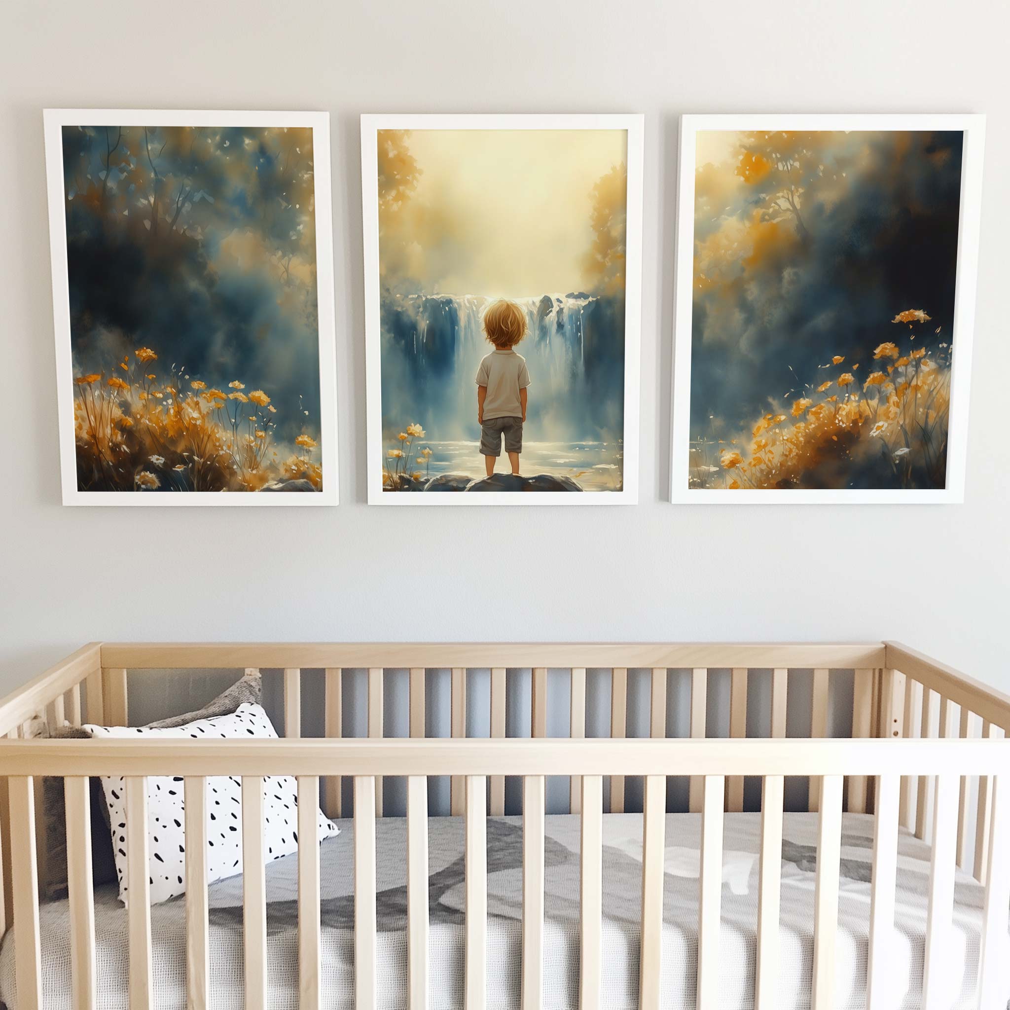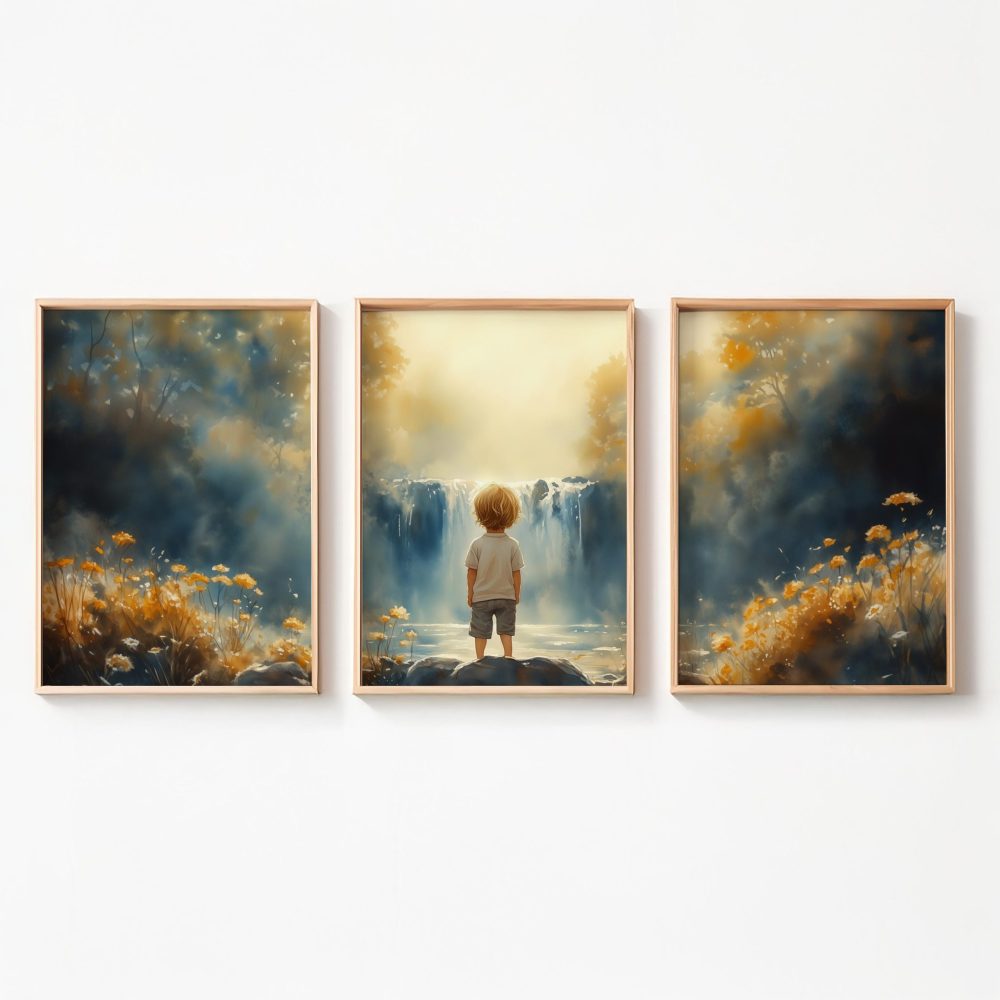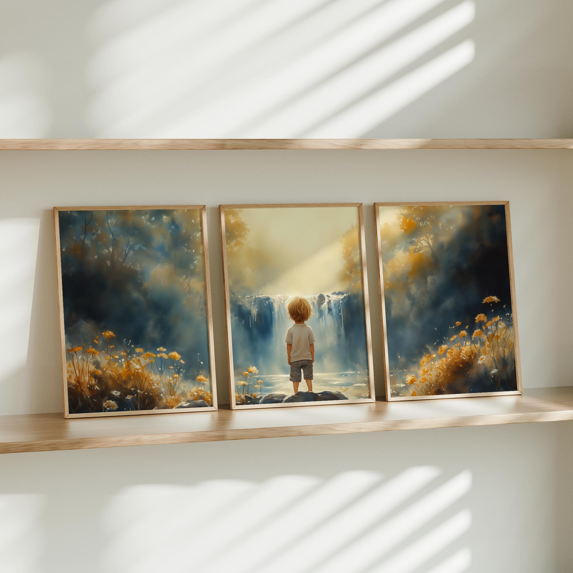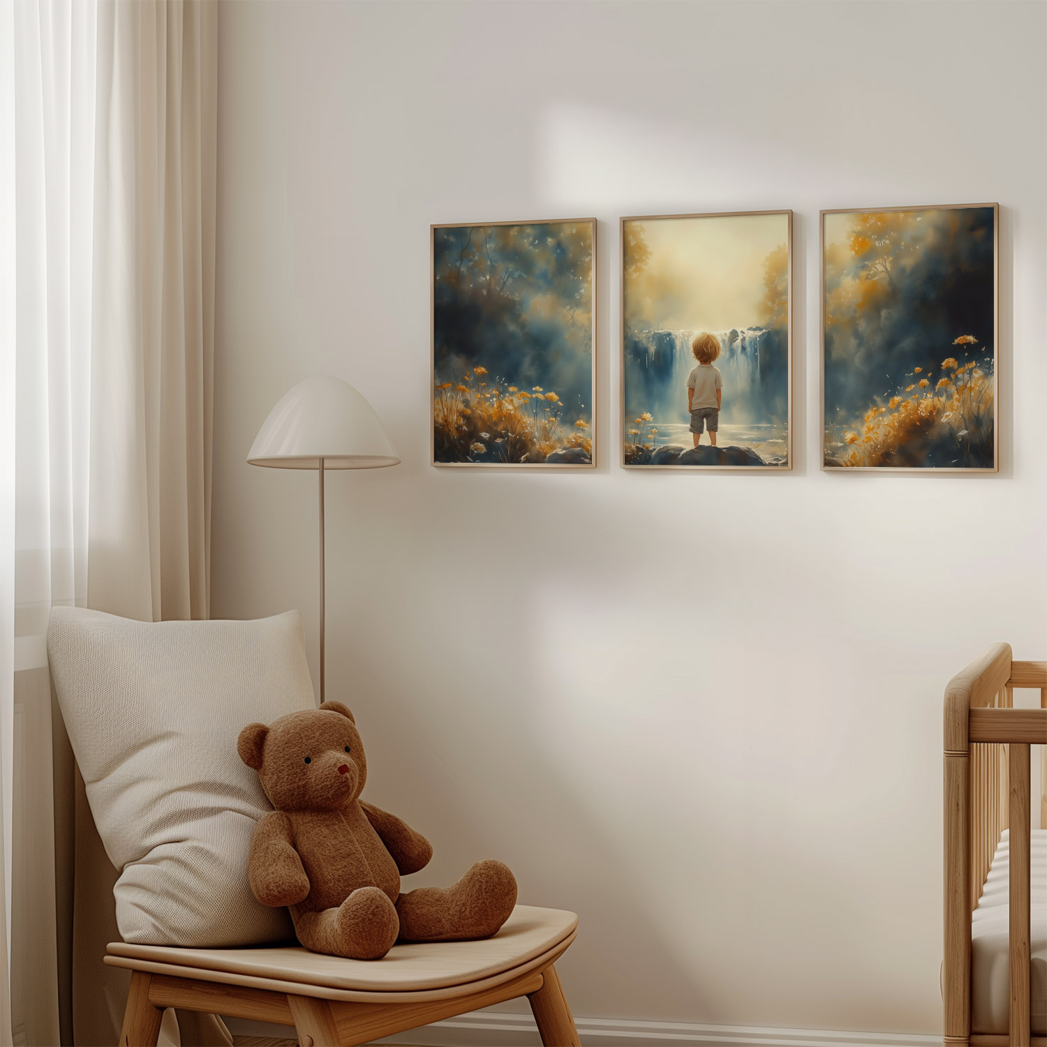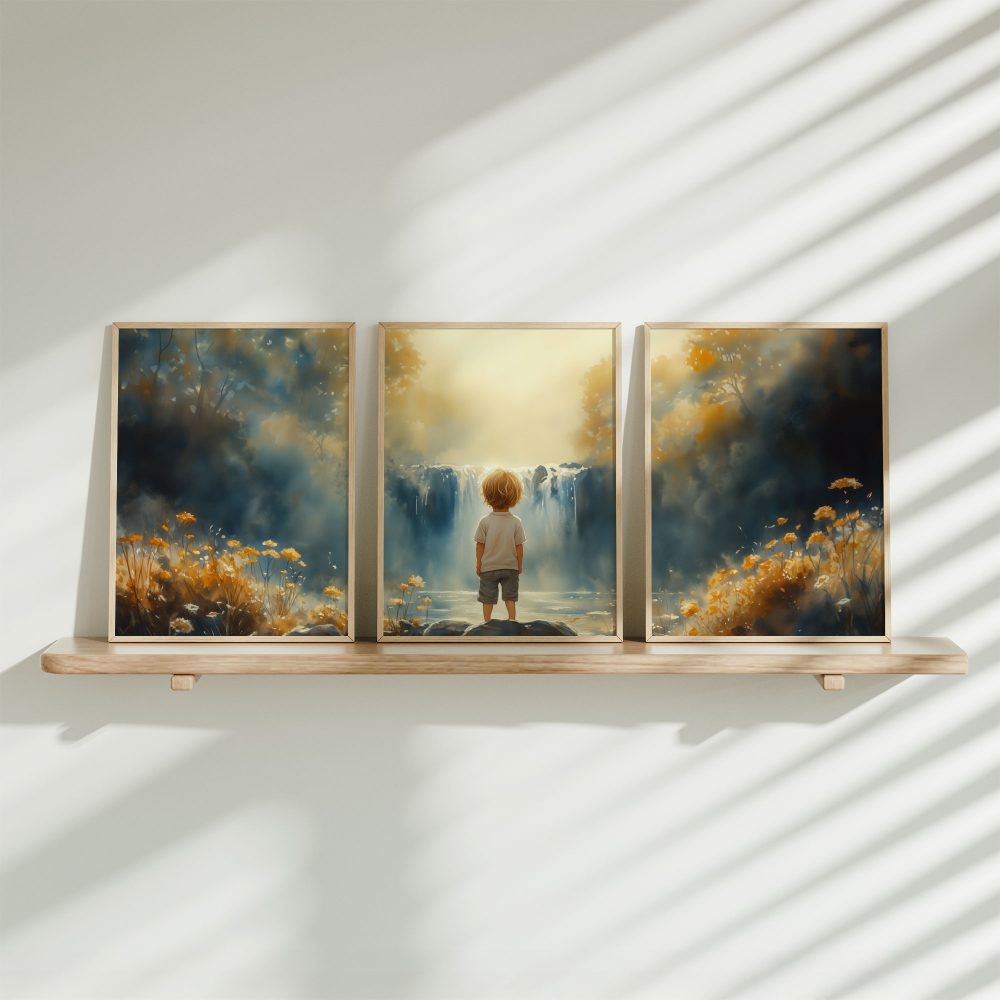 Terug naar collectie / Kinderkamer posters / Avontuurlijk posters / Jongen bij waterval – Speels en vredig tafereel