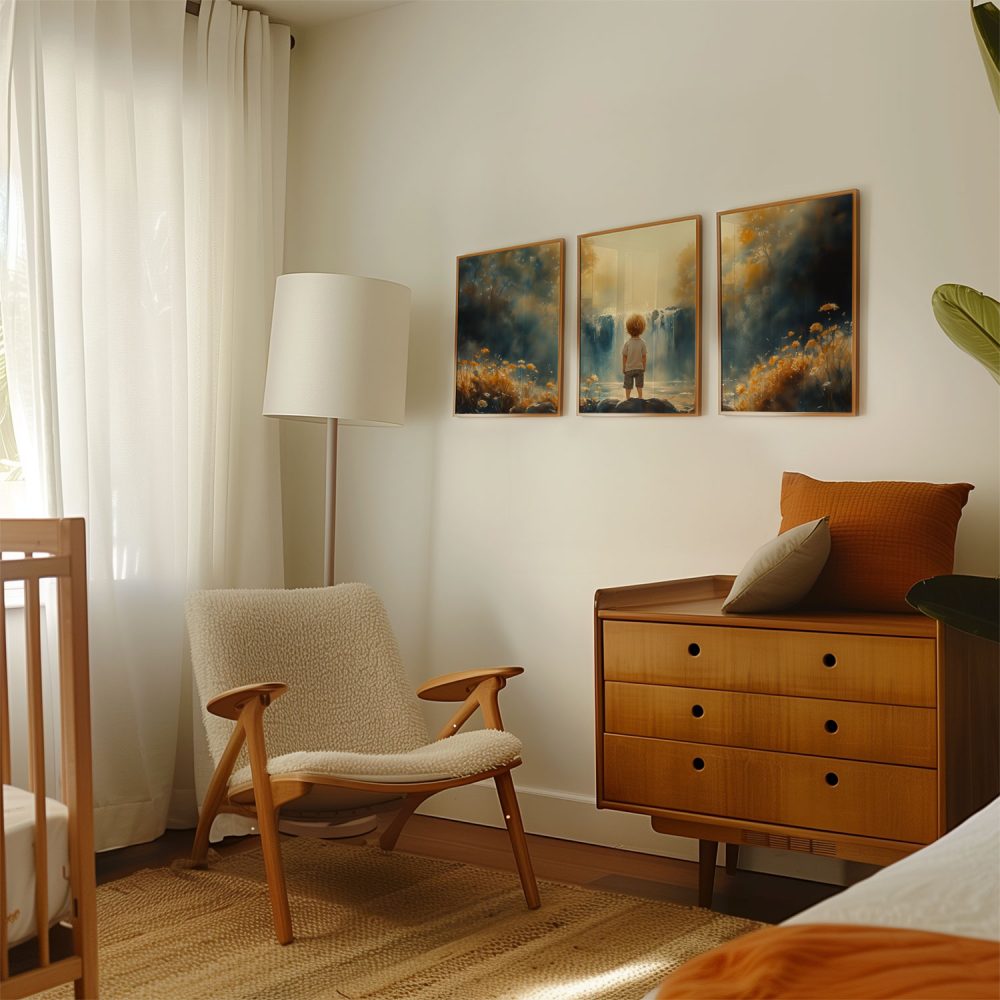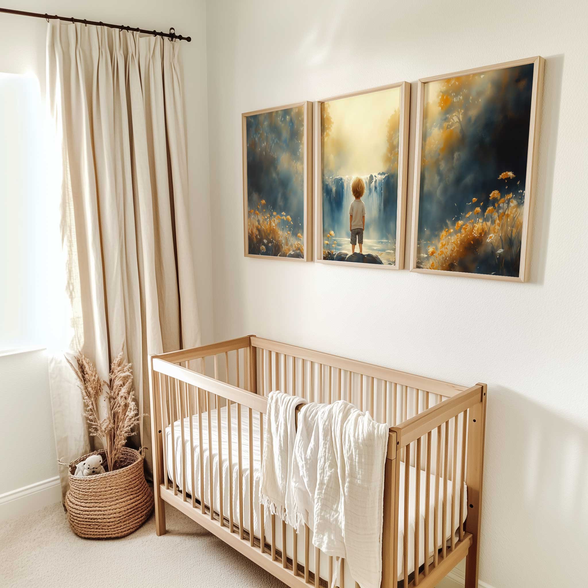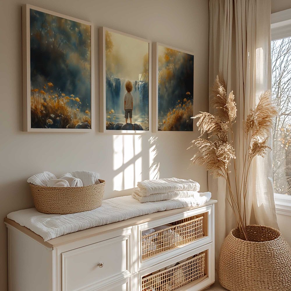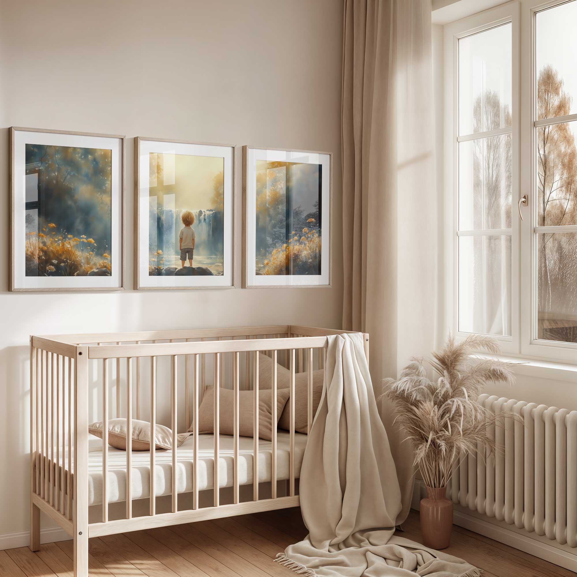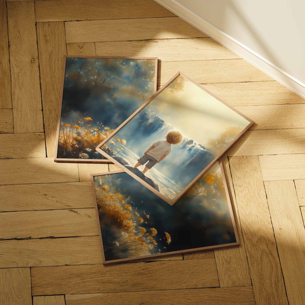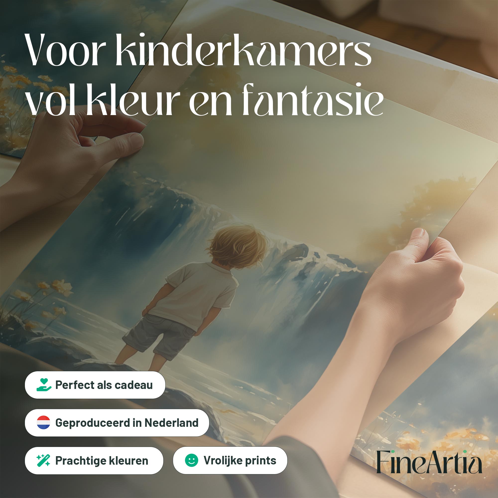 Terug naar collectie / Kinderkamer posters / Avontuurlijk posters / Jongen bij waterval – Speels en vredig tafereel