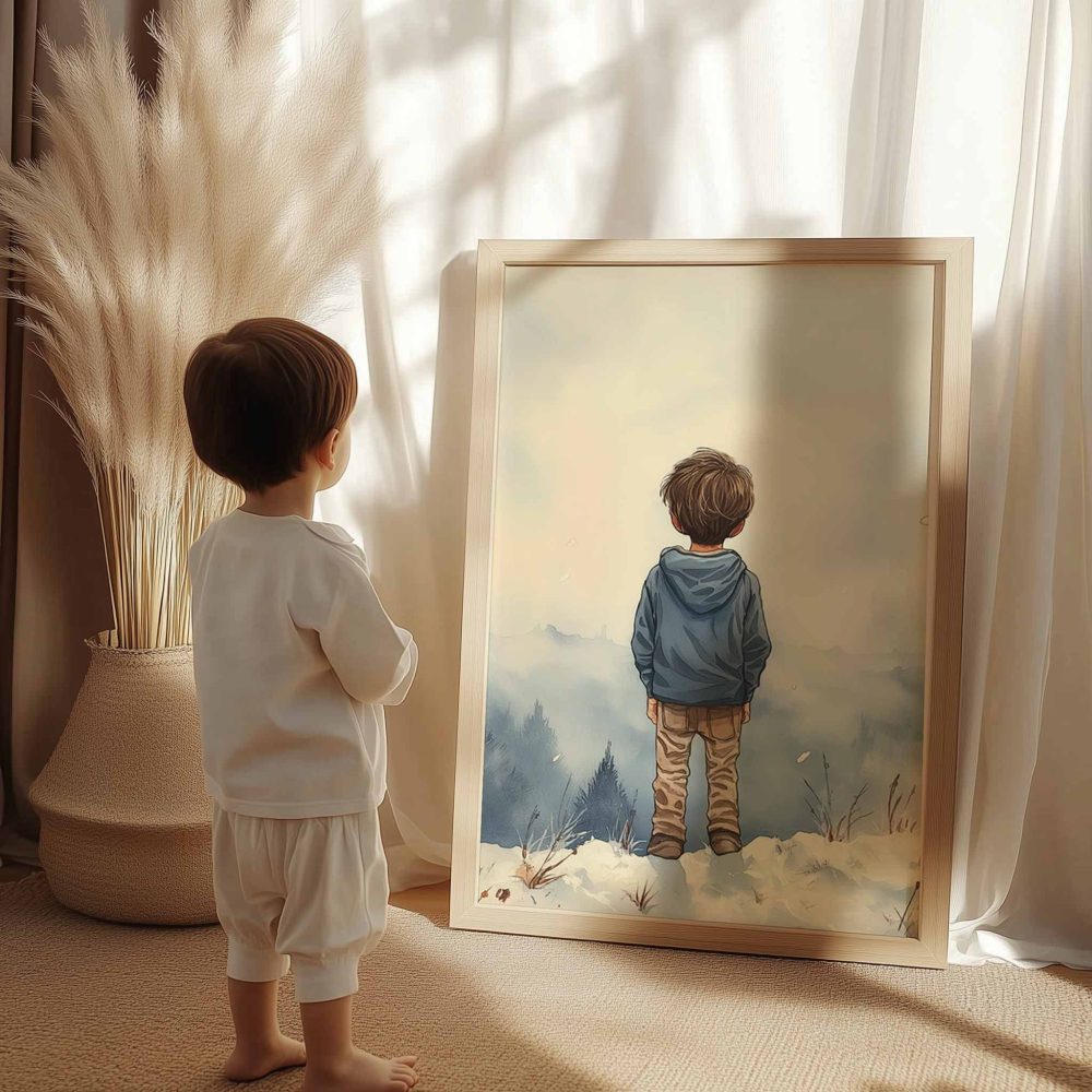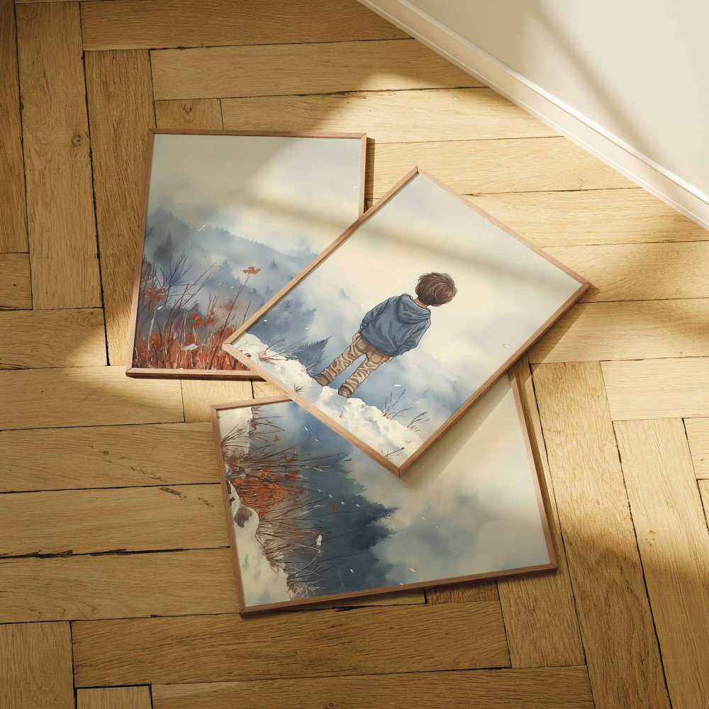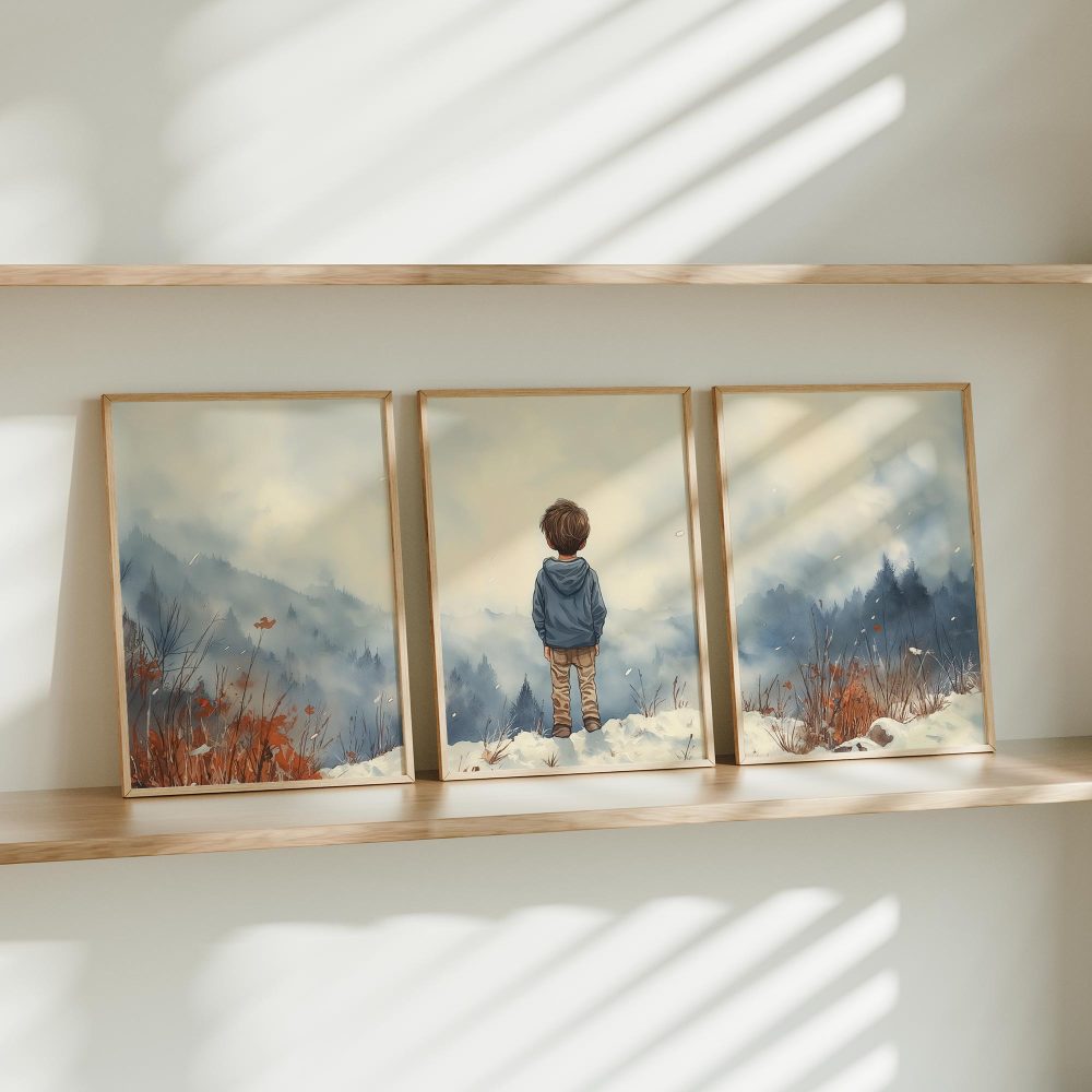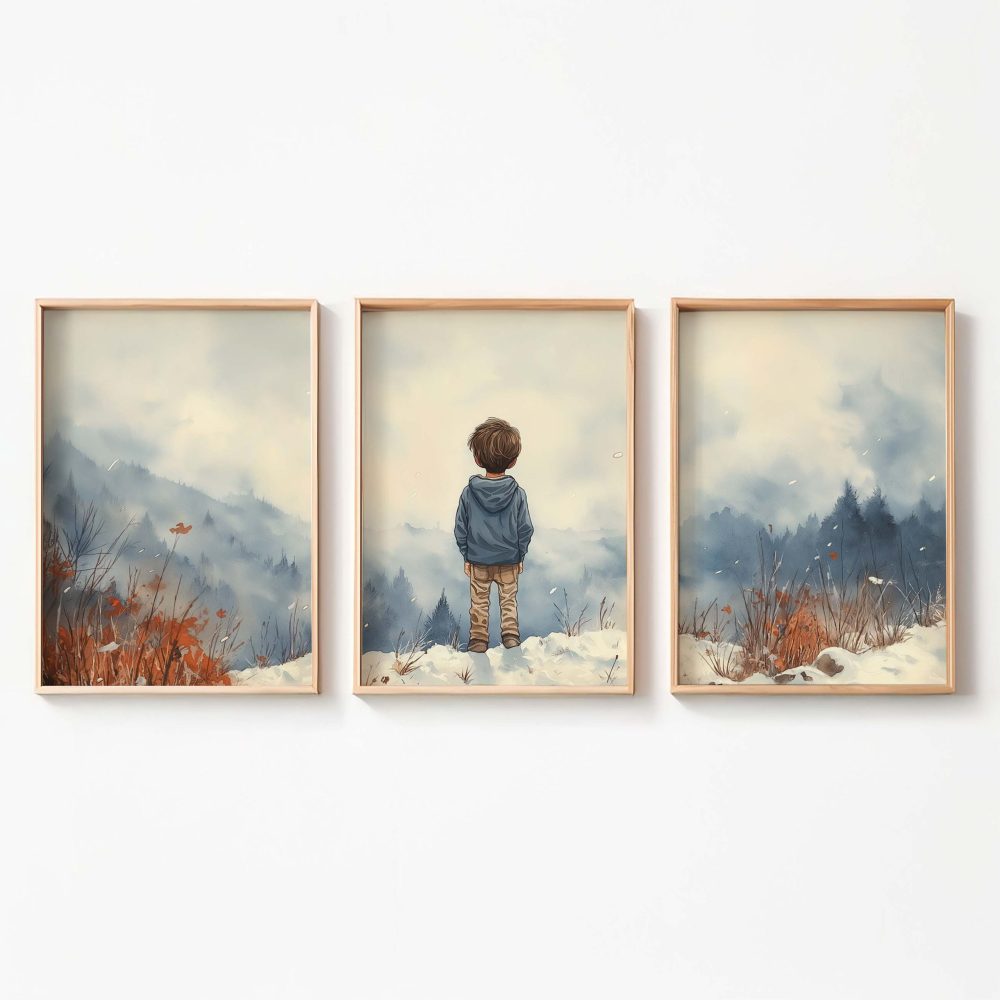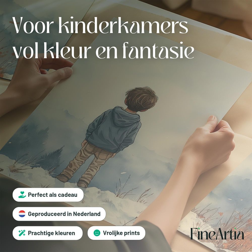 Terug naar collectie / Kinderkamer posters / Avontuurlijk posters / Jongen in de sneeuw: Serene bergen en winterwonder