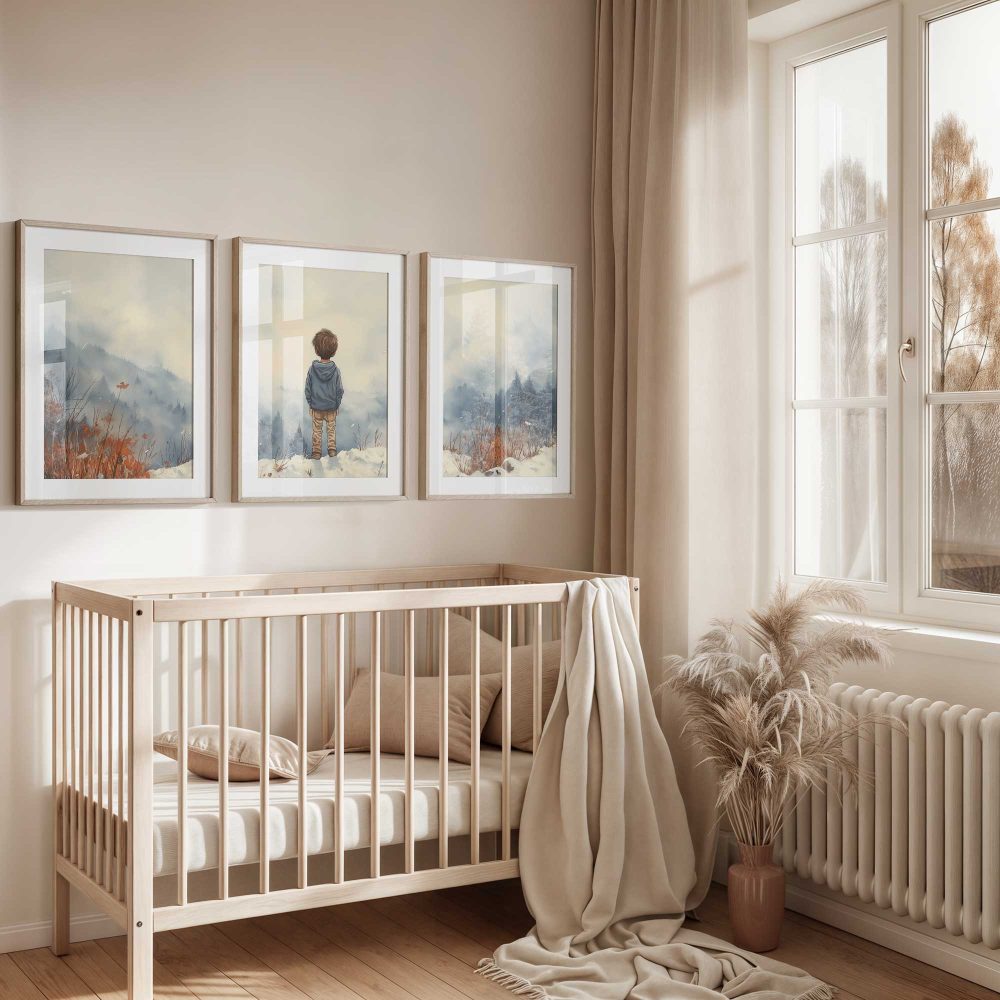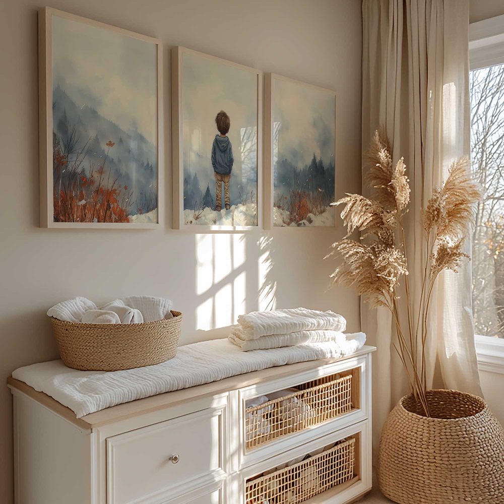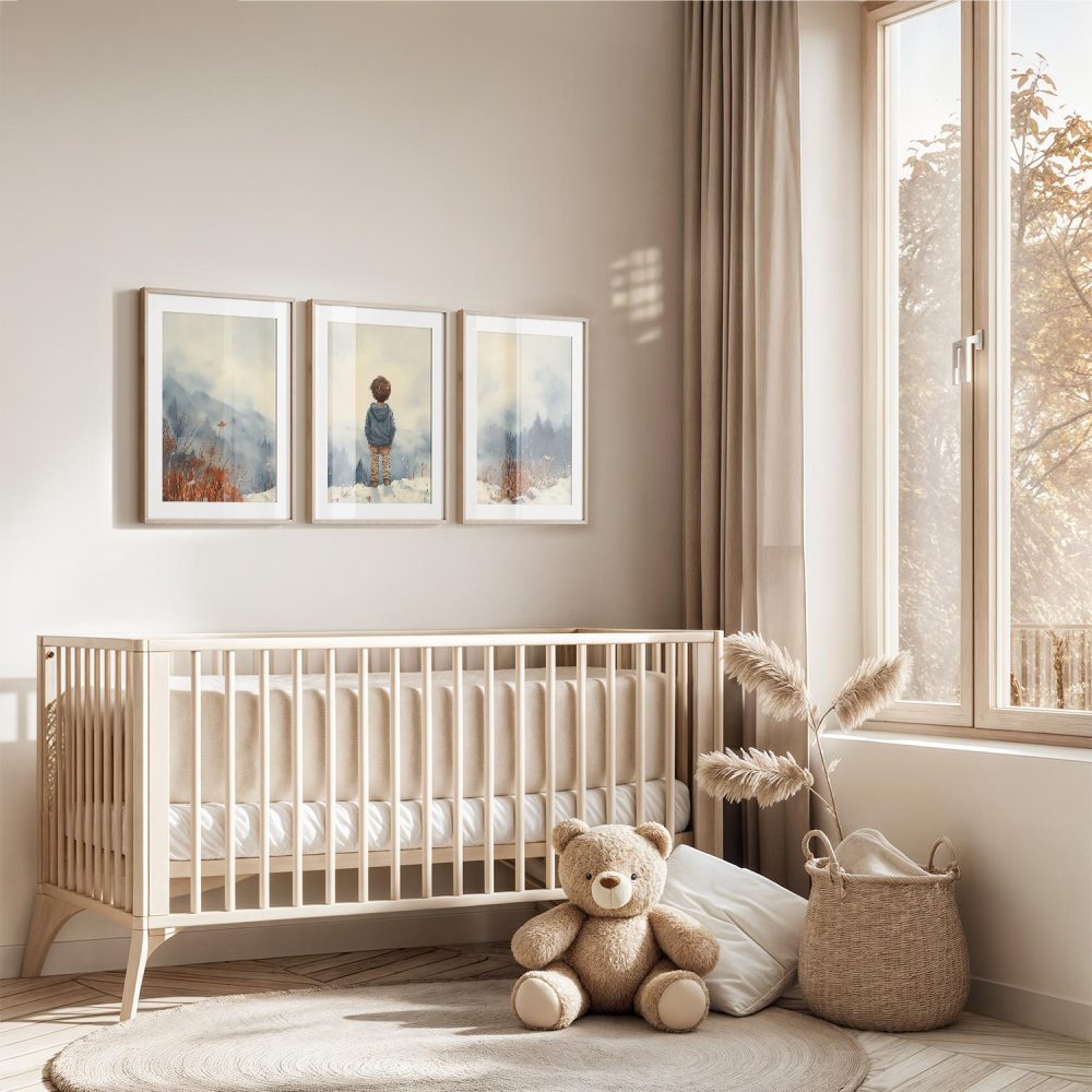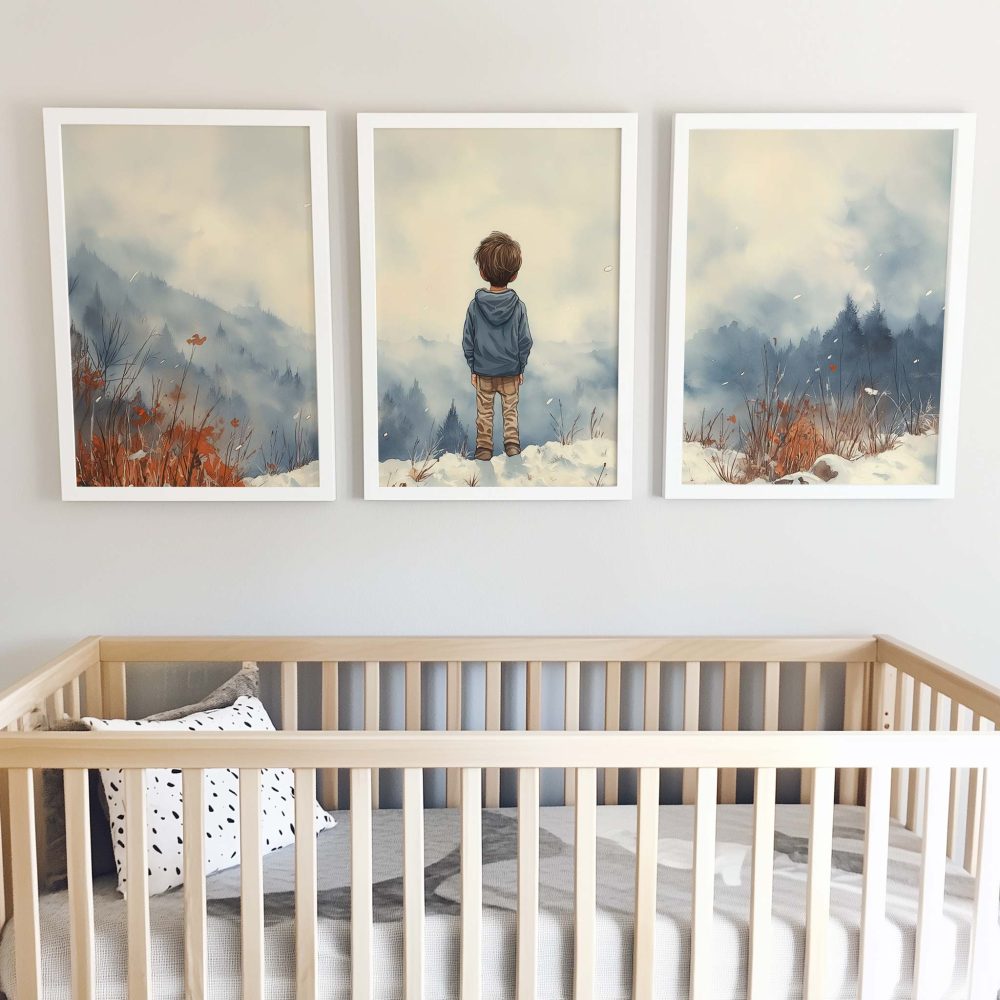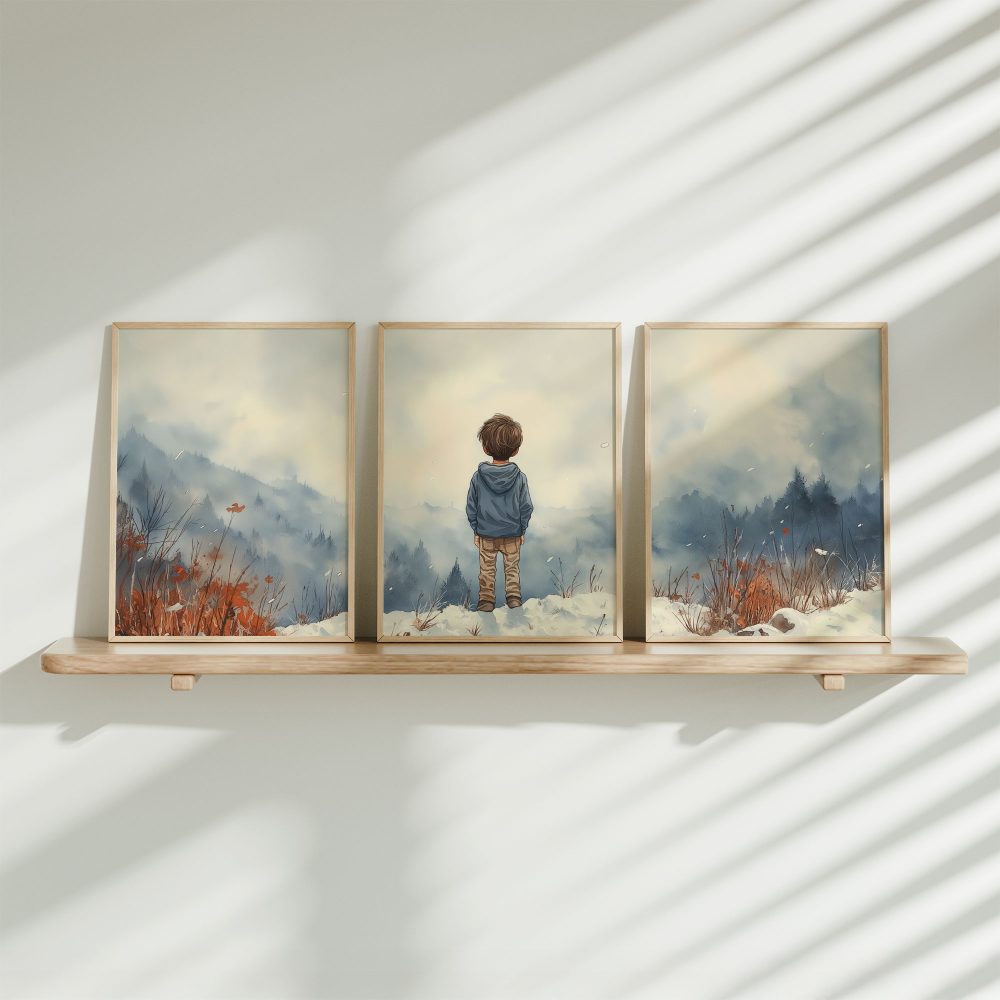 Terug naar collectie / Kinderkamer posters / Avontuurlijk posters / Jongen in de sneeuw: Serene bergen en winterwonder