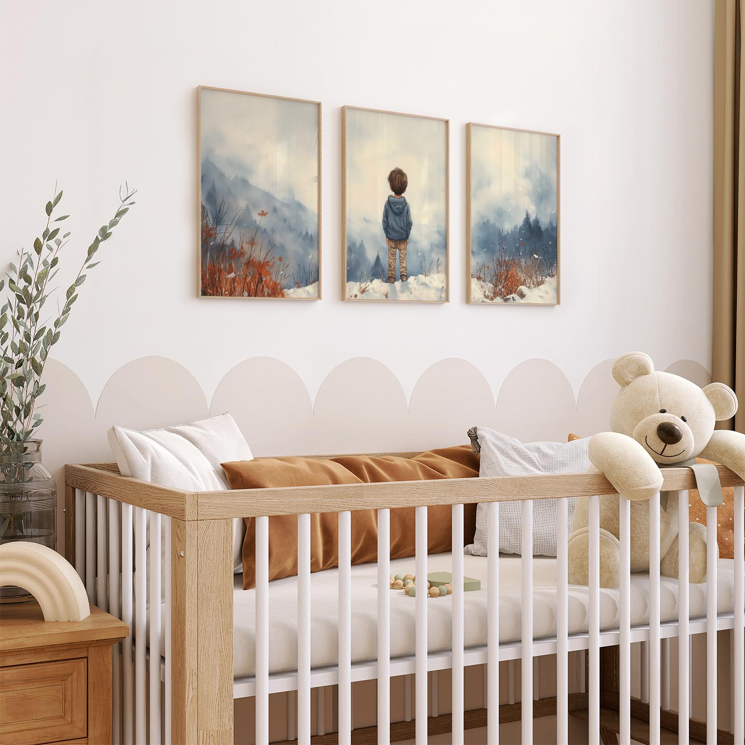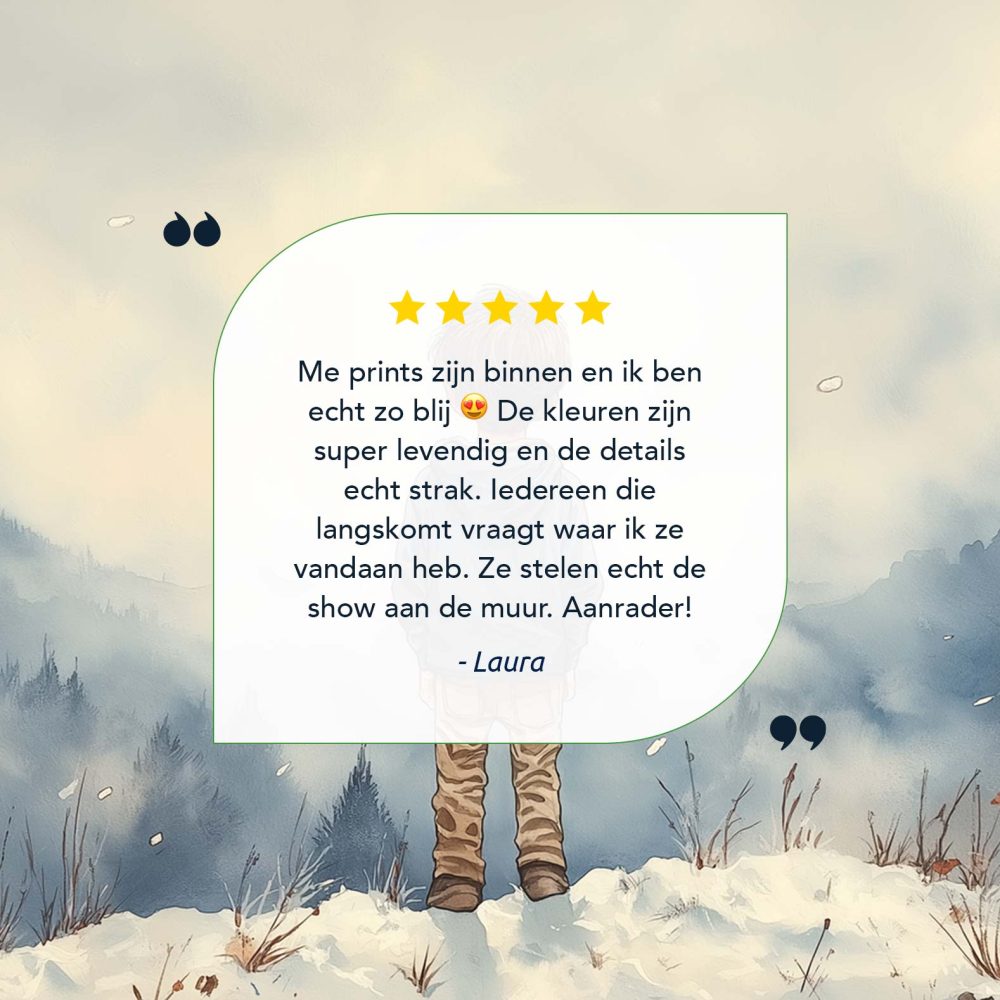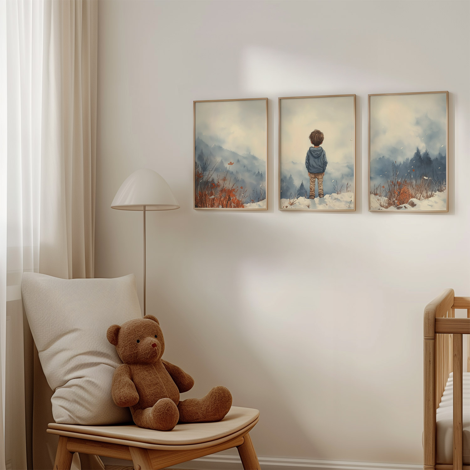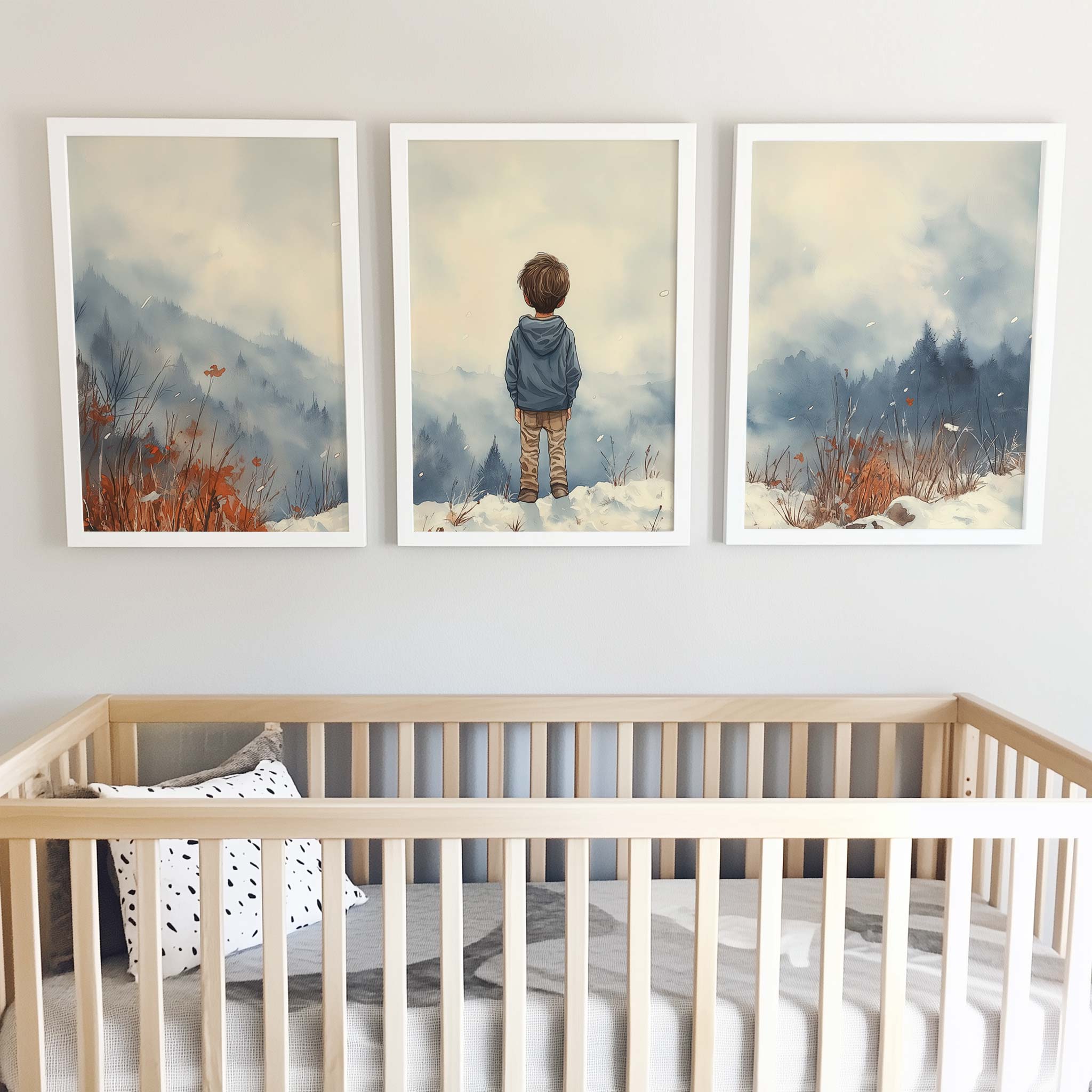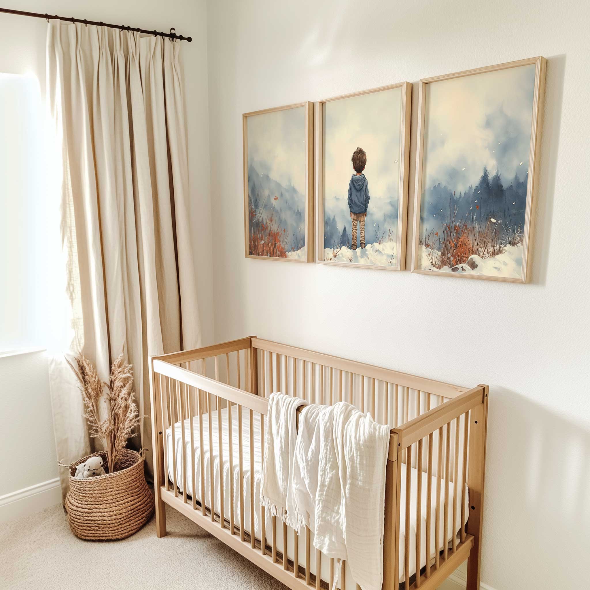 Terug naar collectie / Kinderkamer posters / Avontuurlijk posters / Jongen in de sneeuw: Serene bergen en winterwonder
