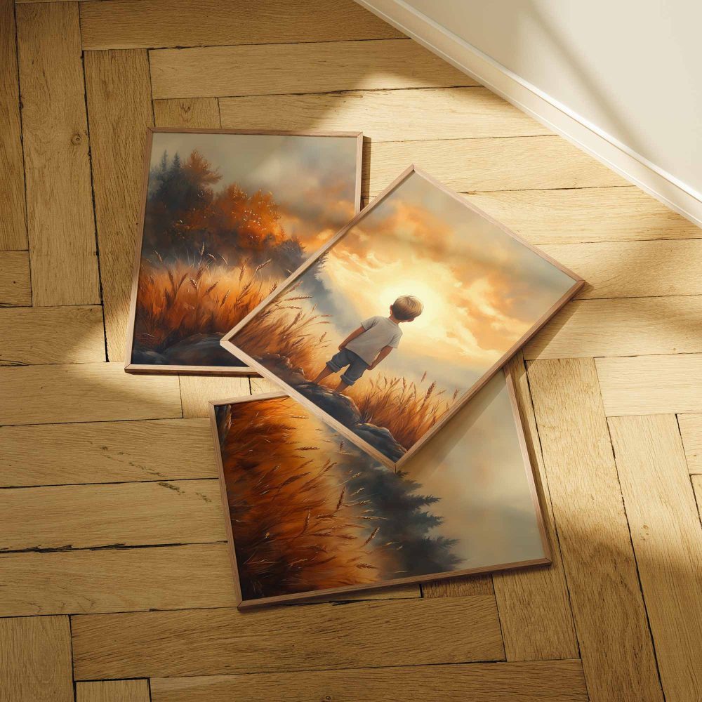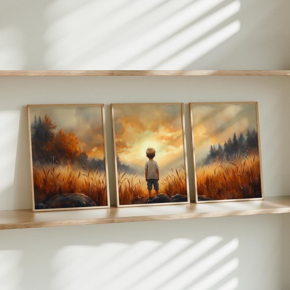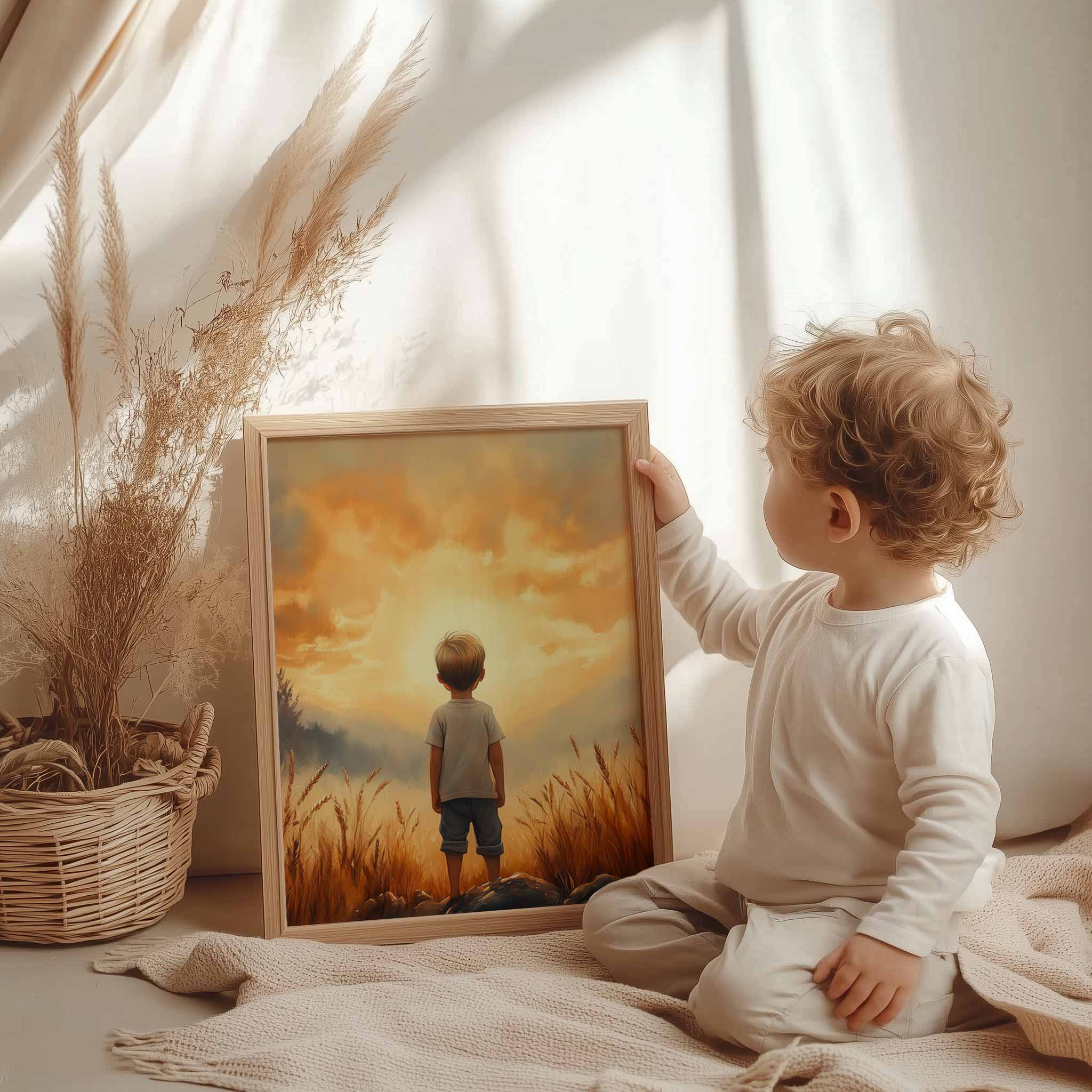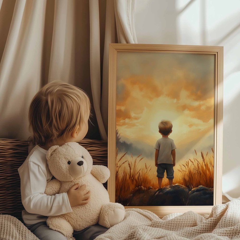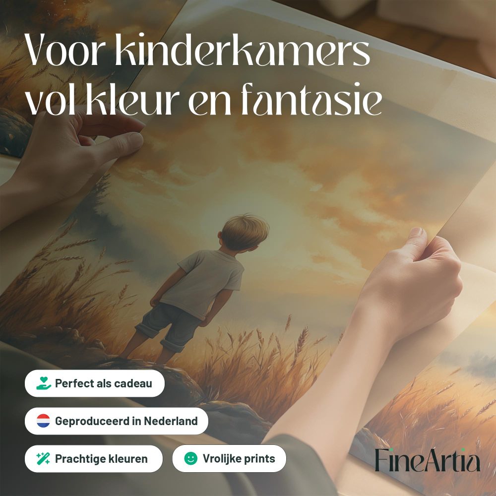 Terug naar collectie / Kinderkamer posters / Jongen in gouden velden bij zonsondergang