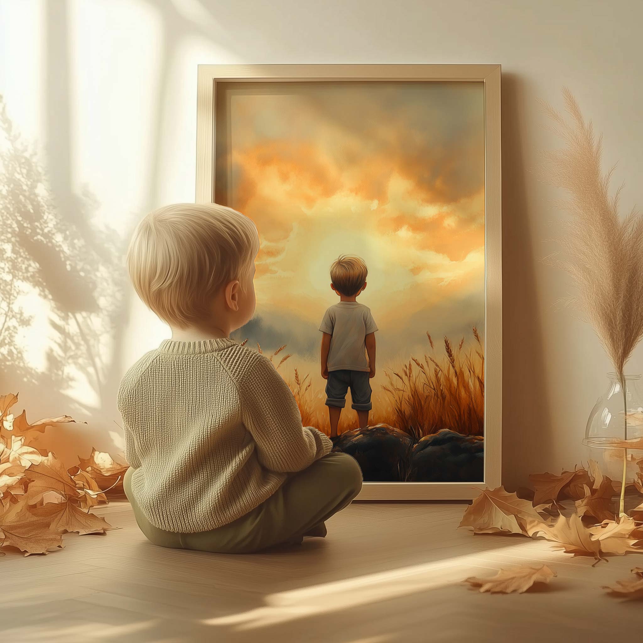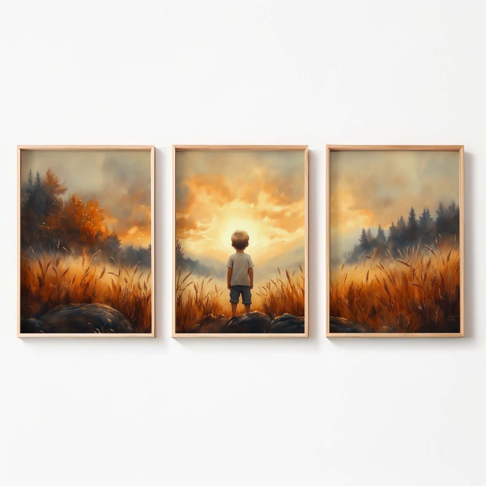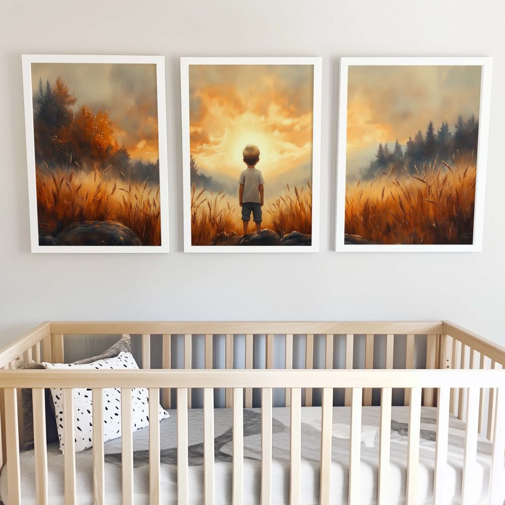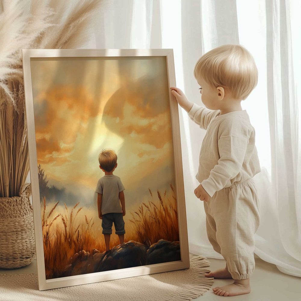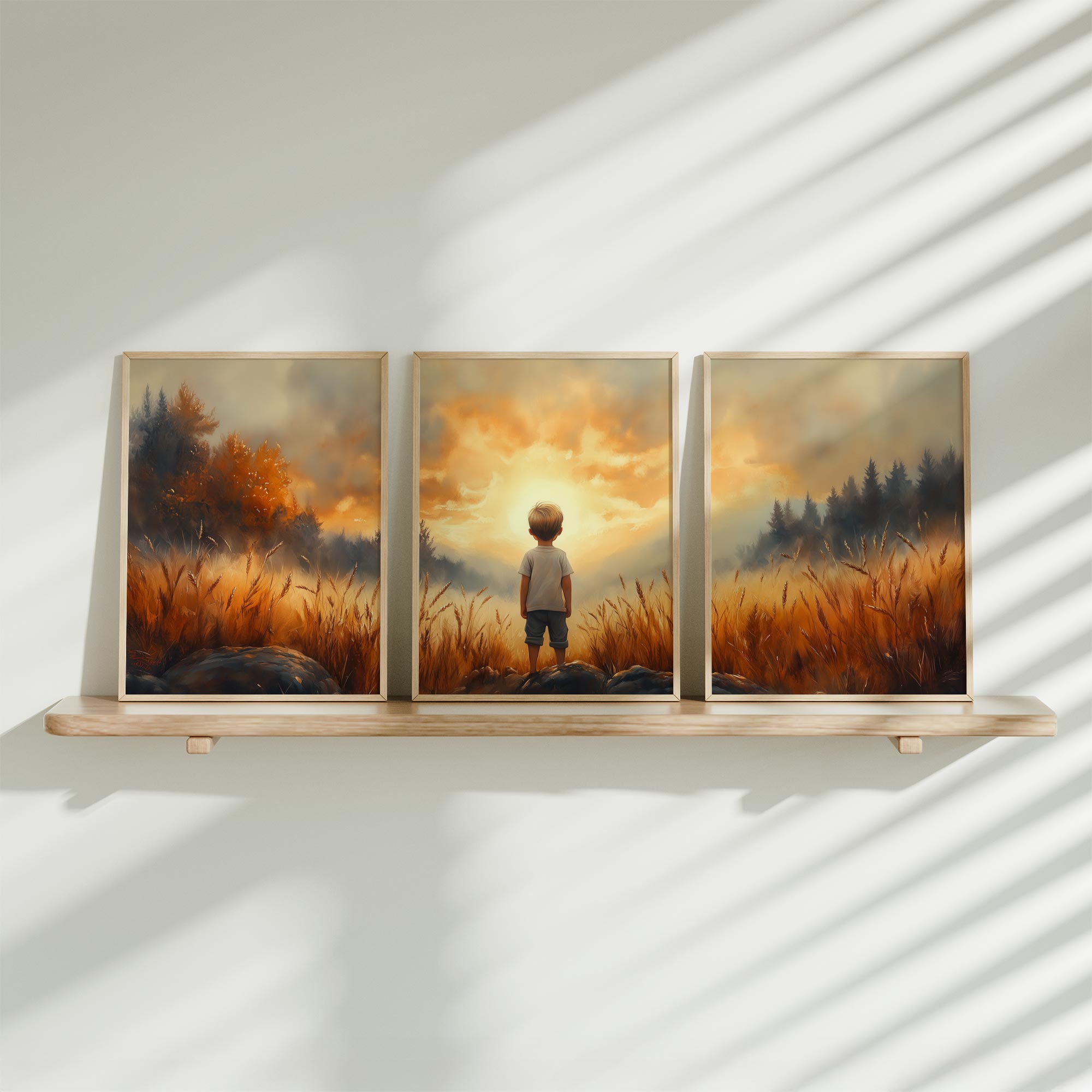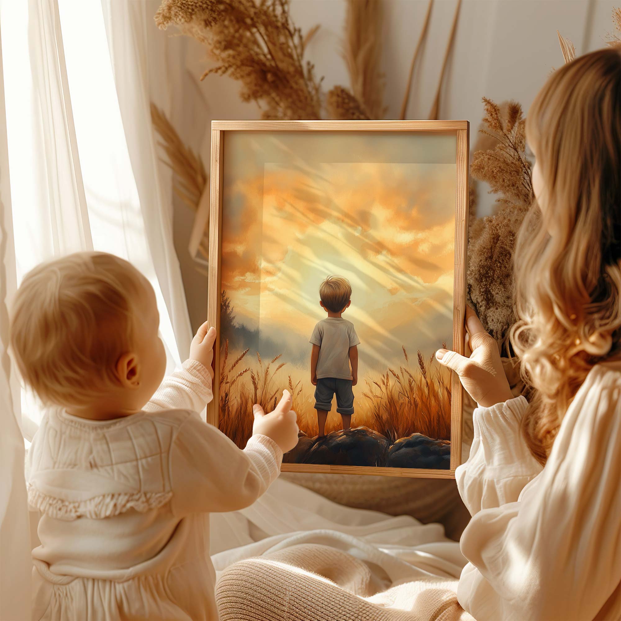 Terug naar collectie / Kinderkamer posters / Jongen in gouden velden bij zonsondergang