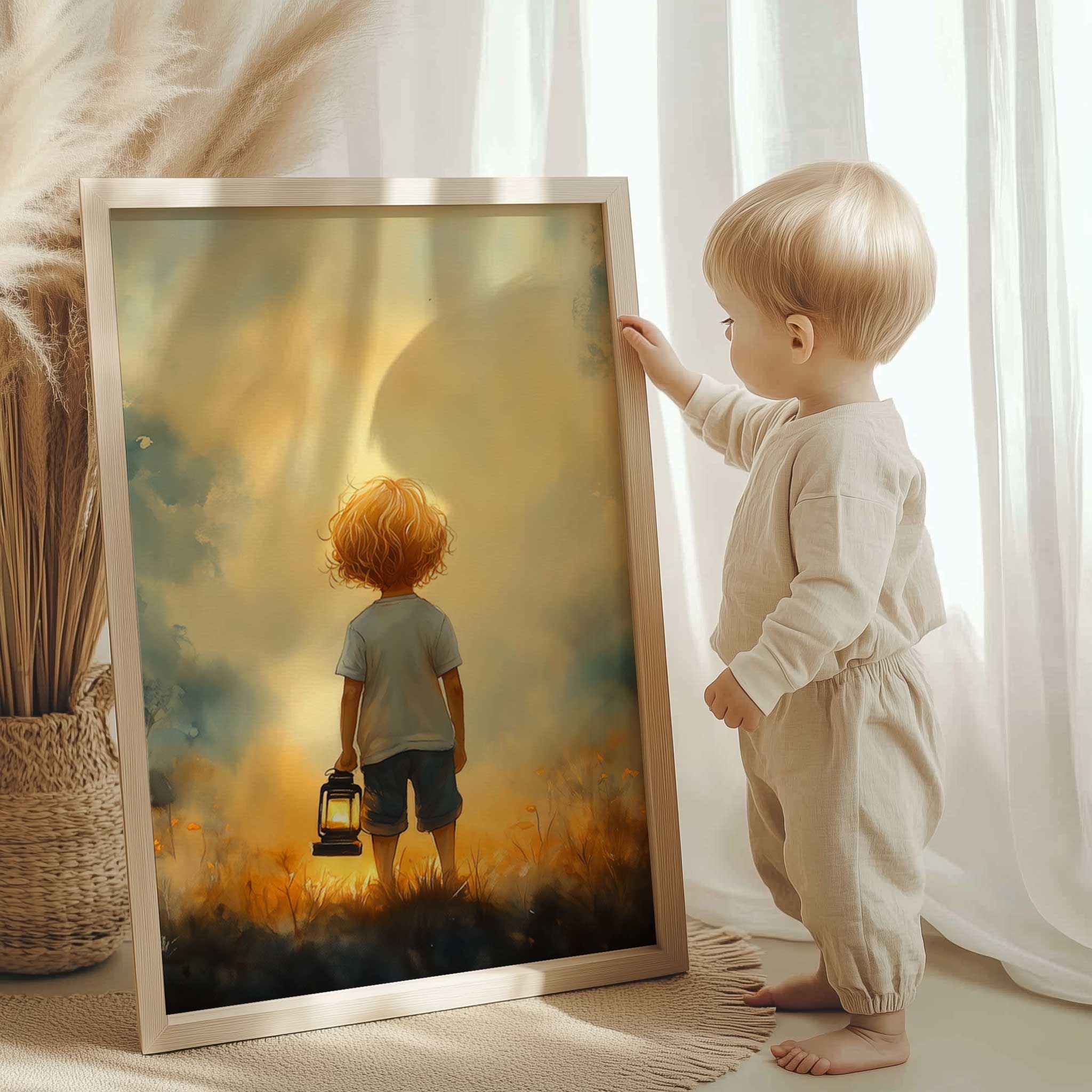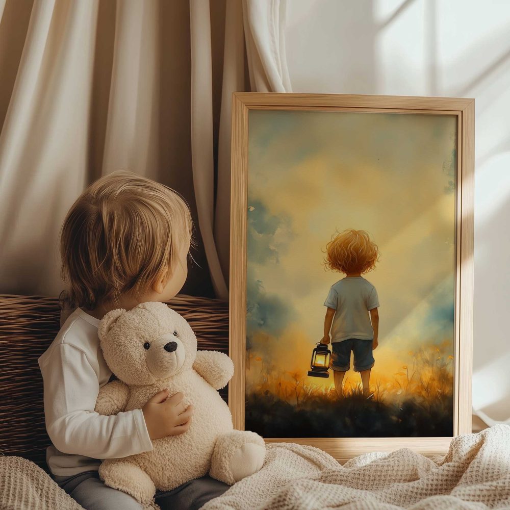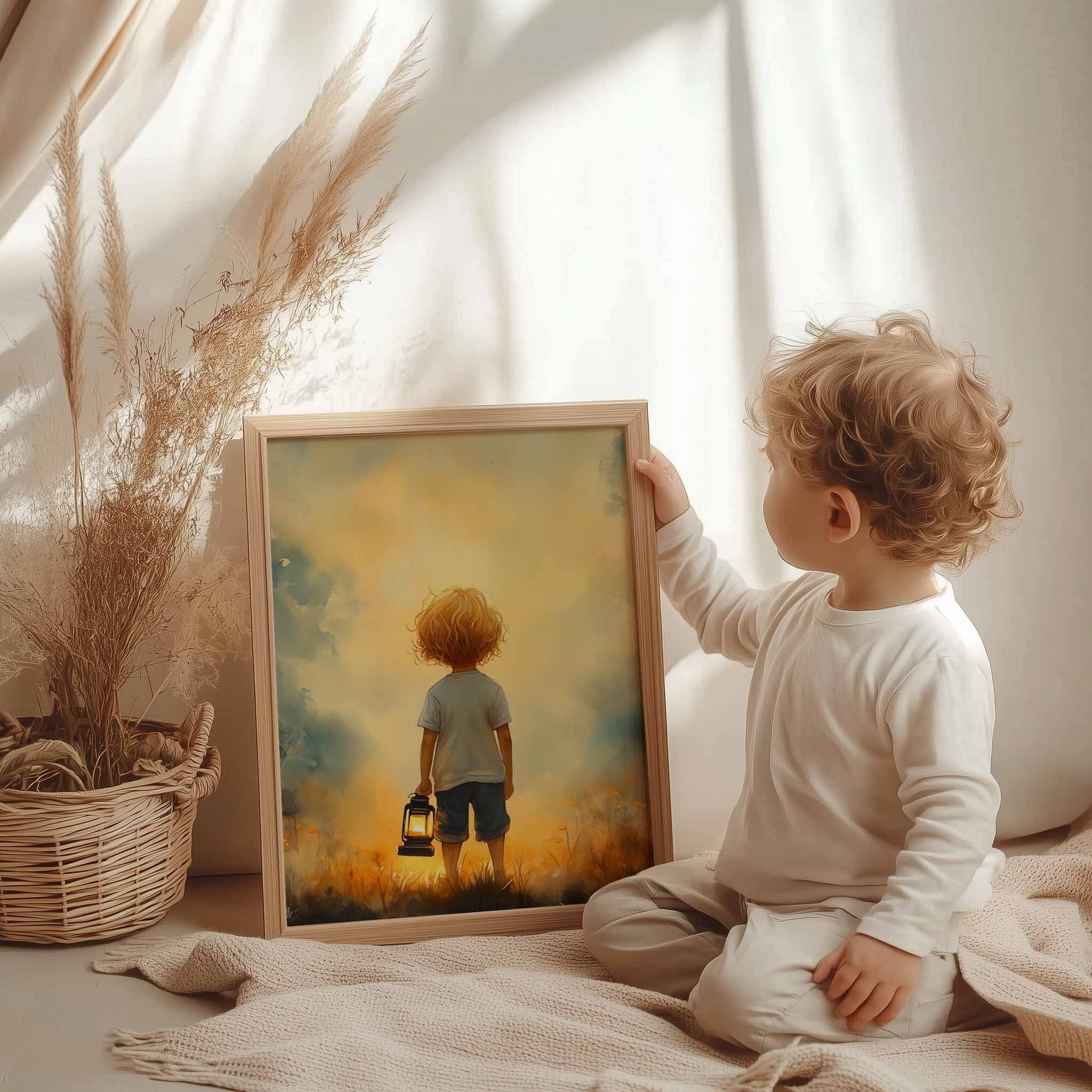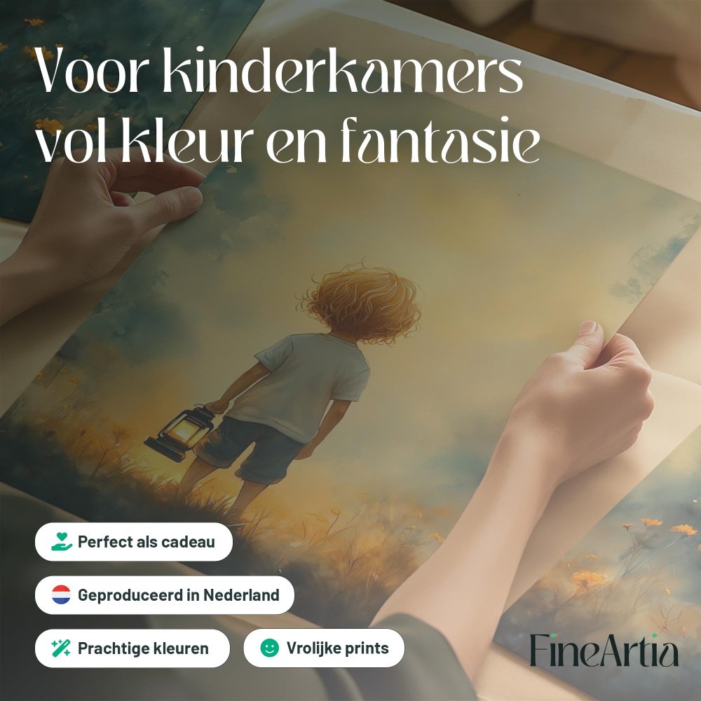 Terug naar collectie / Kinderkamer posters / Bloemen posters / Jongen met lantaarn in betoverend bloemenveld