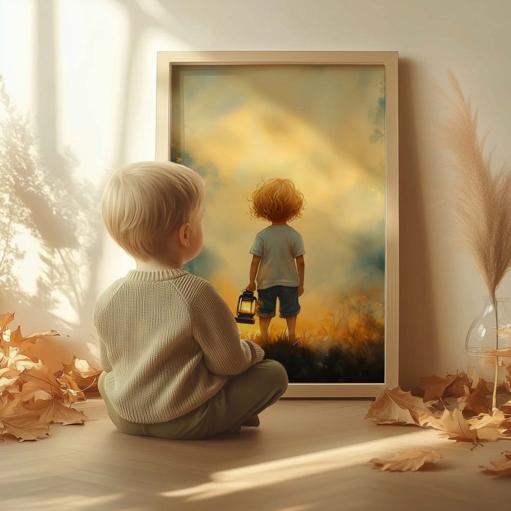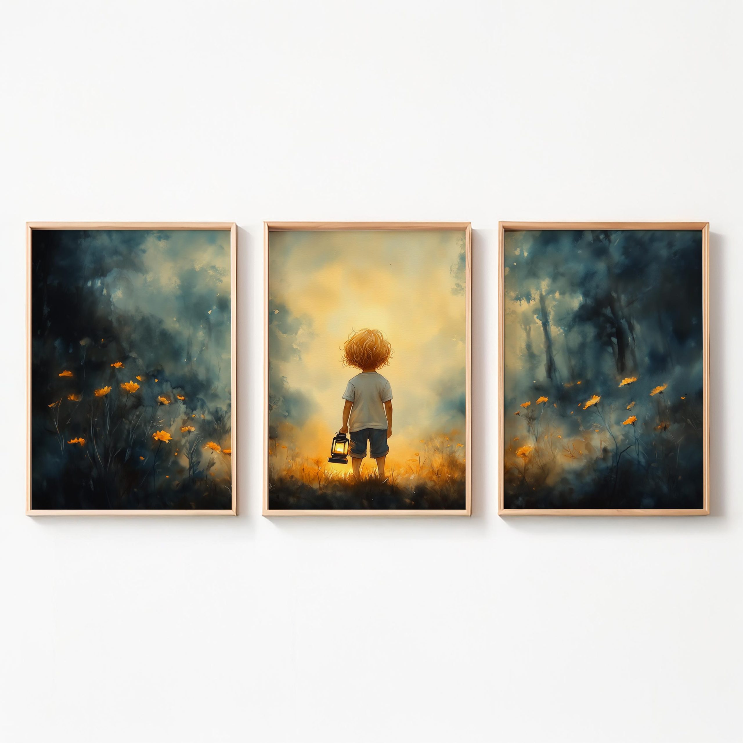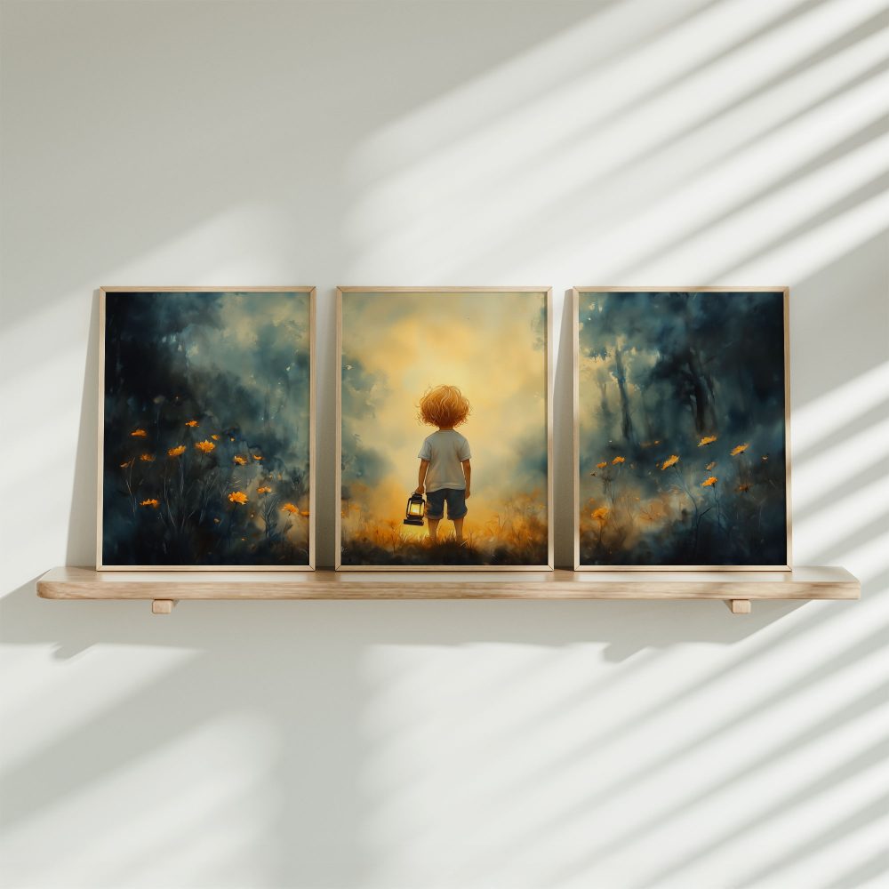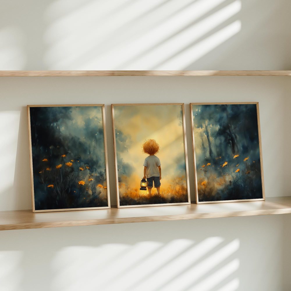 Terug naar collectie / Kinderkamer posters / Bloemen posters / Jongen met lantaarn in betoverend bloemenveld