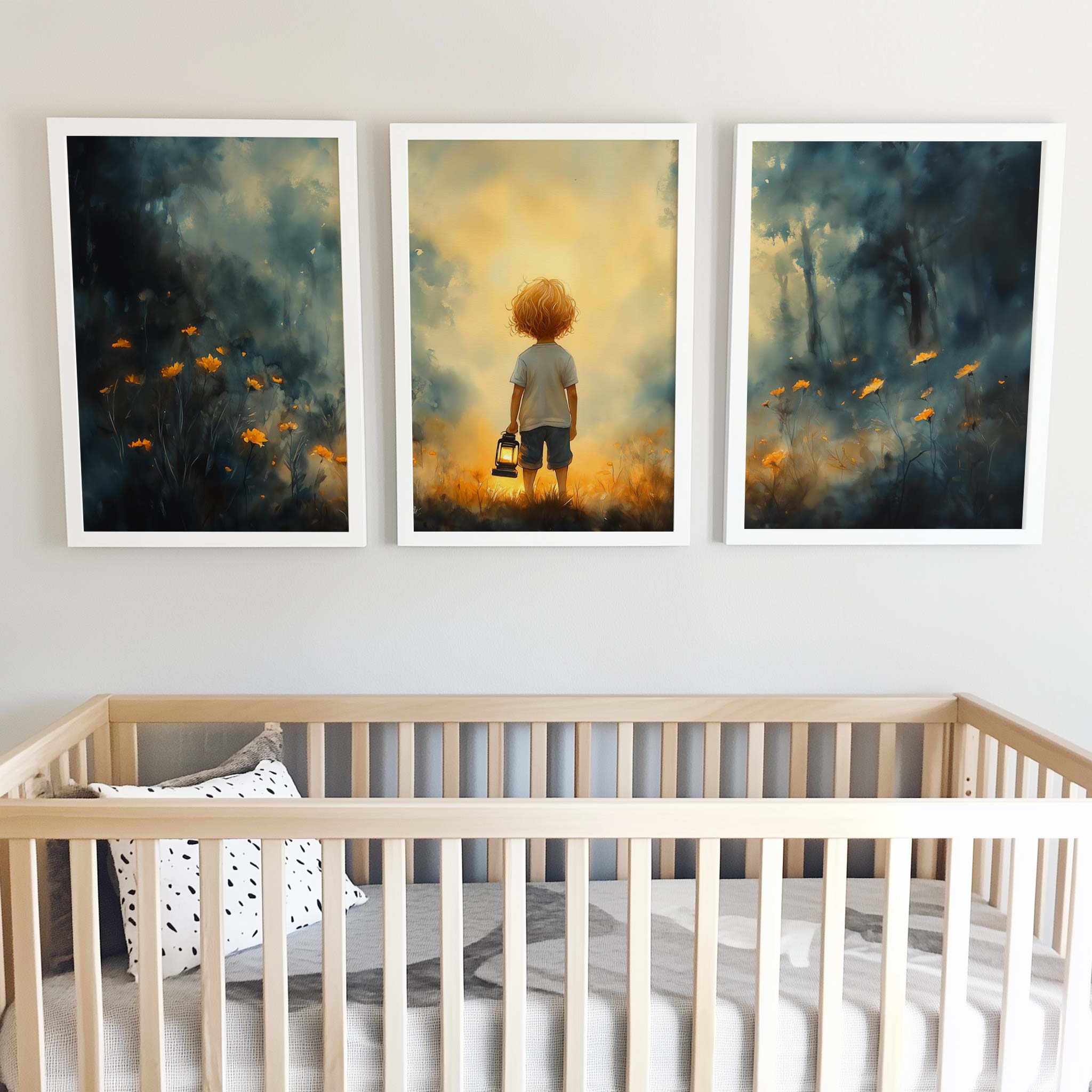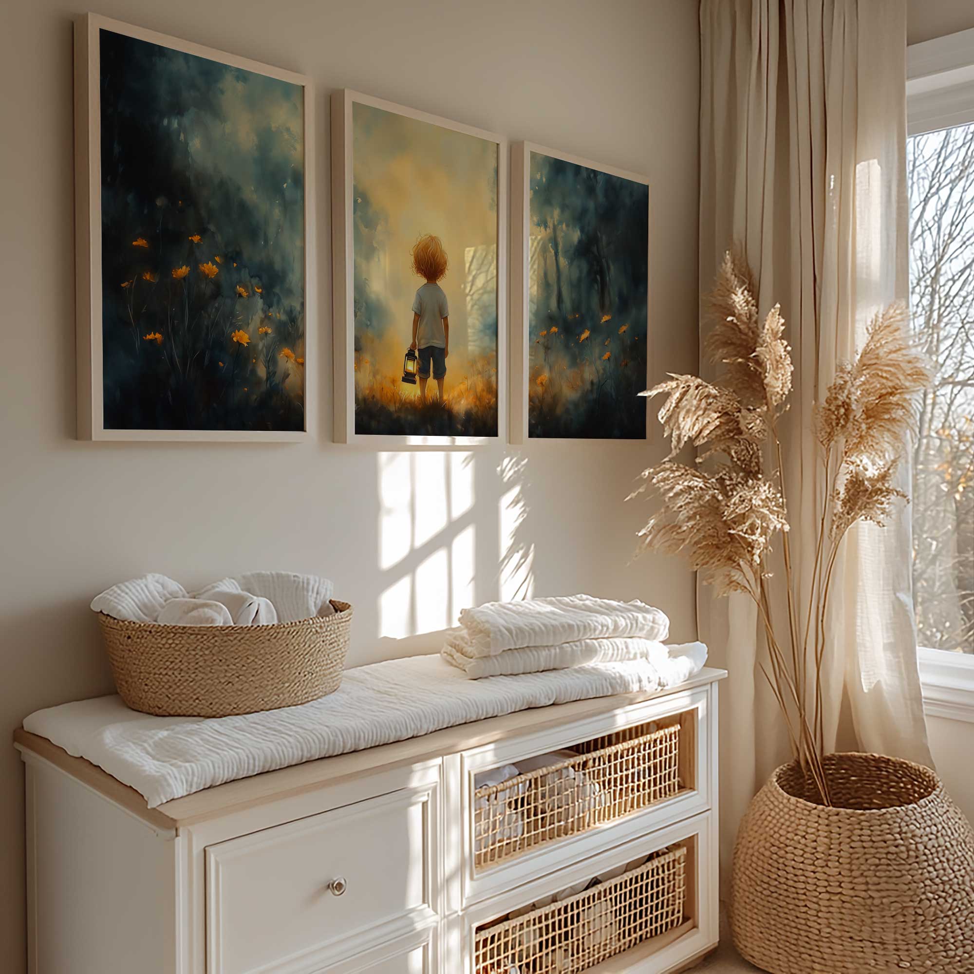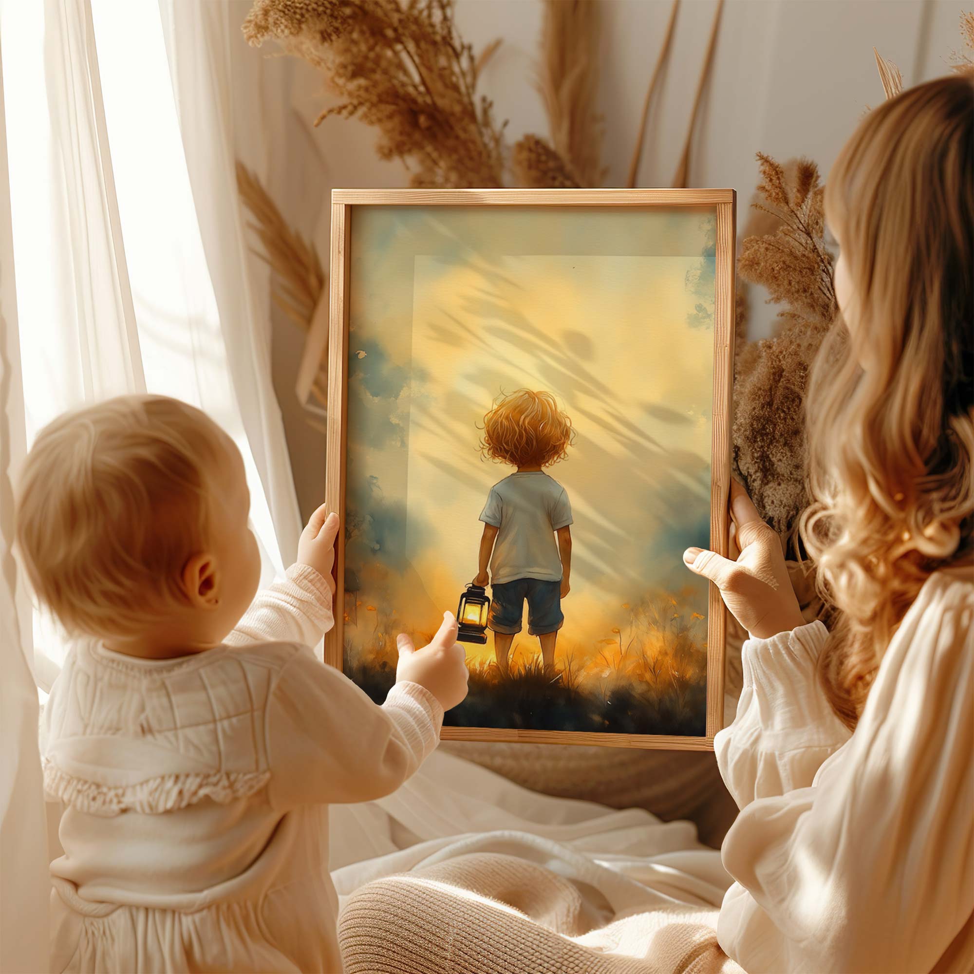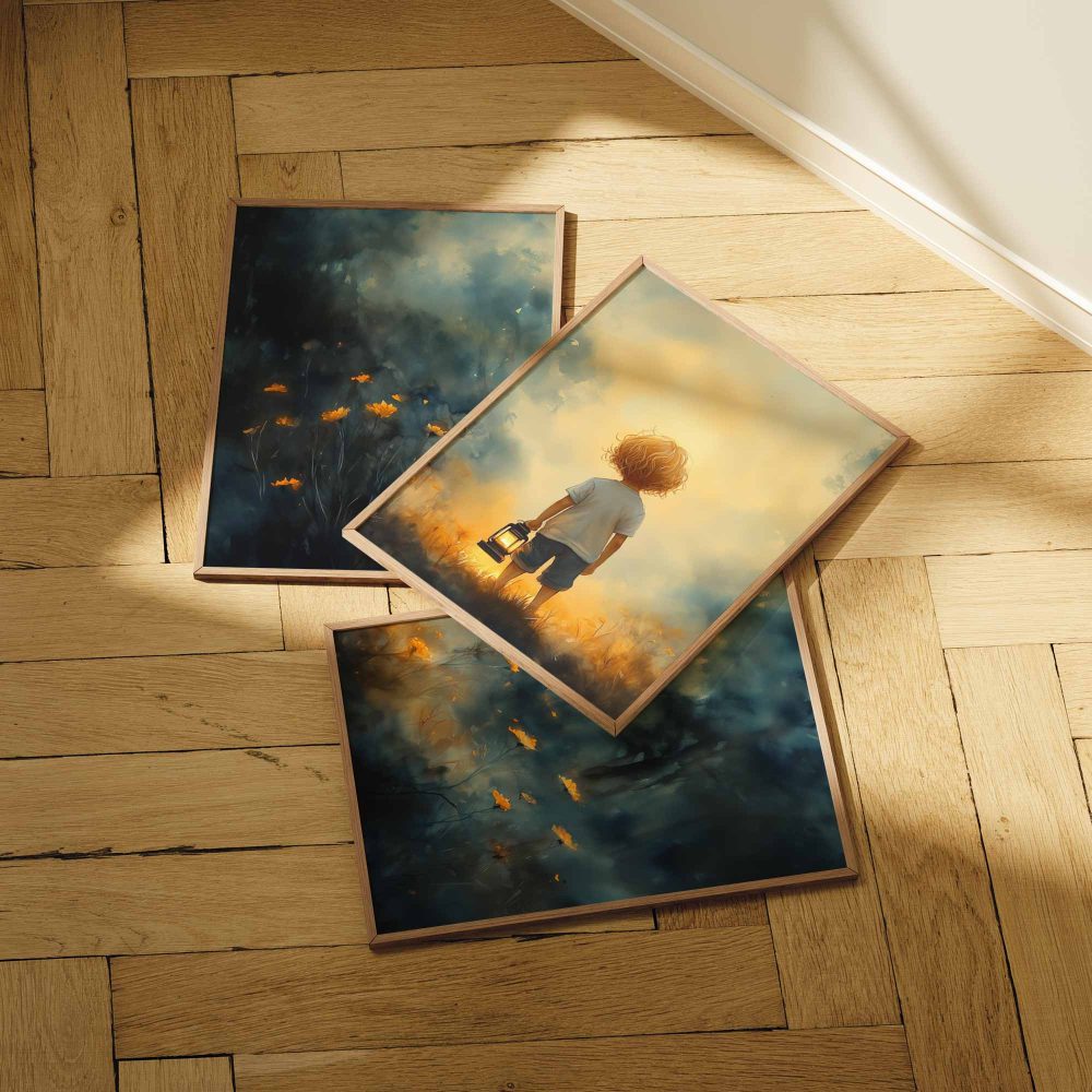 Terug naar collectie / Kinderkamer posters / Bloemen posters / Jongen met lantaarn in betoverend bloemenveld