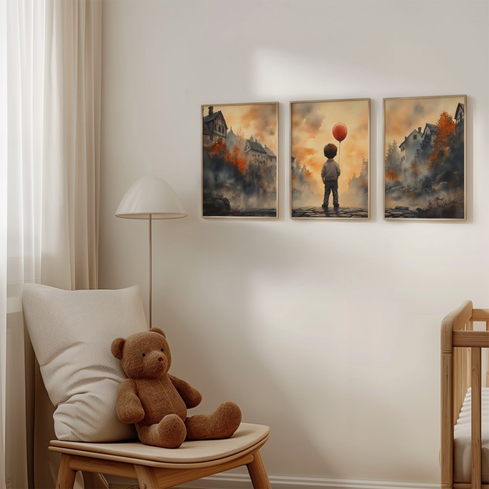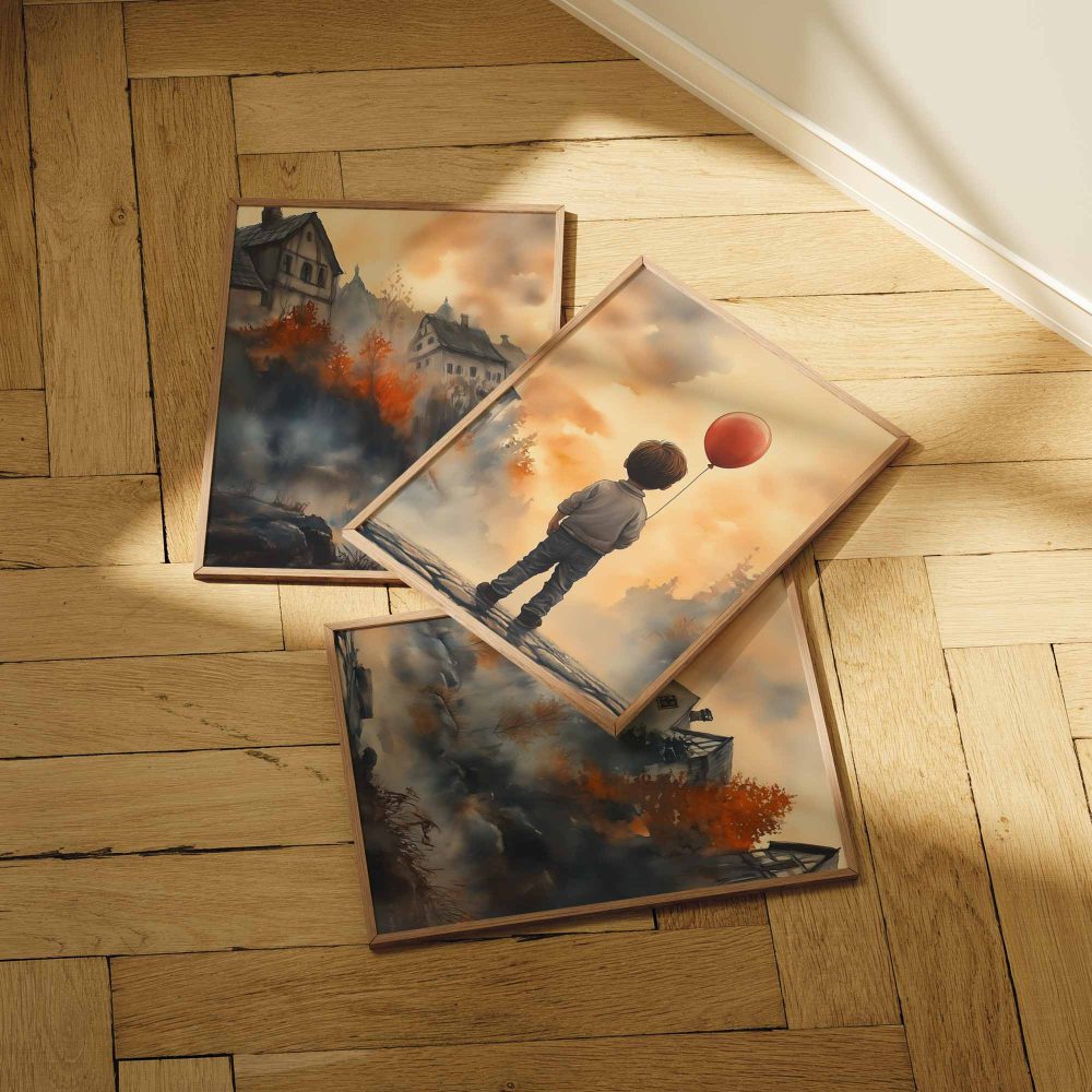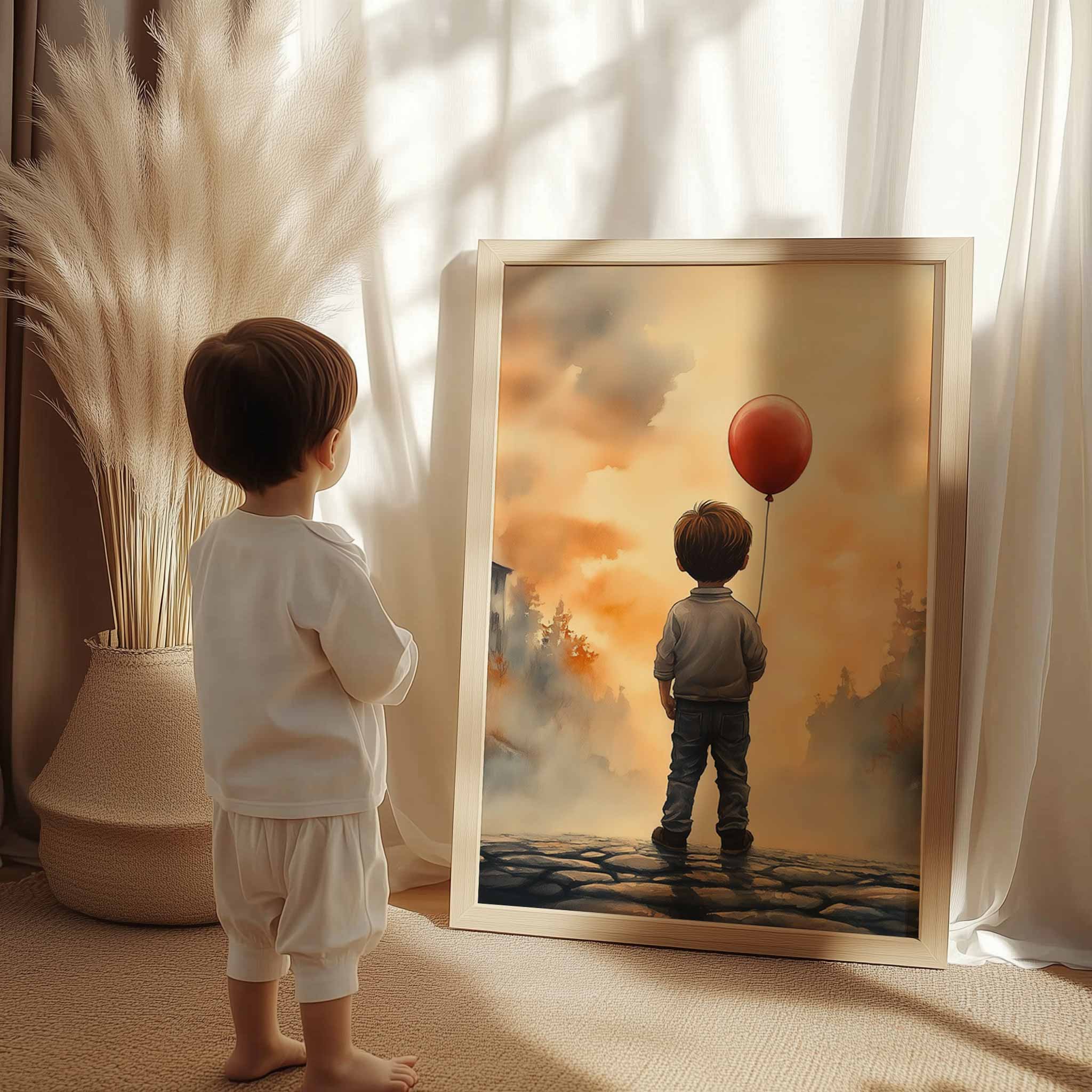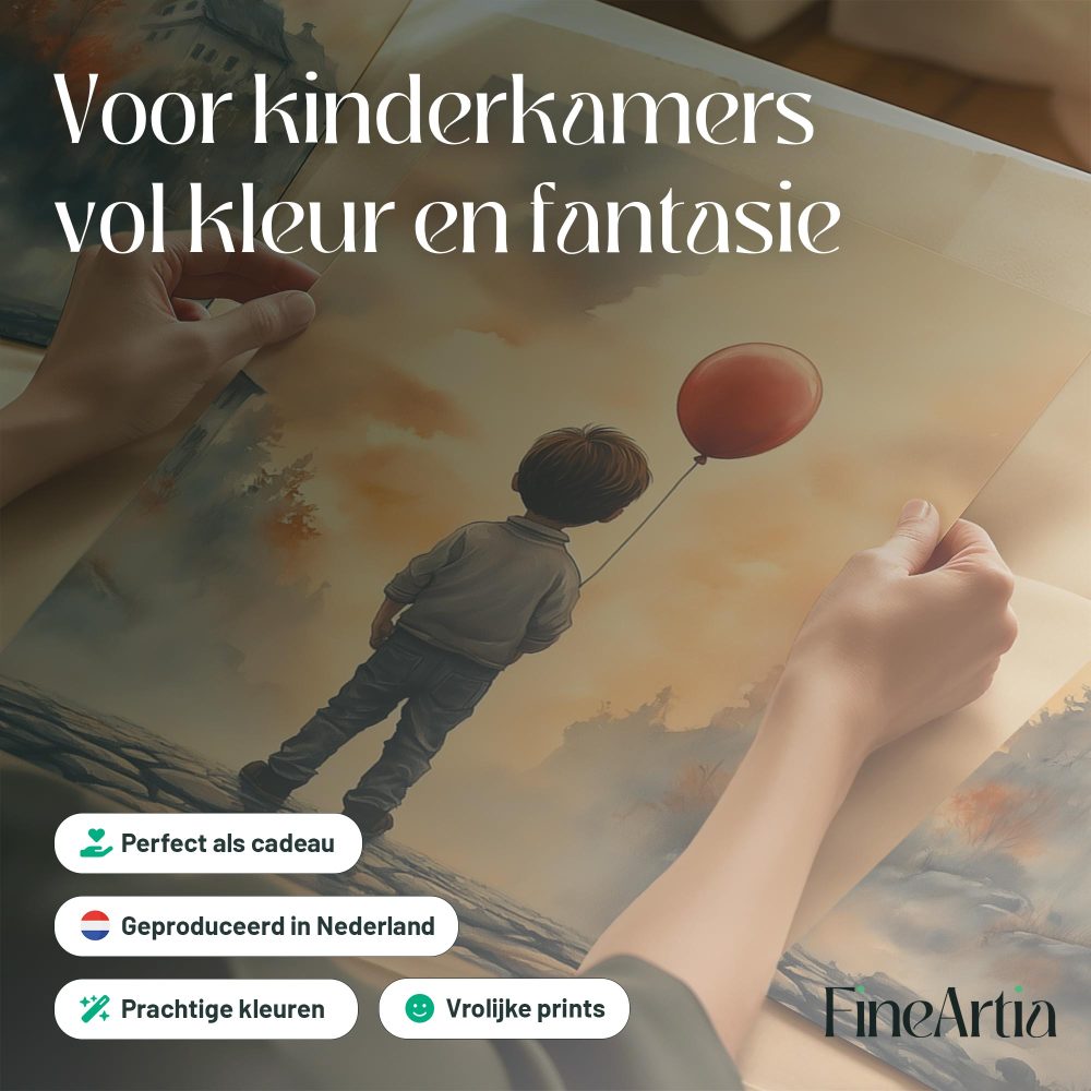 Terug naar collectie / Kinderkamer posters / Jongen met rode ballon in warm dorpstafereel